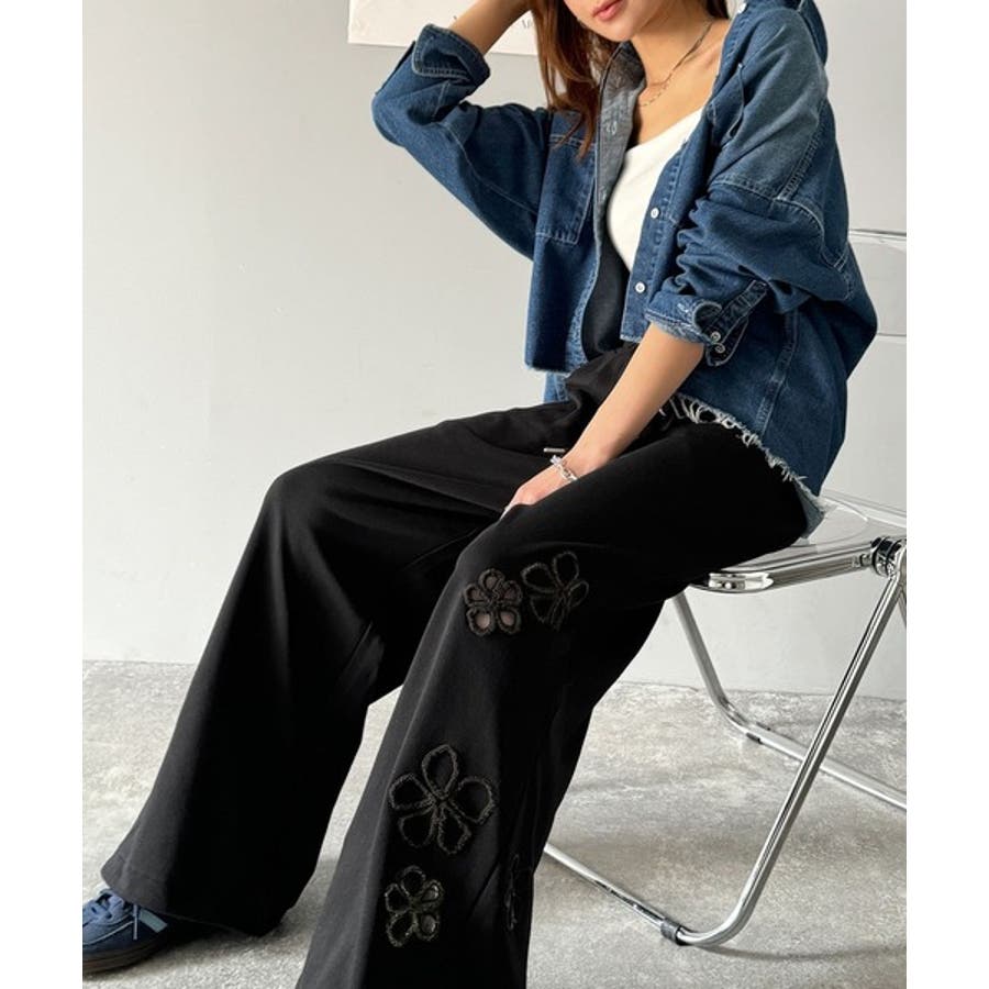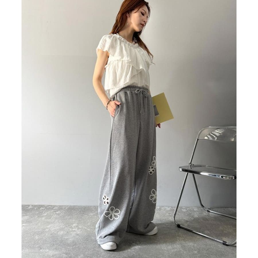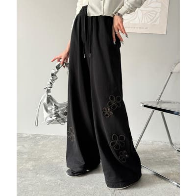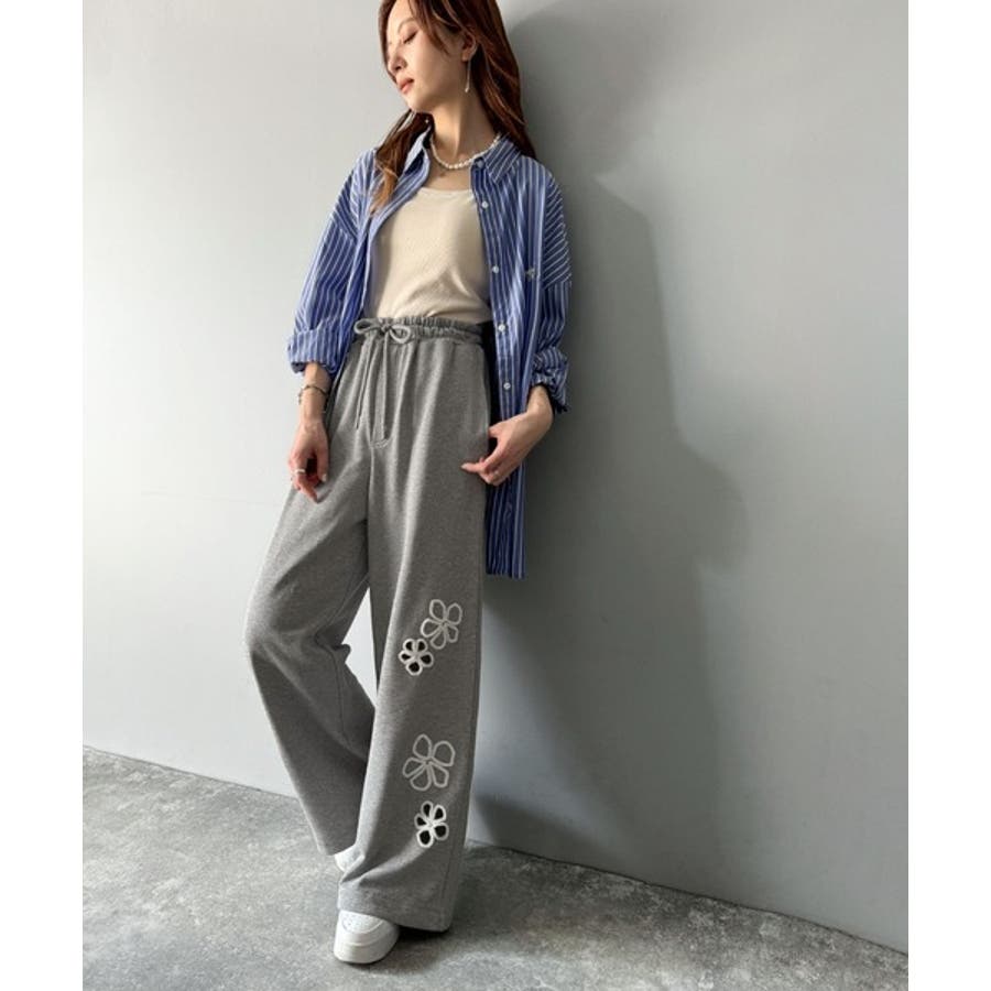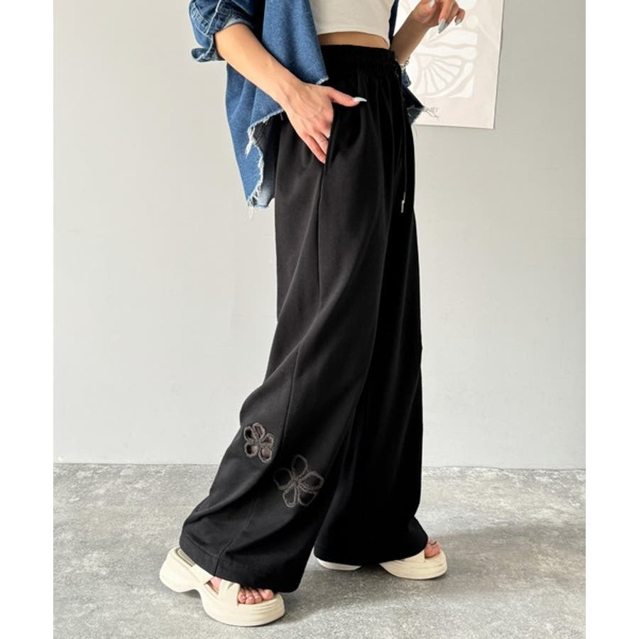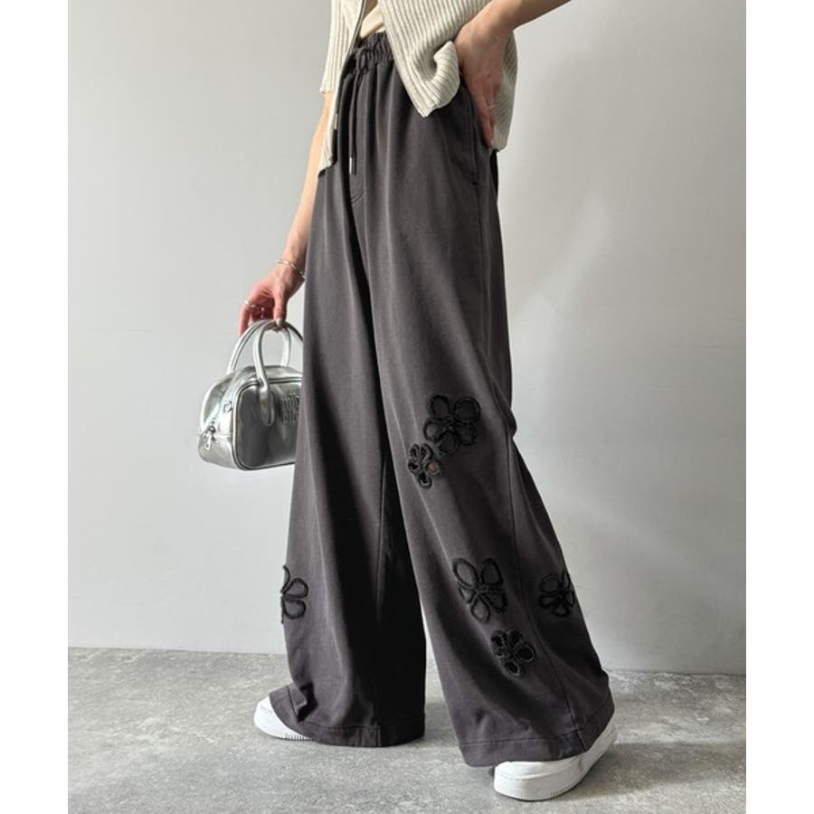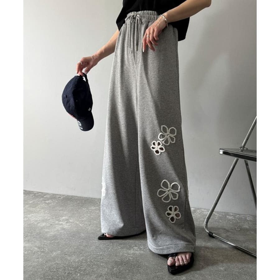 大人の遊び心が光る。フラワーサガラ刺繍くり抜き裏毛スウェットワイドパンツ