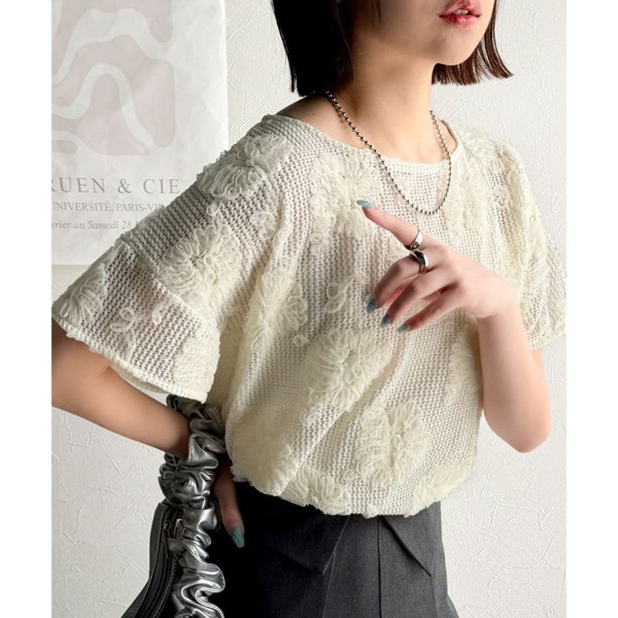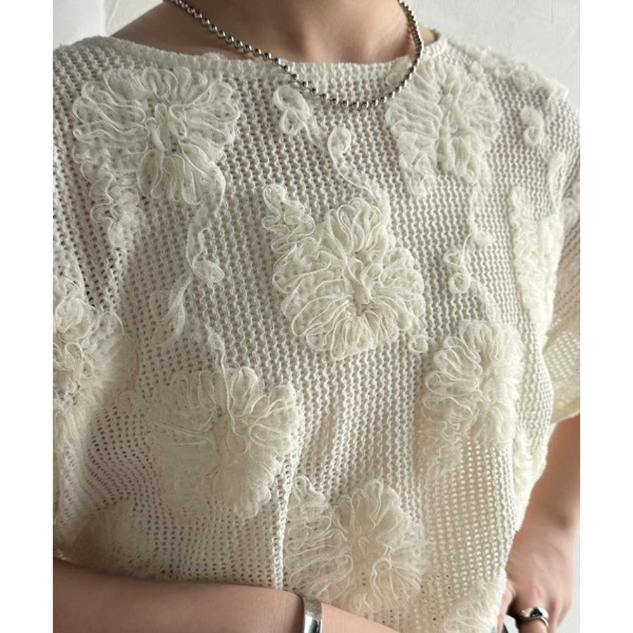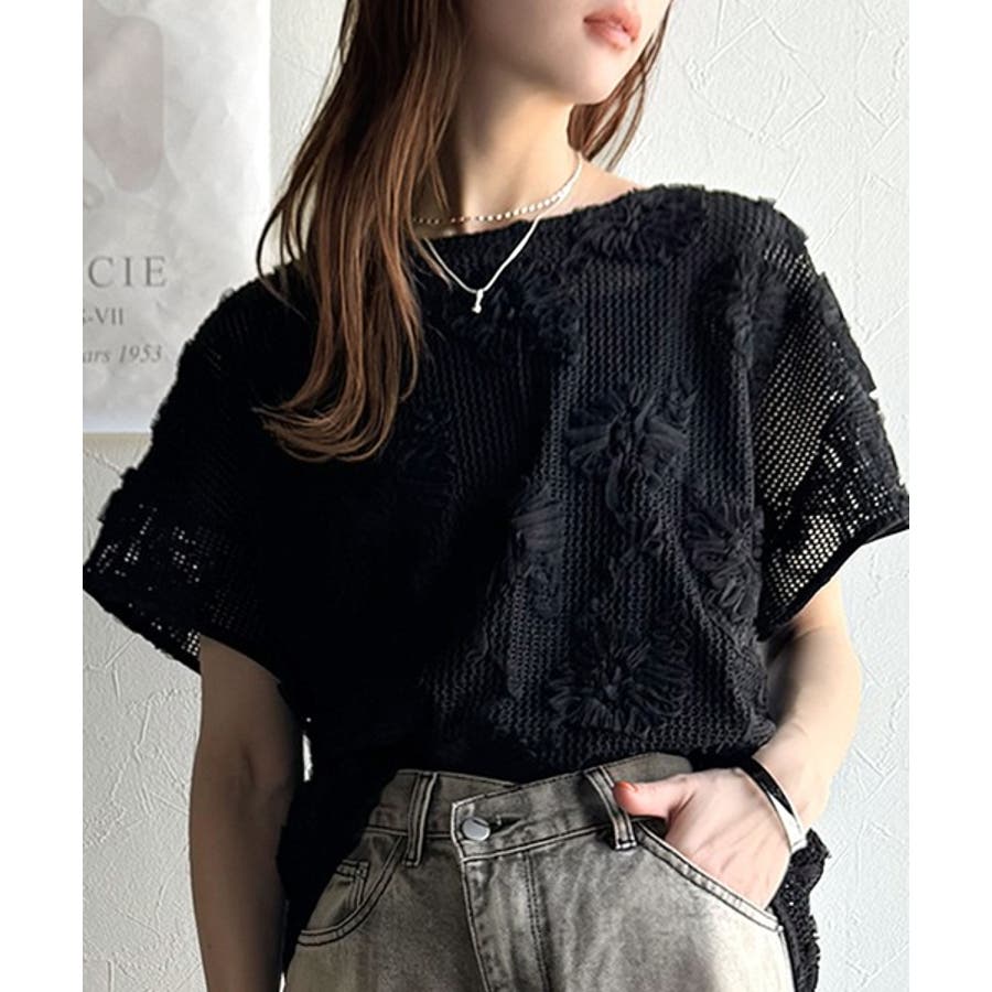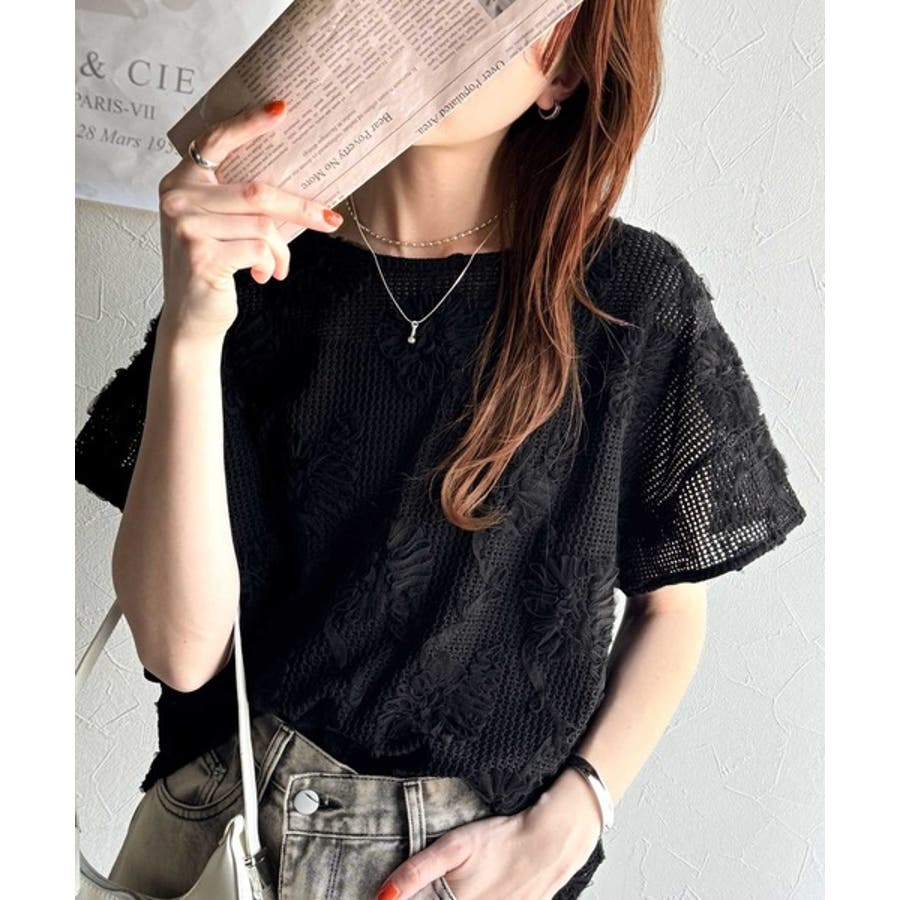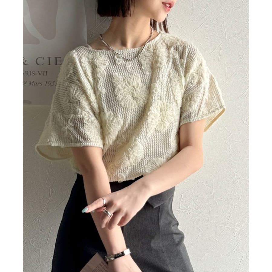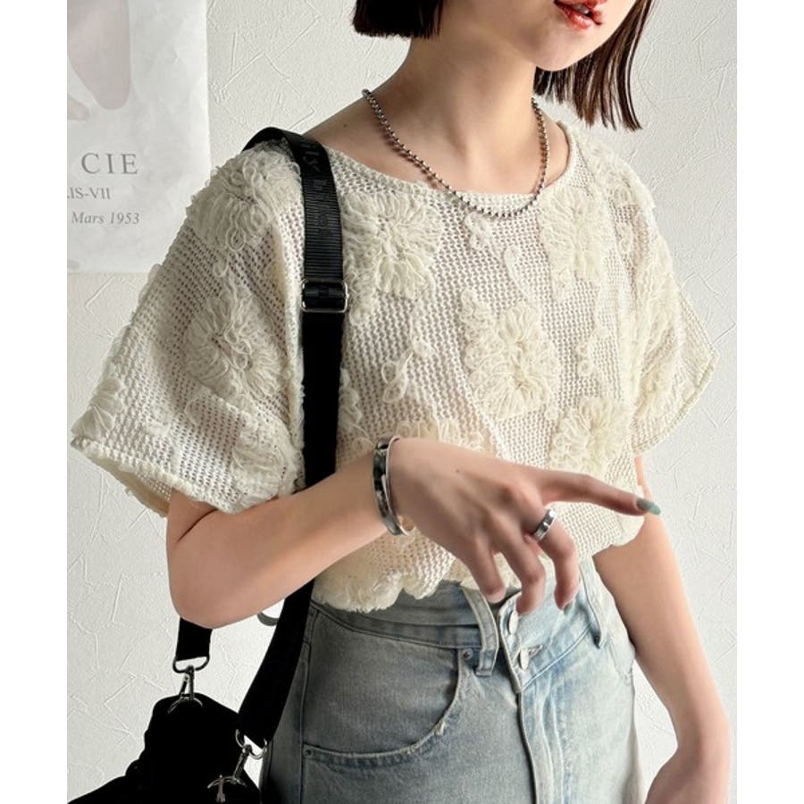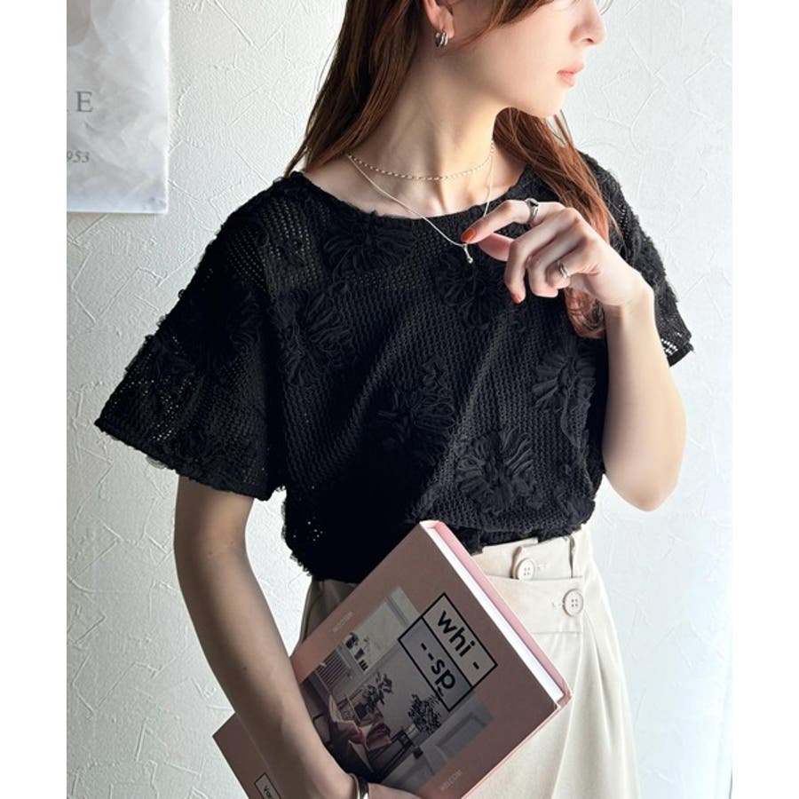 大人のおしゃれ度ワンランクアップ。チュールフラワーコード刺繍半袖Tシャツ