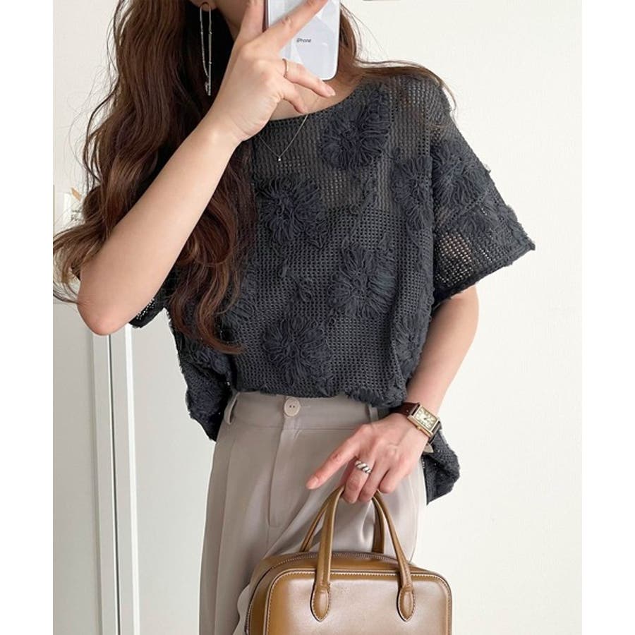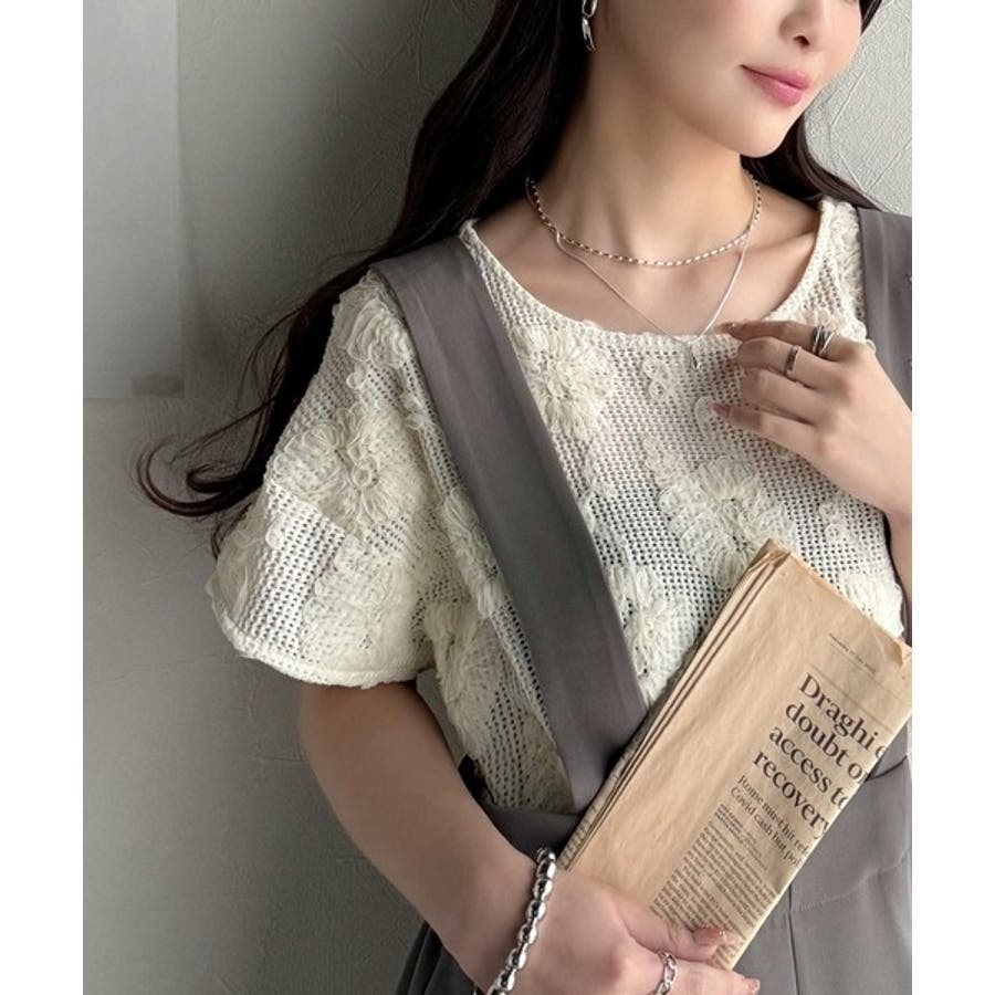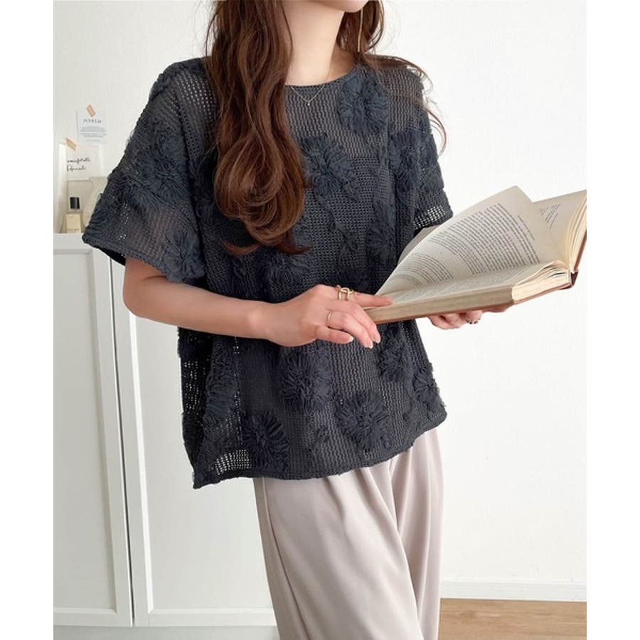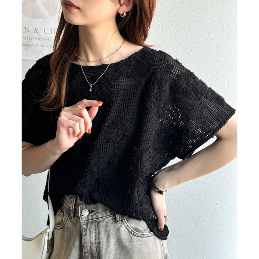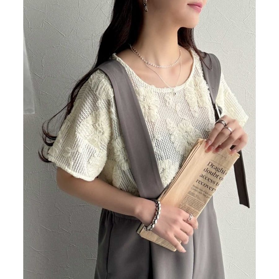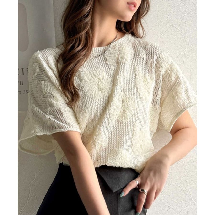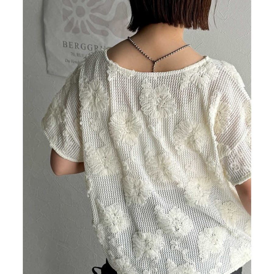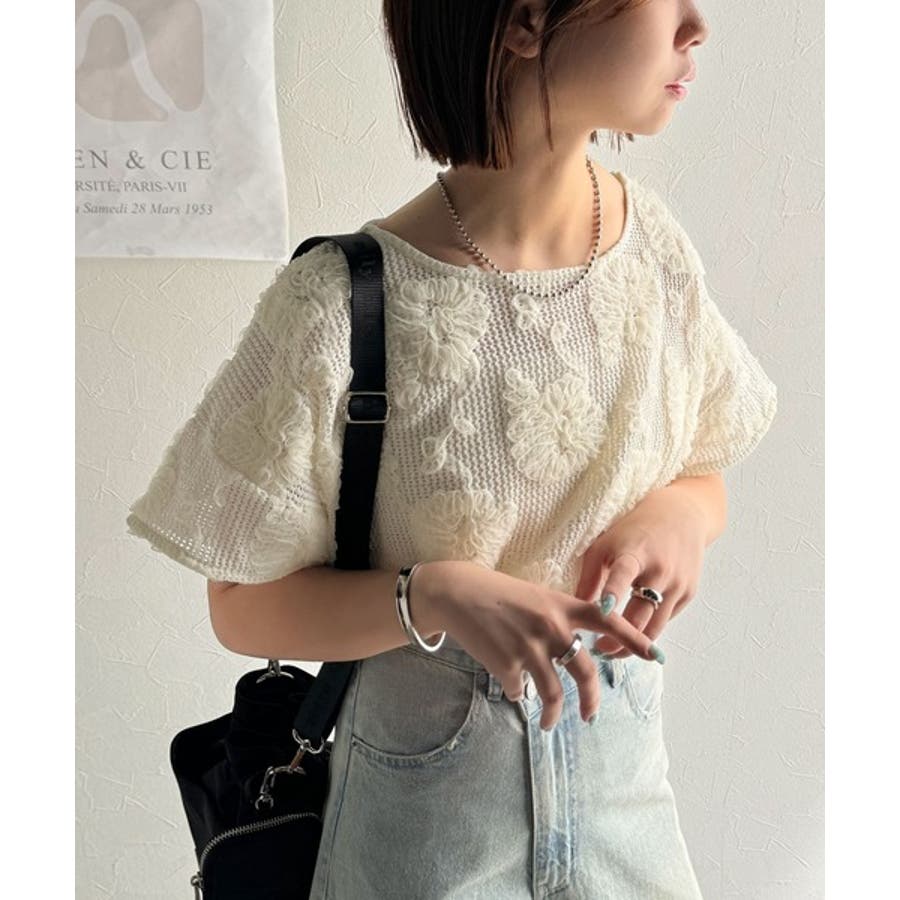 大人のおしゃれ度ワンランクアップ。チュールフラワーコード刺繍半袖Tシャツ