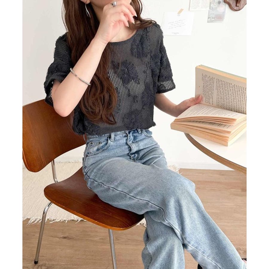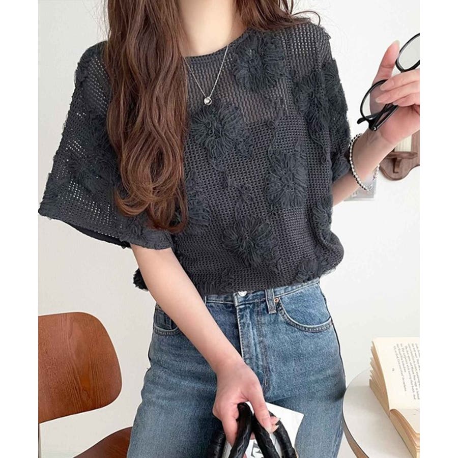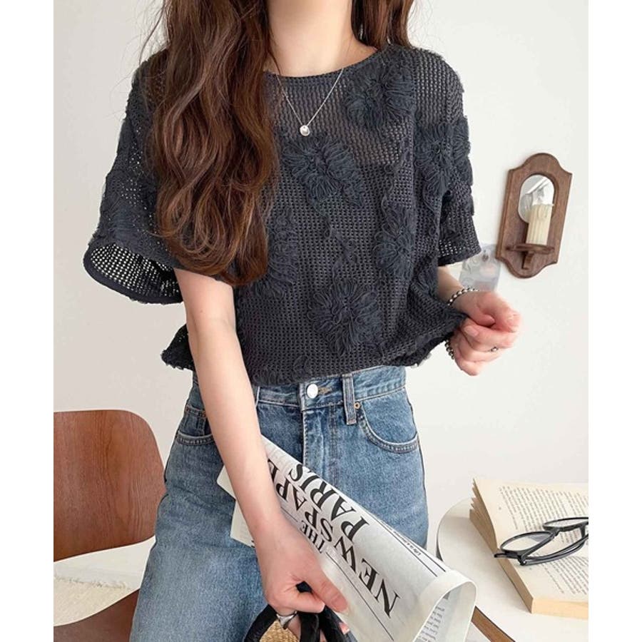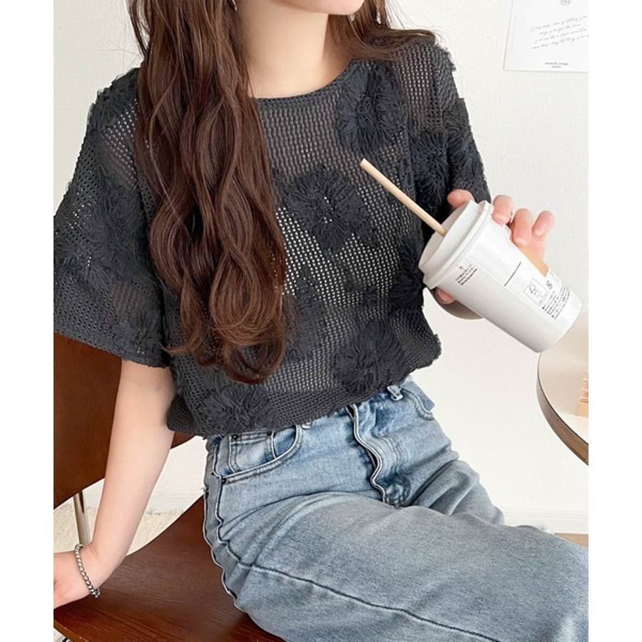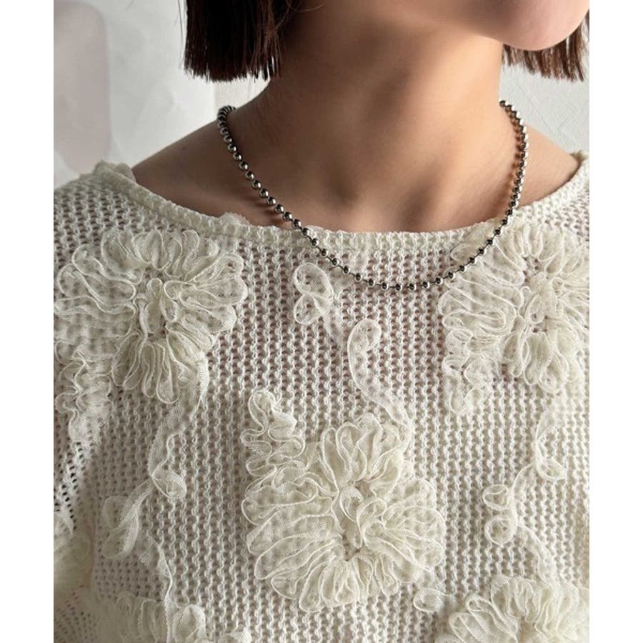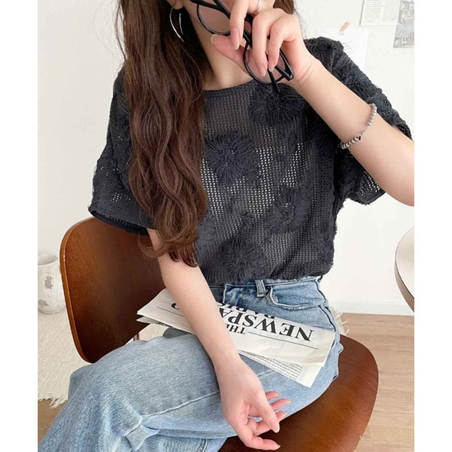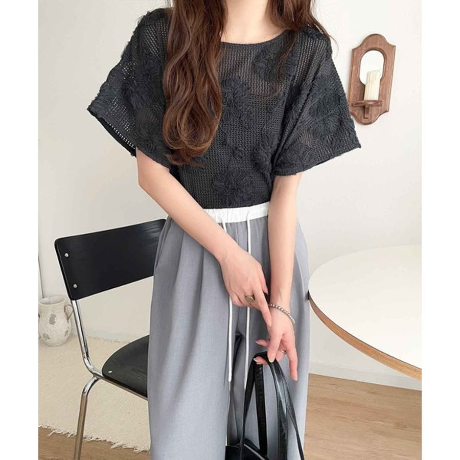 大人のおしゃれ度ワンランクアップ。チュールフラワーコード刺繍半袖Tシャツ