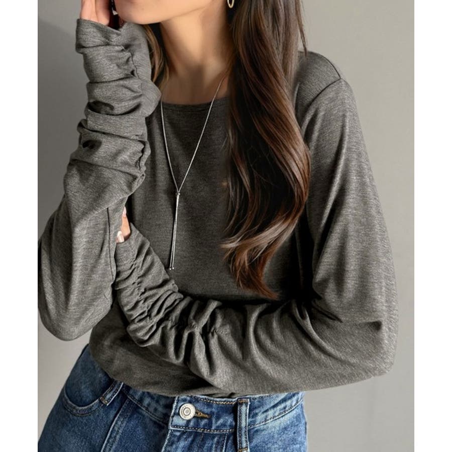 この袖シャーリングボートネックプルオーバーは、トレンドを押さえつつも、日常のコーディネートに自然に溶け込むアイテム。