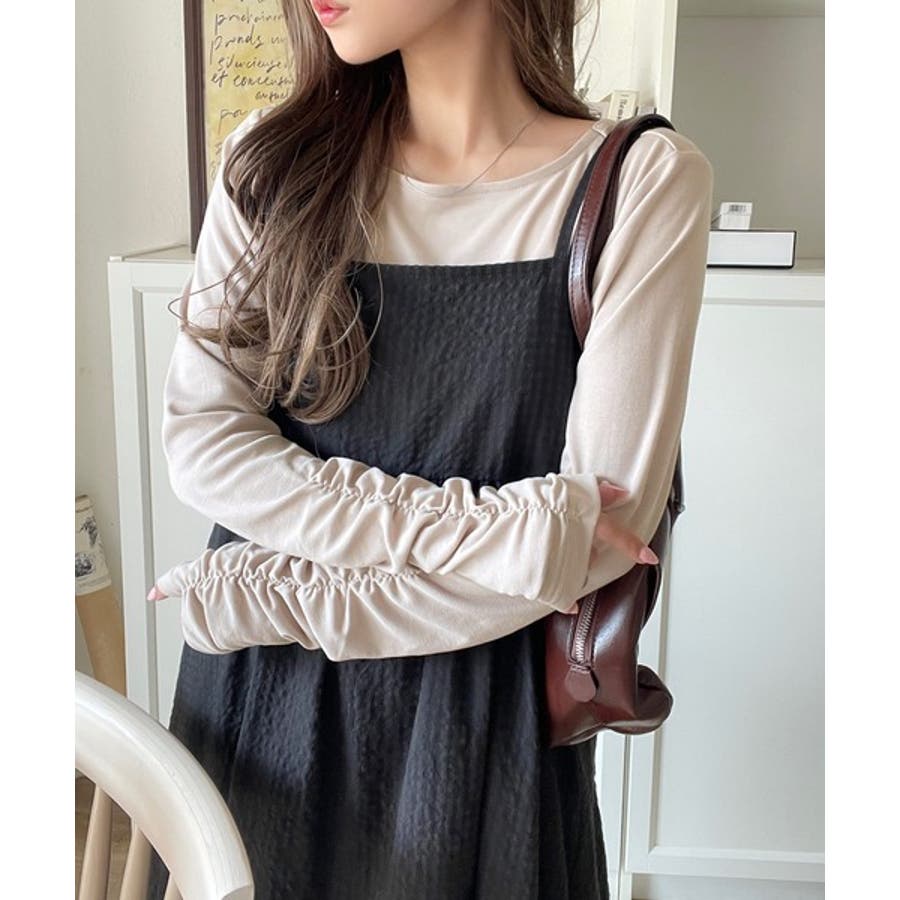 サロペットやキャミワンピースのインナーに合わせたレイヤードスタイルにも使えて