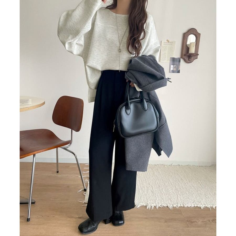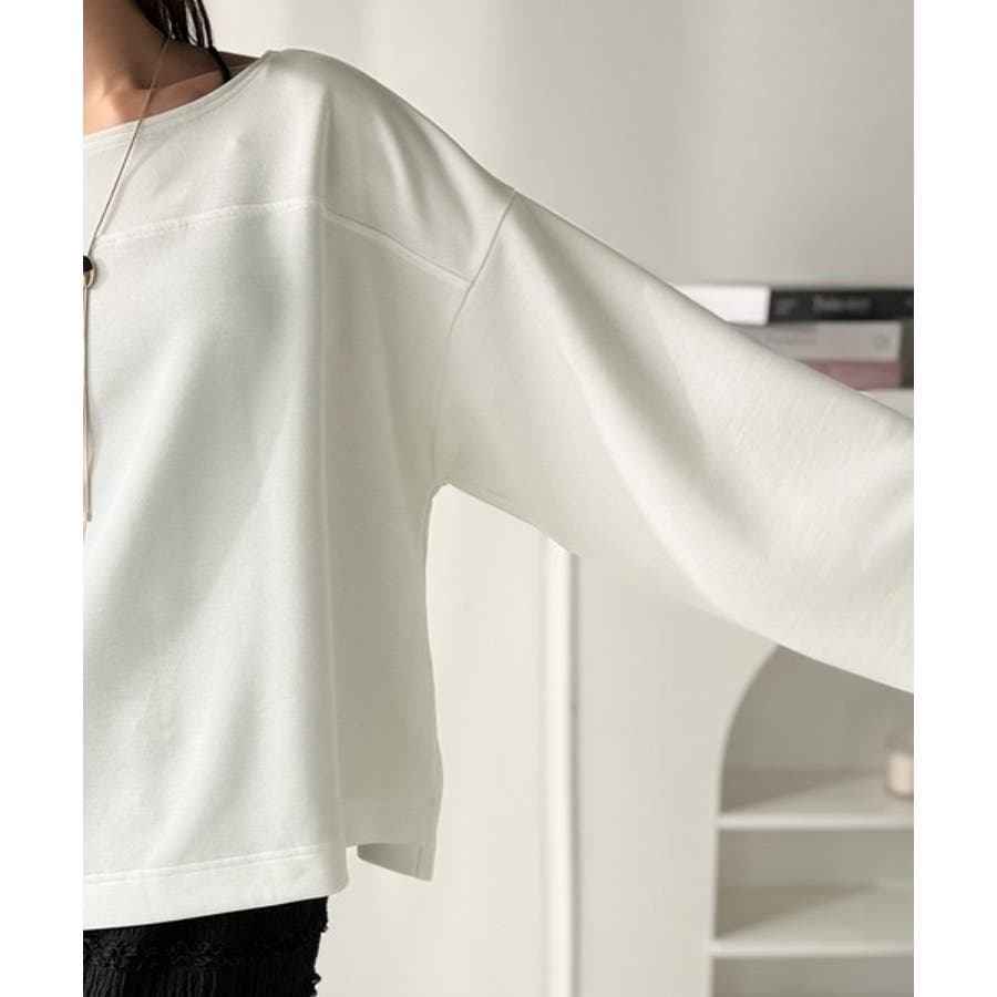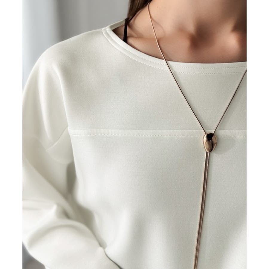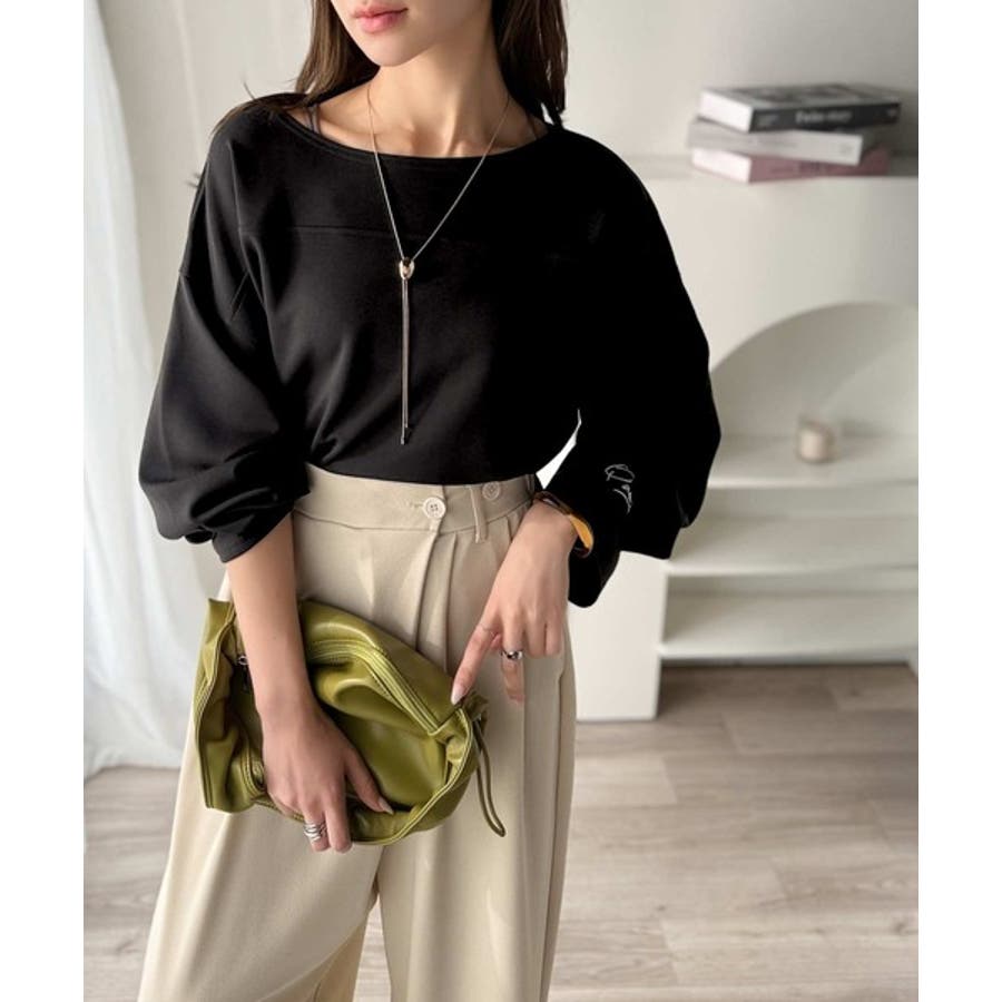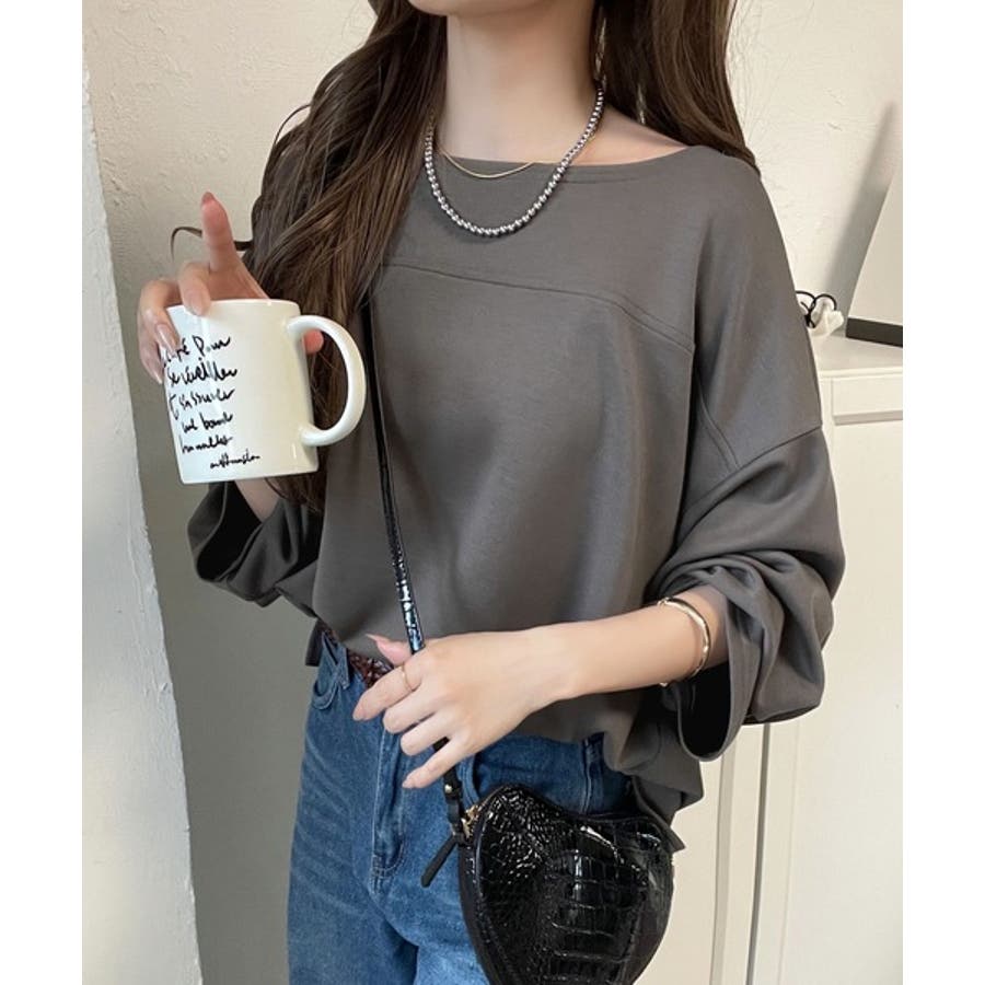 緩やかなシルエットのボートネックでカジュアルになりすぎず、上品な印象をプラス。