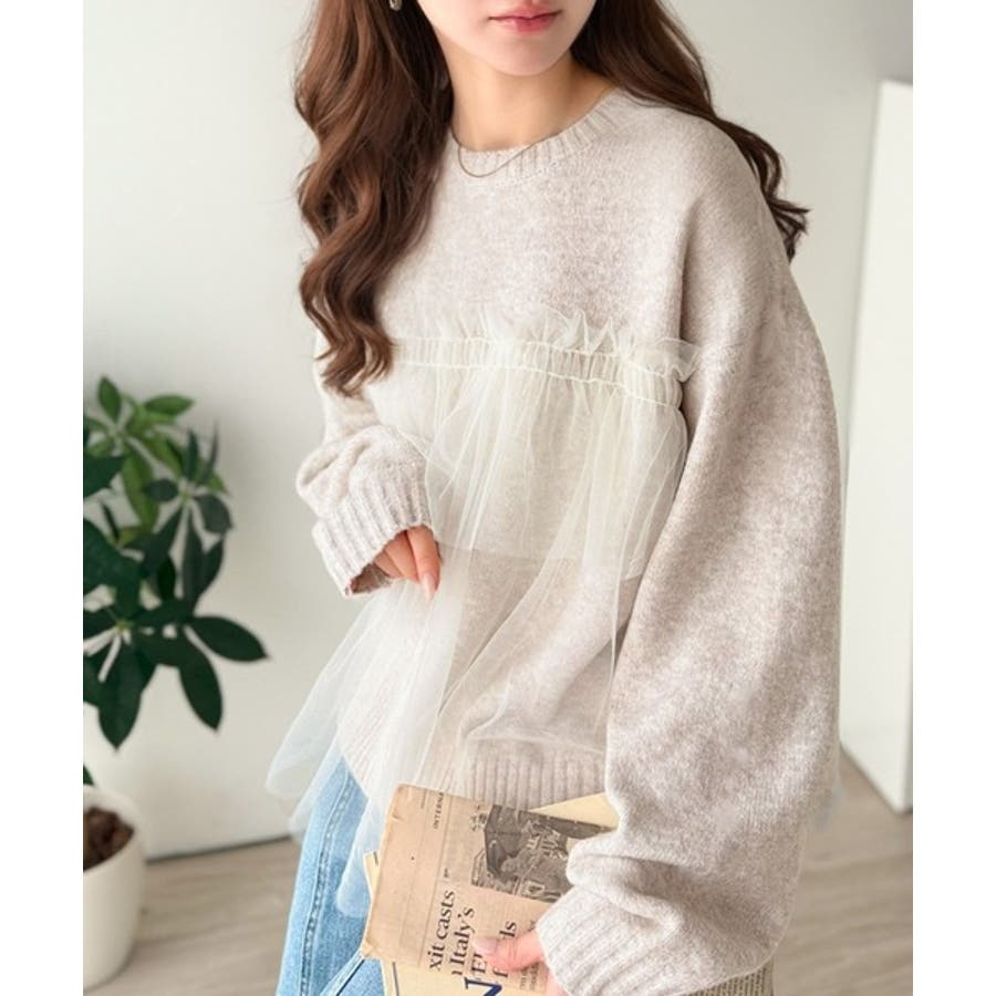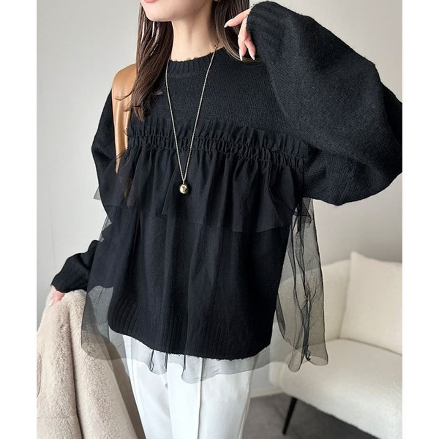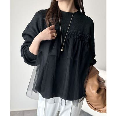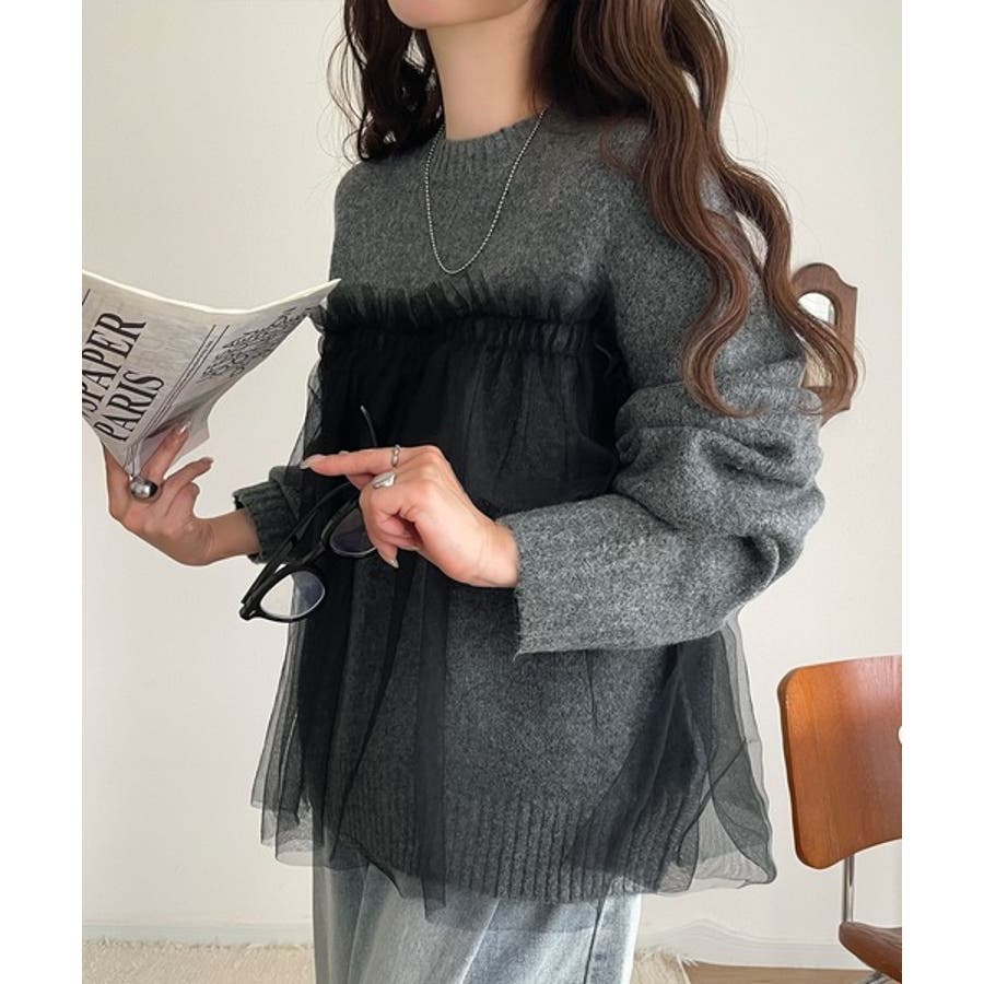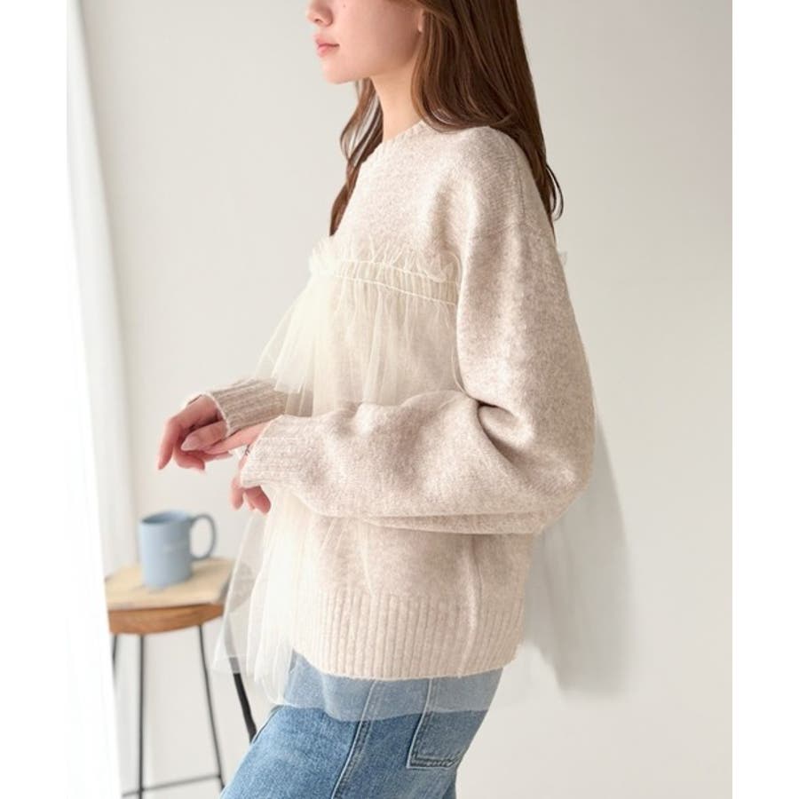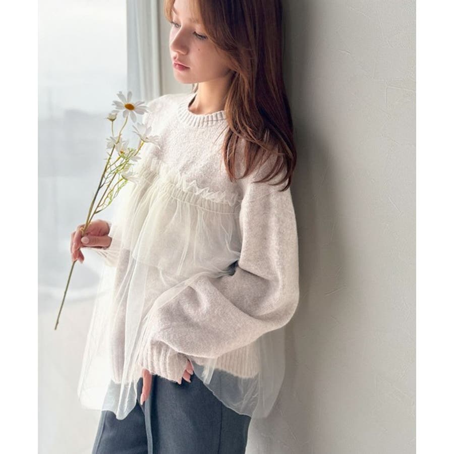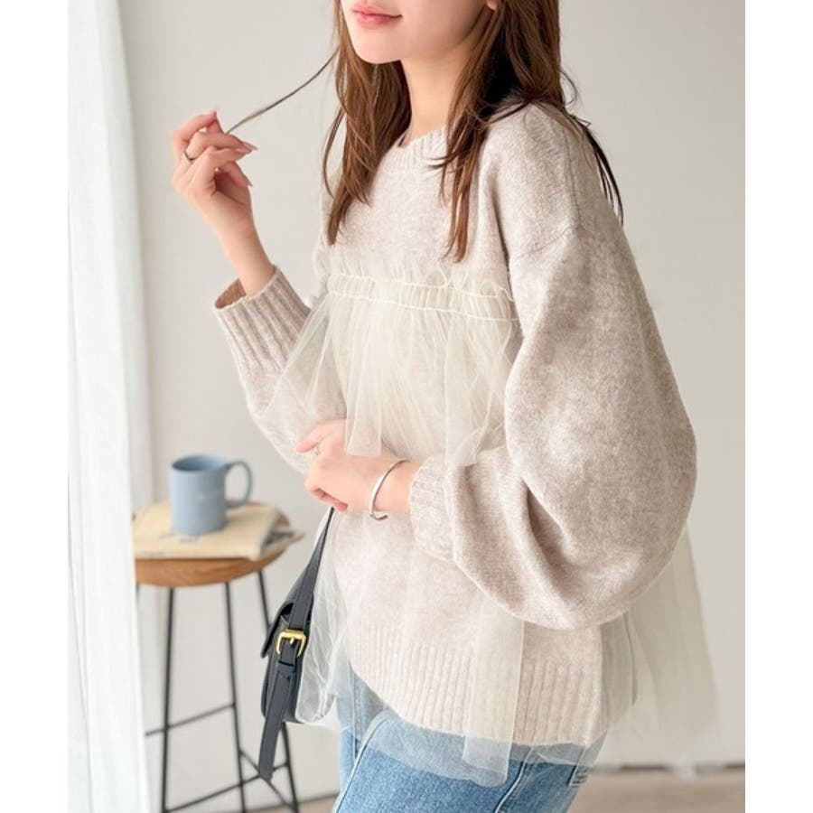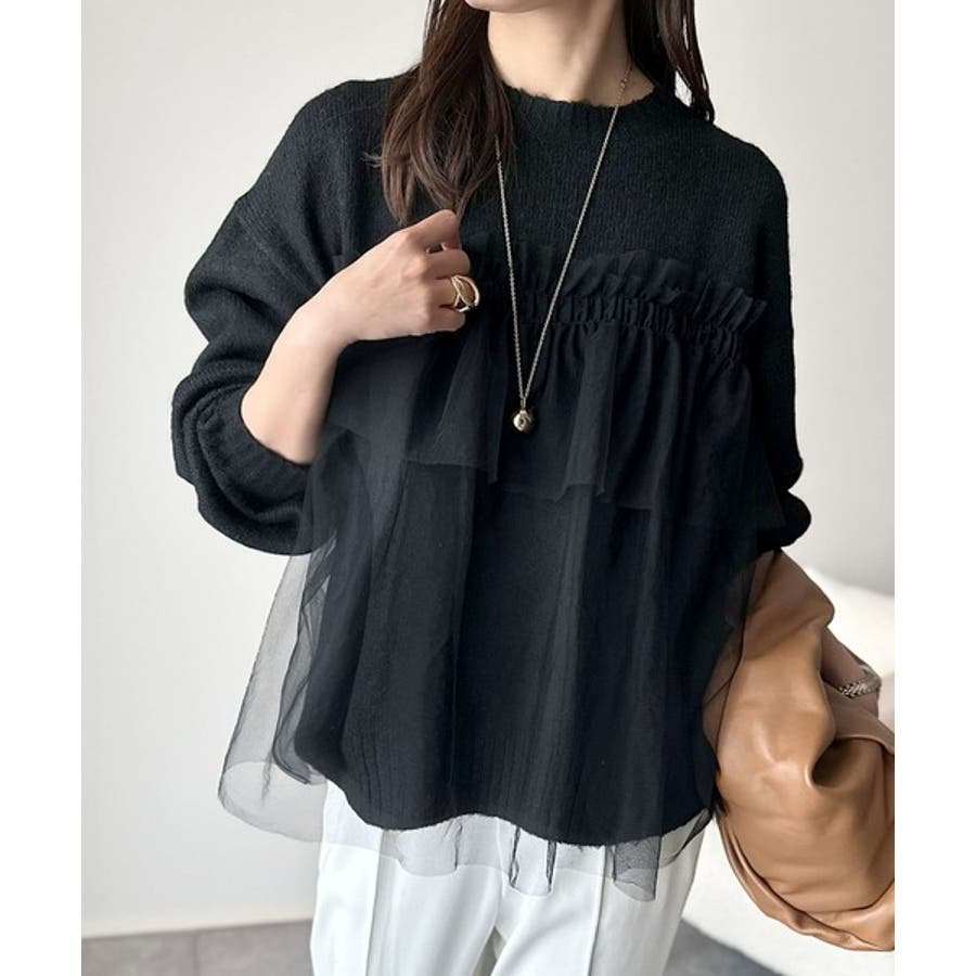 チュール素材をドッキングしたニットで、甘すぎない大人ガーリーな印象を演出。