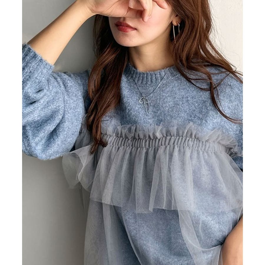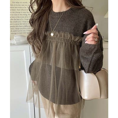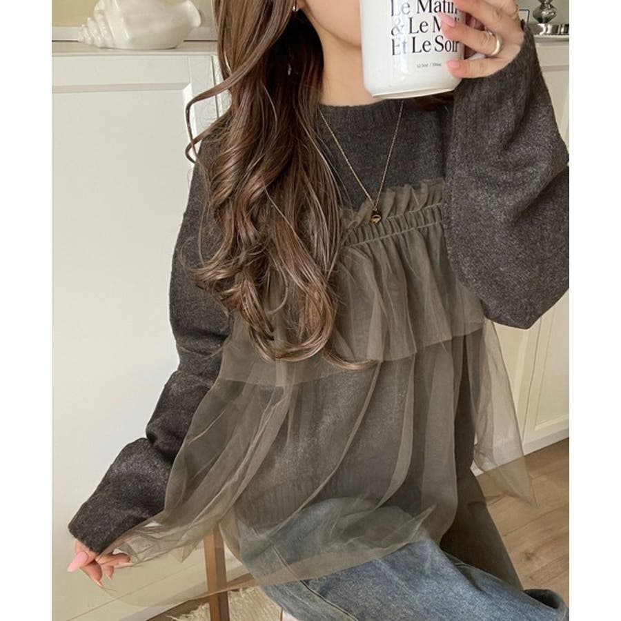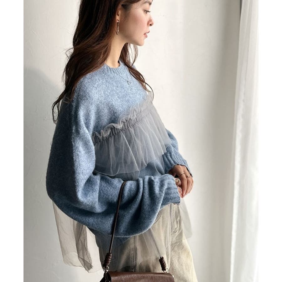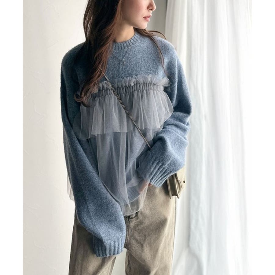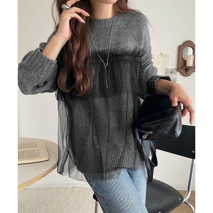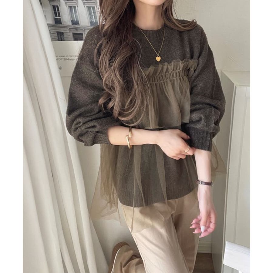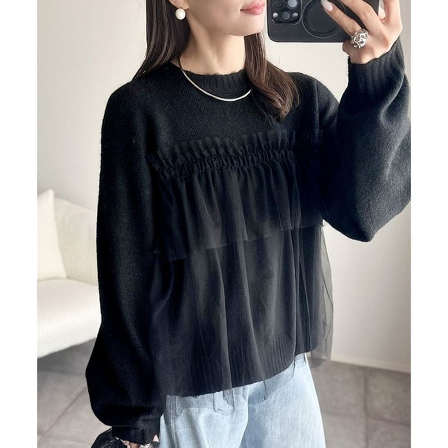 チュール素材をドッキングしたニットで、甘すぎない大人ガーリーな印象を演出。