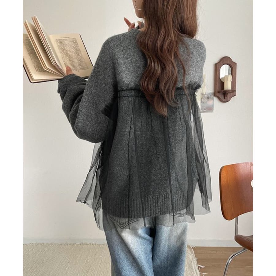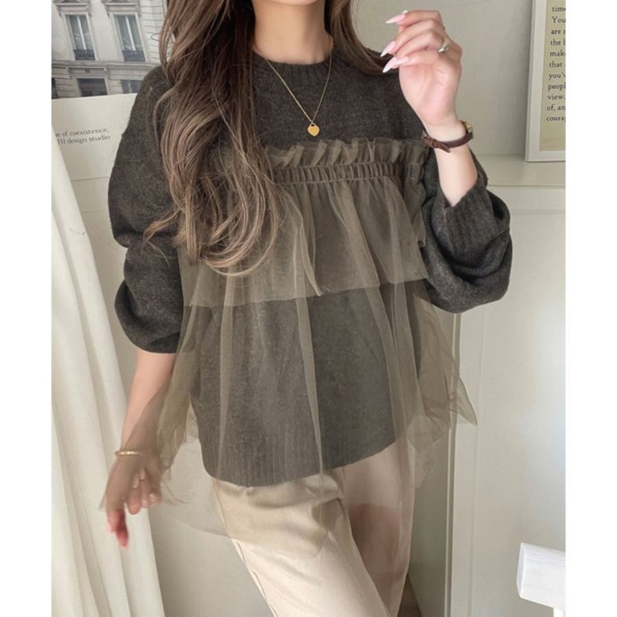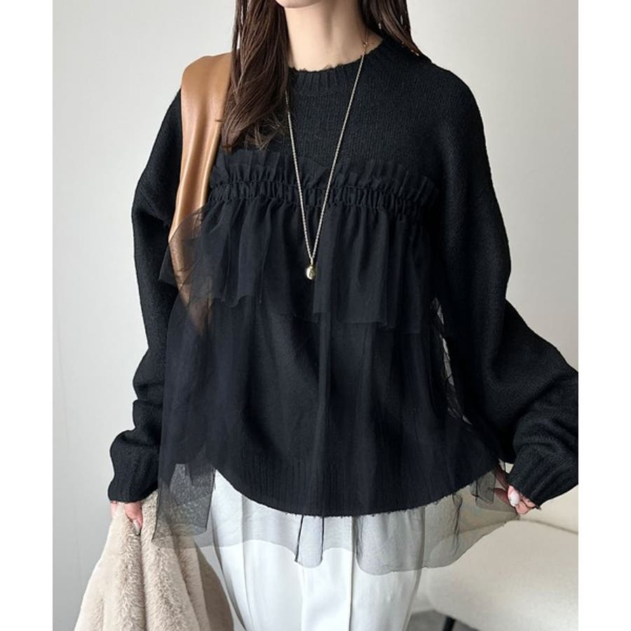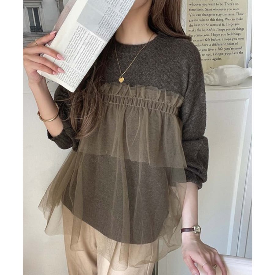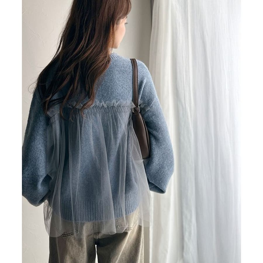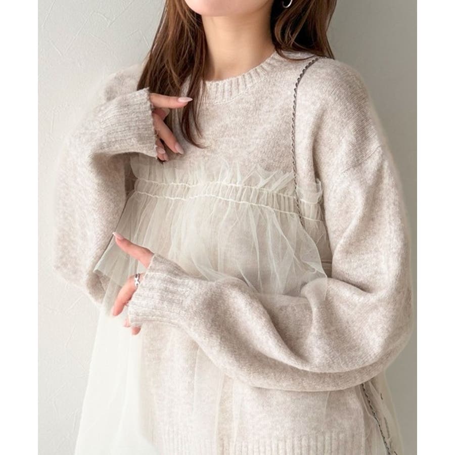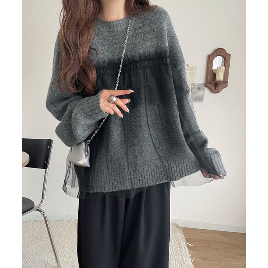 チュール素材をドッキングしたニットで、甘すぎない大人ガーリーな印象を演出。