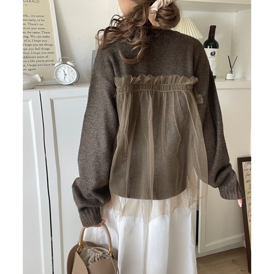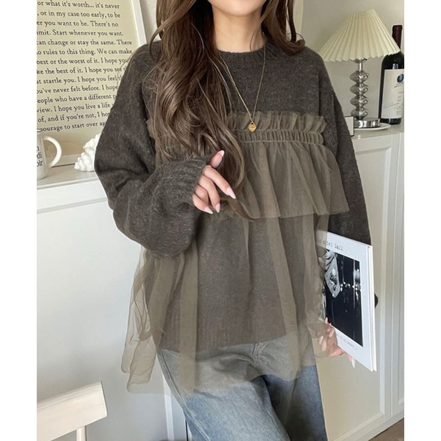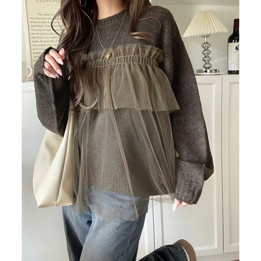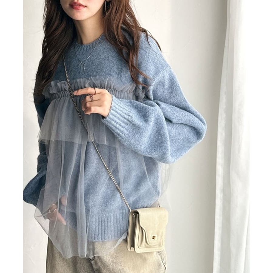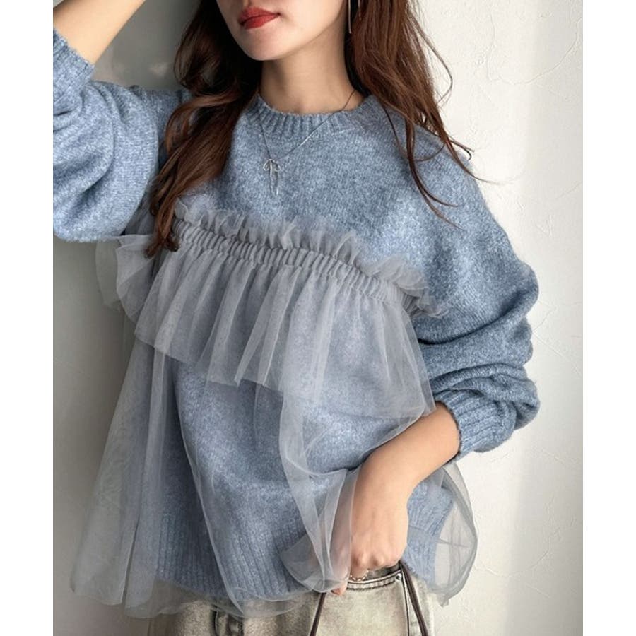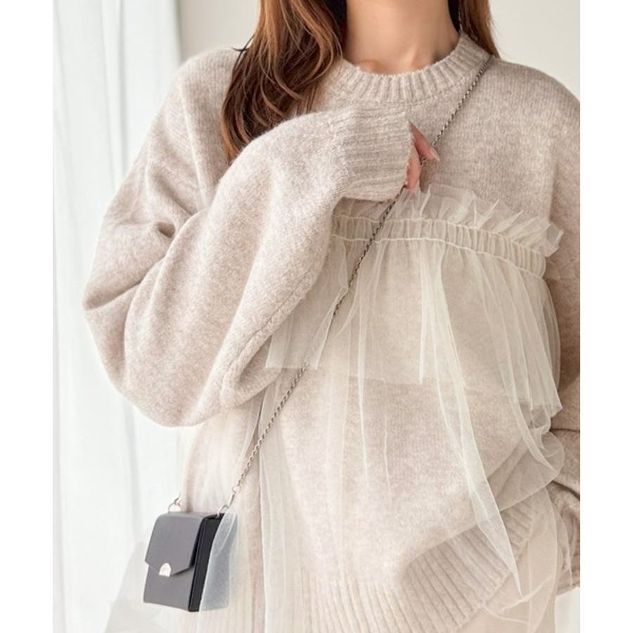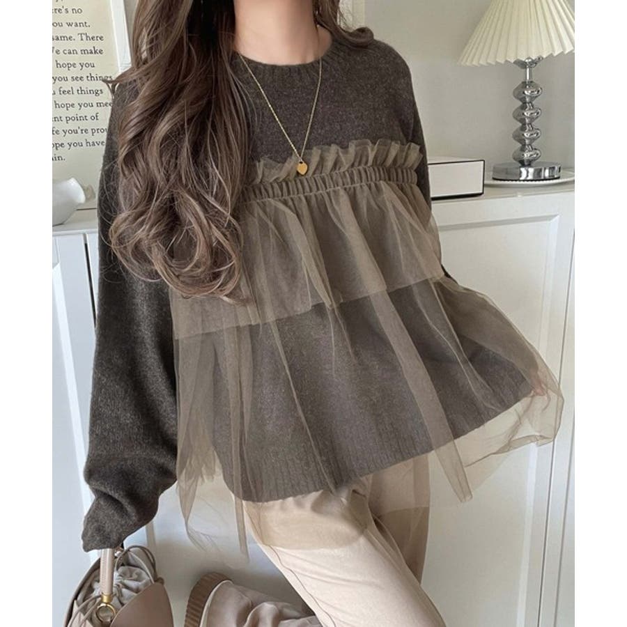 チュール素材をドッキングしたニットで、甘すぎない大人ガーリーな印象を演出。