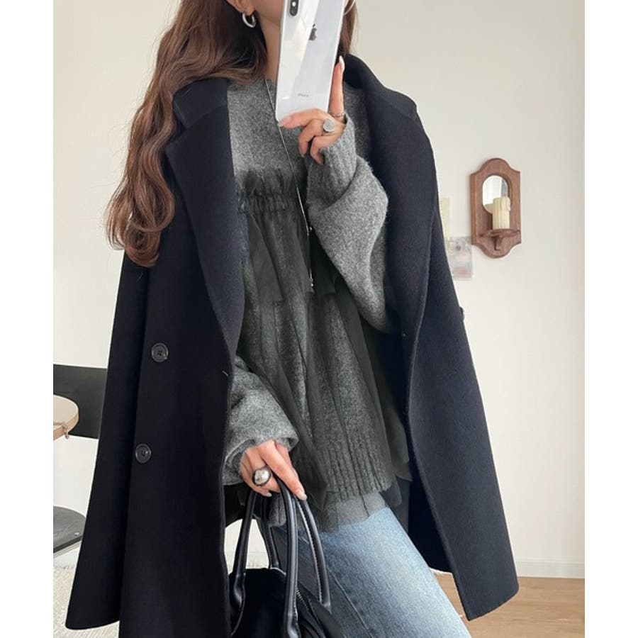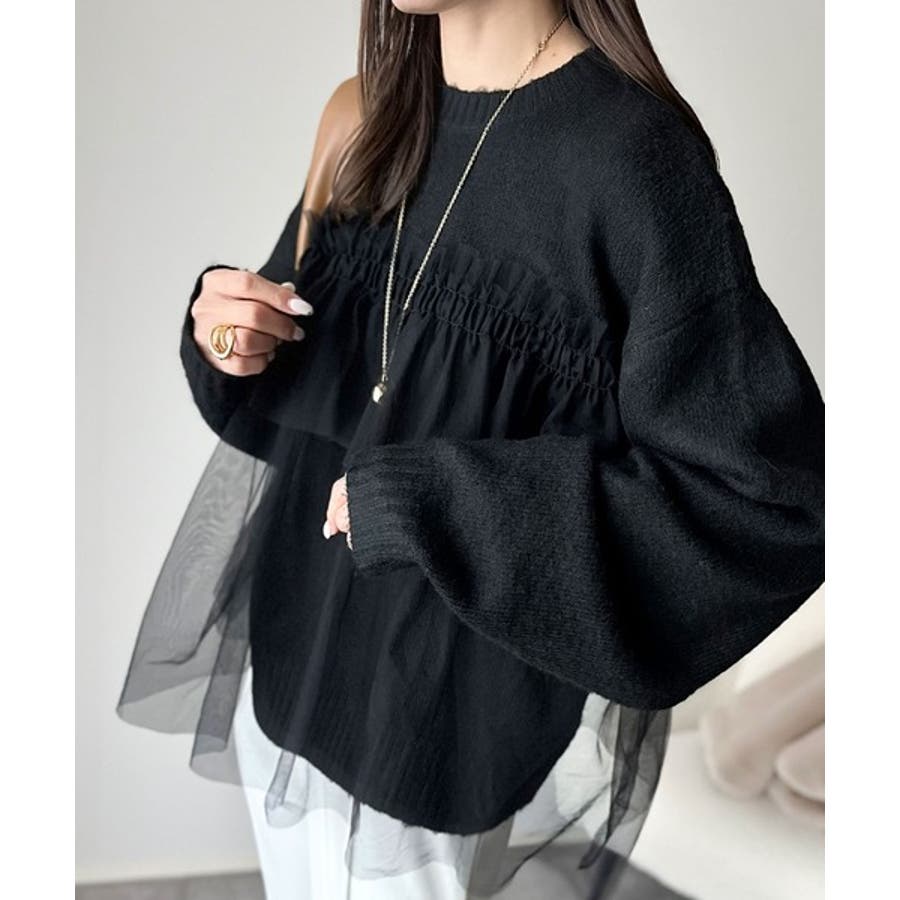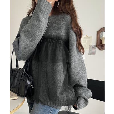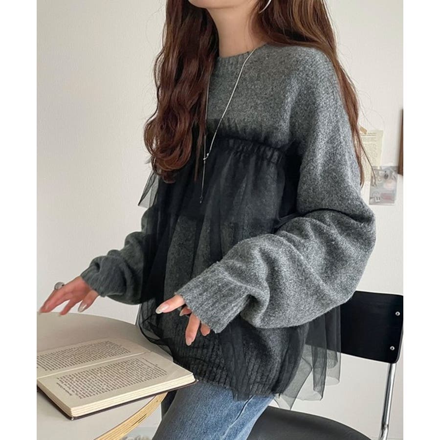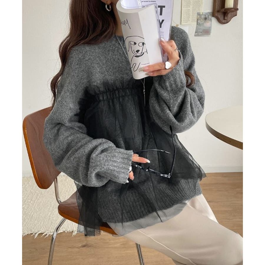 大人の女性にぴったり!チュールドッキングボリュームスリーブニット(長袖)