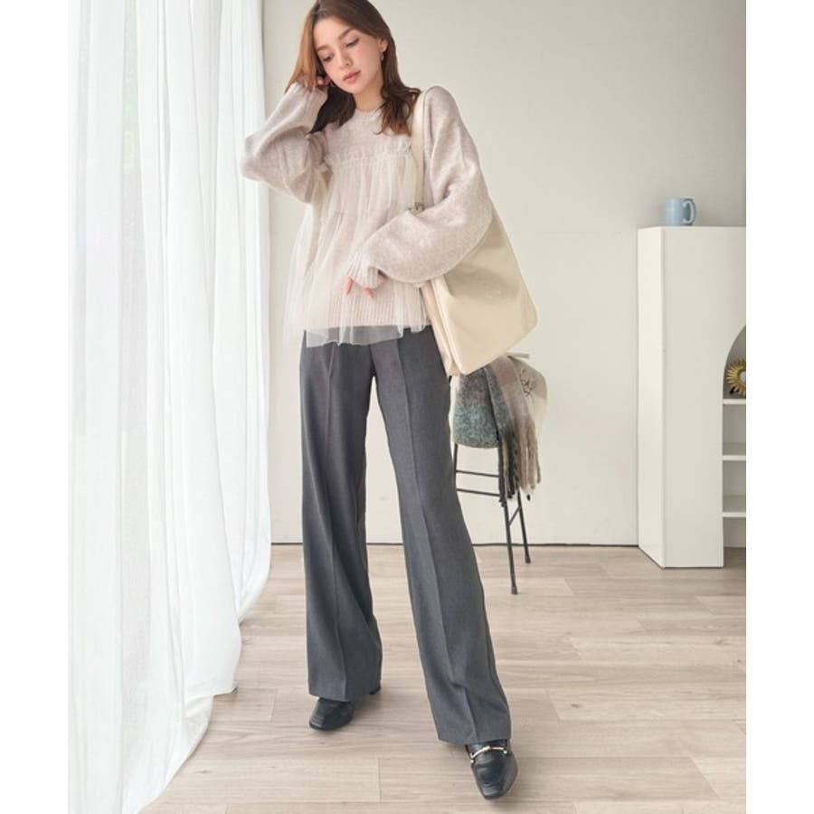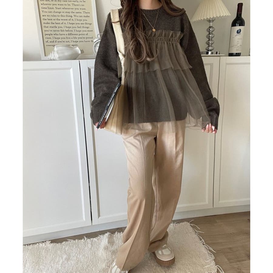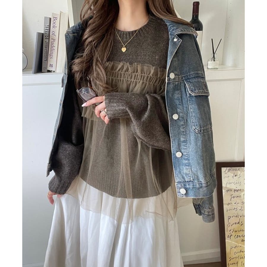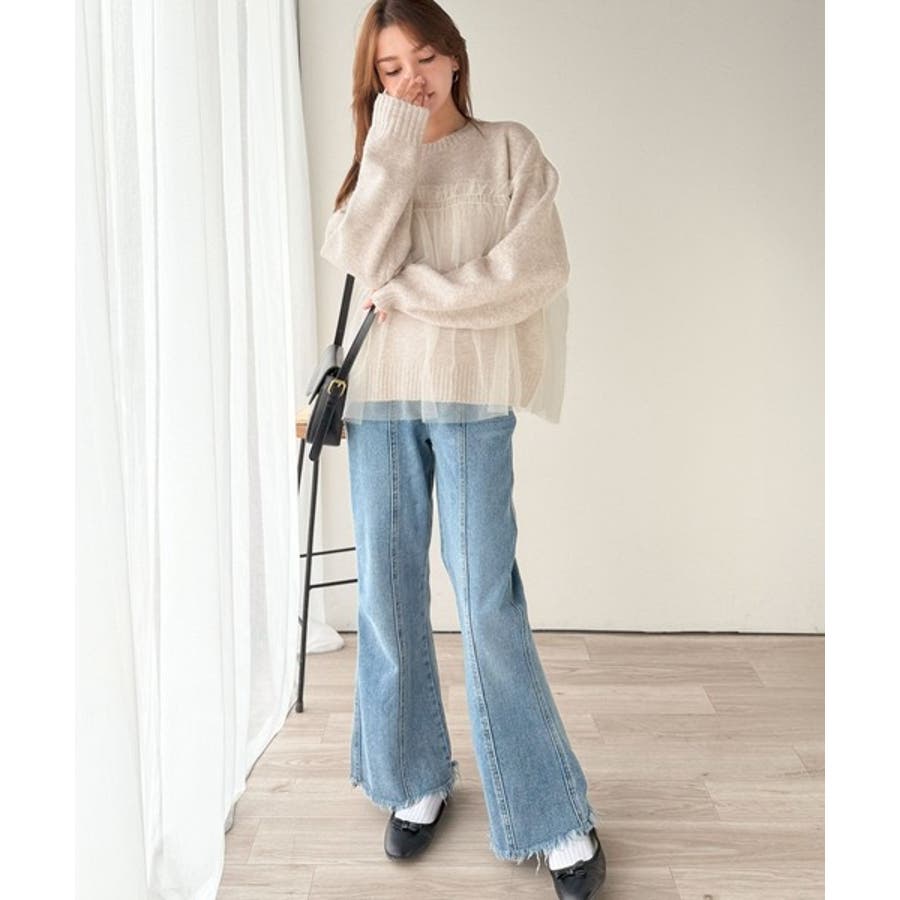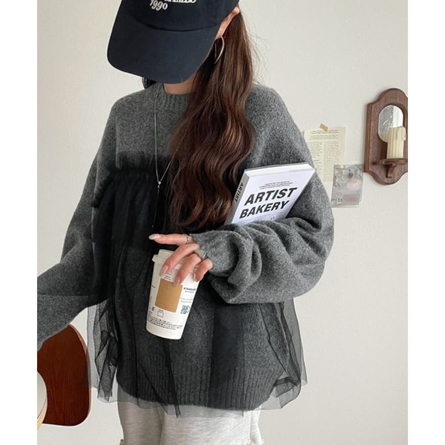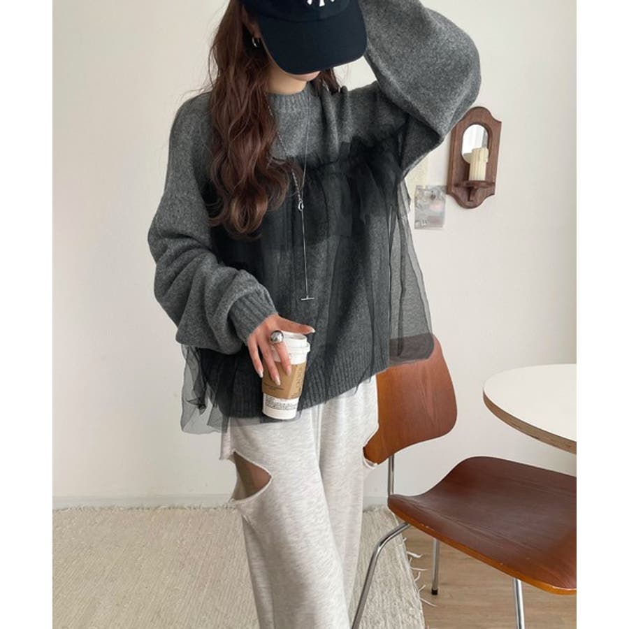 チュール素材をドッキングしたニットは、甘すぎず大人っぽいカジュアルスタイルに最適。