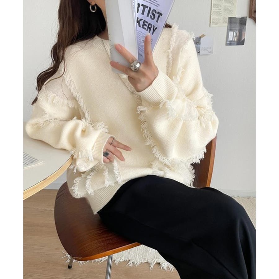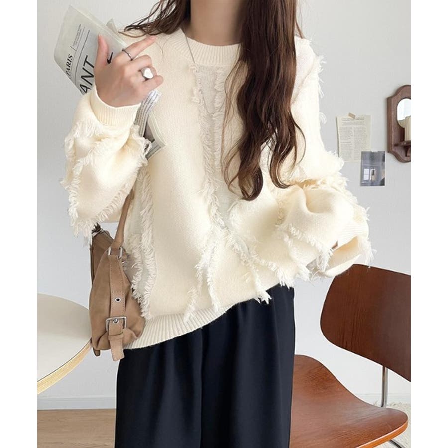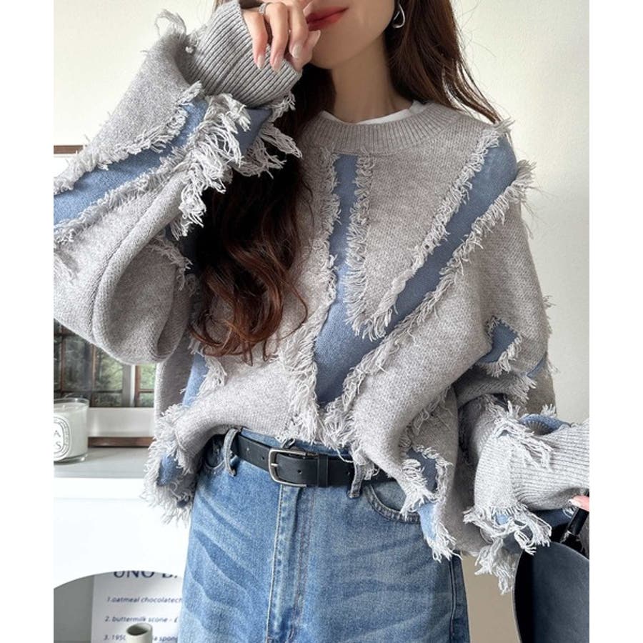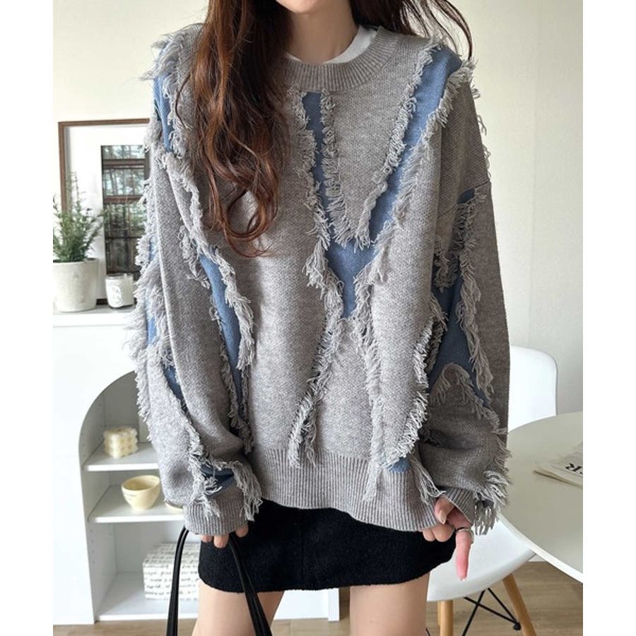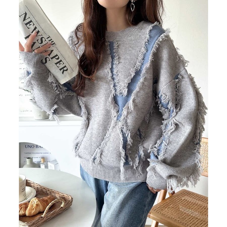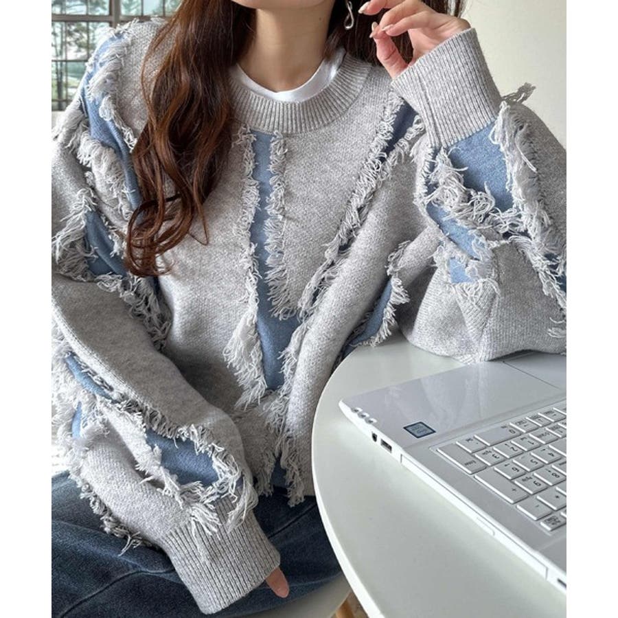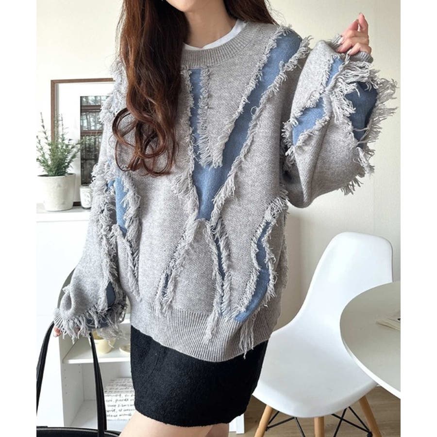 ゆるっとこなれ感◎男女兼用可♪フリンジ配色オーバーニット(長袖)
