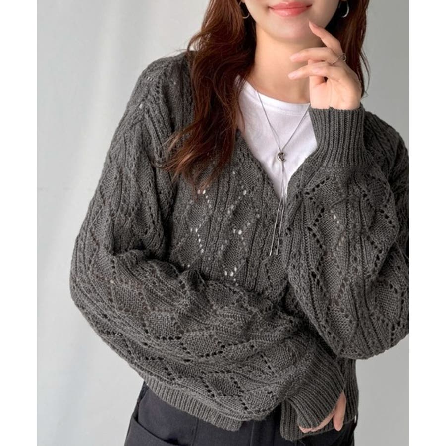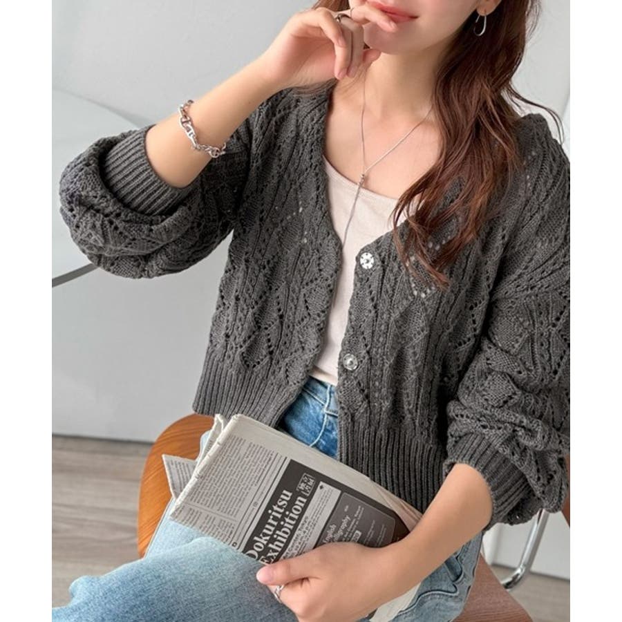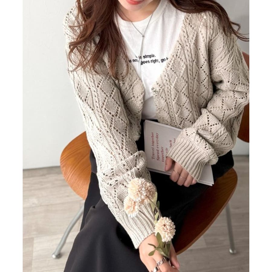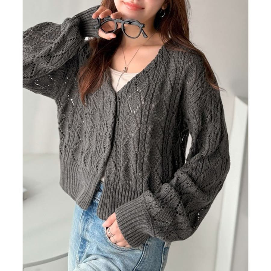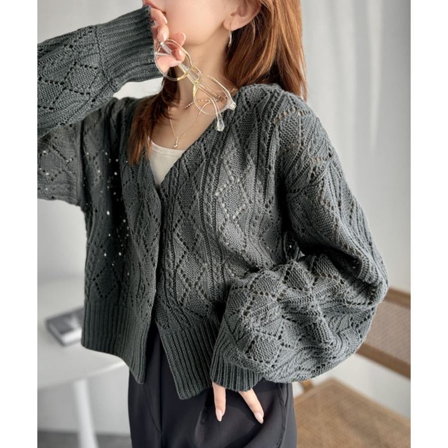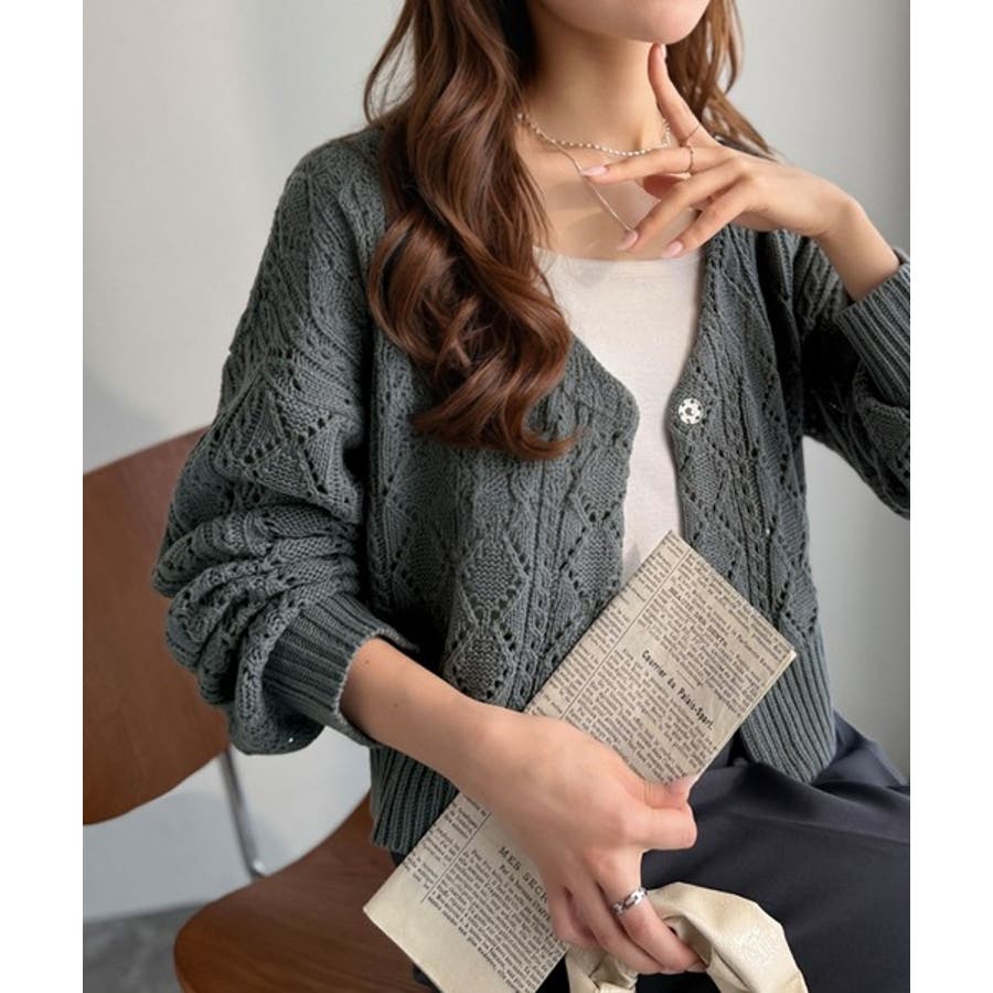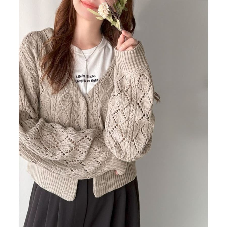 ふわっと軽い着心地が魅力の、格子柄の透かし編みニットカーデ。
