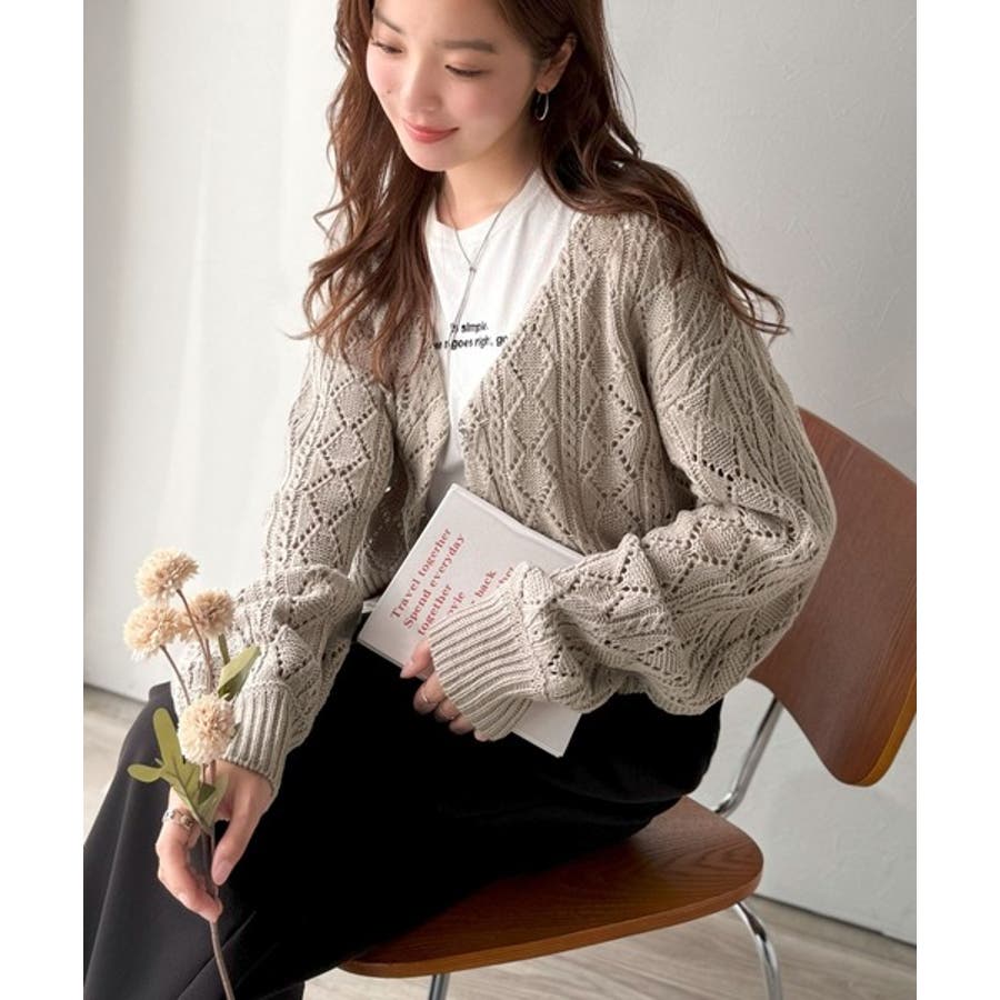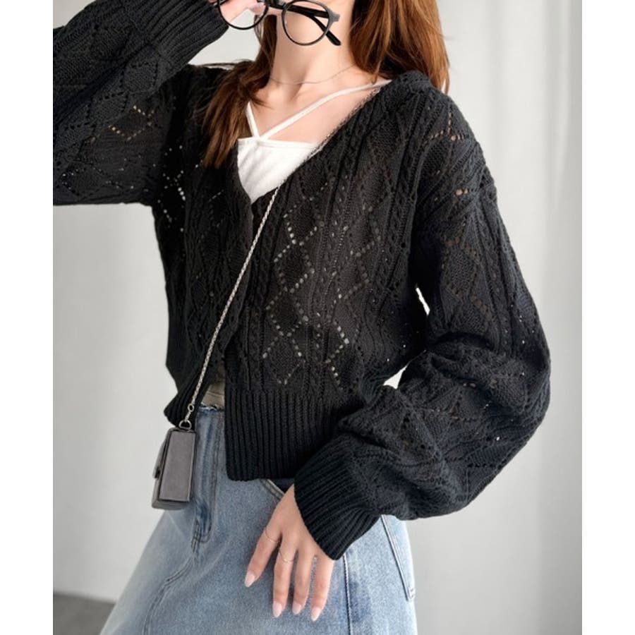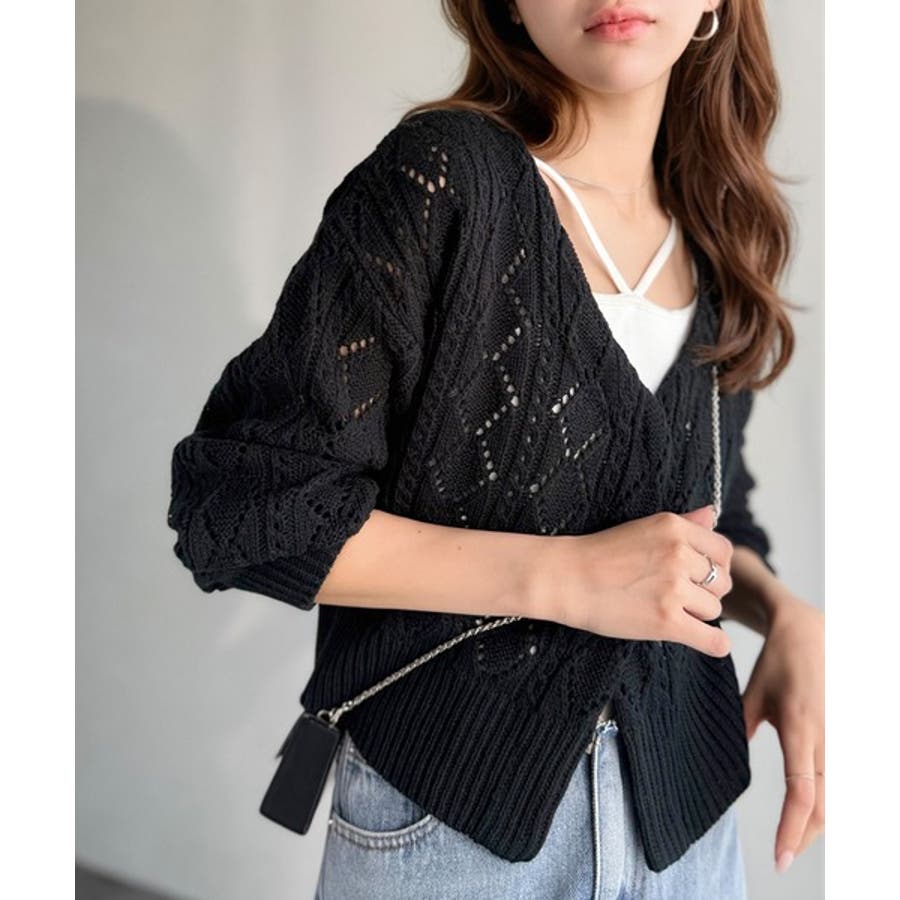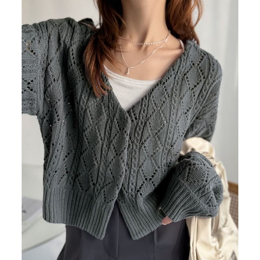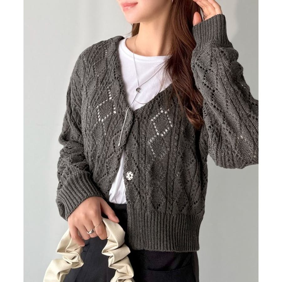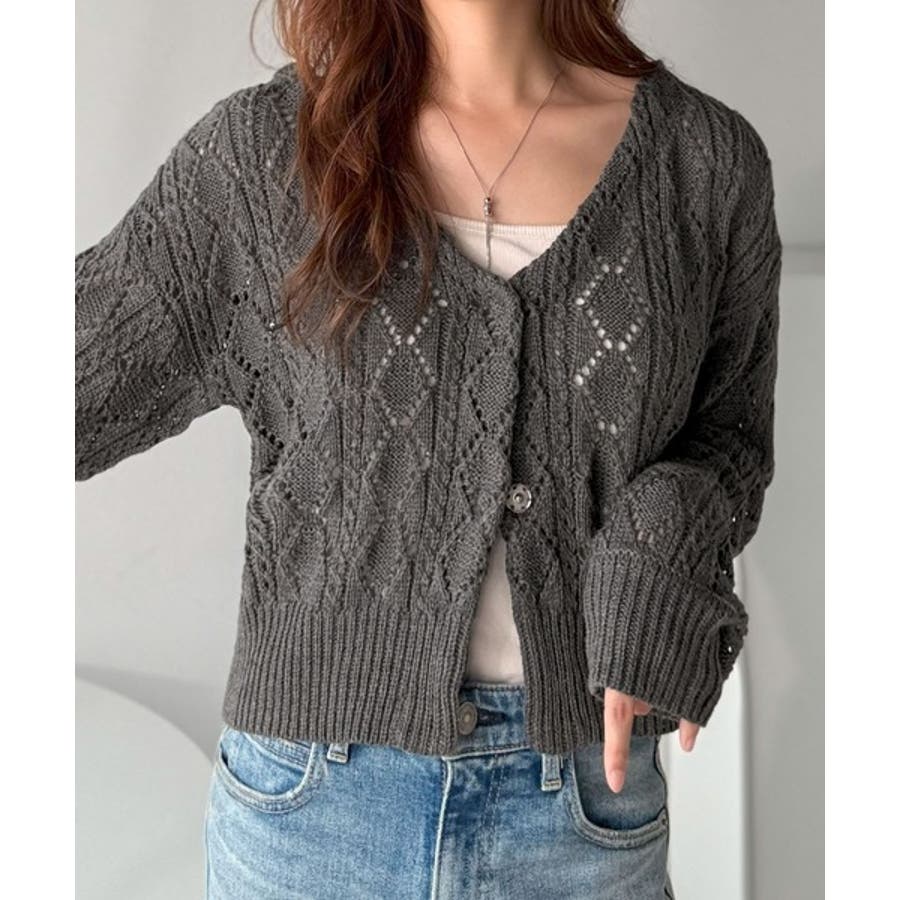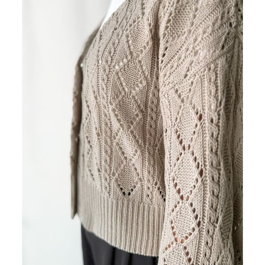 ふわっと軽い着心地が魅力の、格子柄の透かし編みニットカーデ。