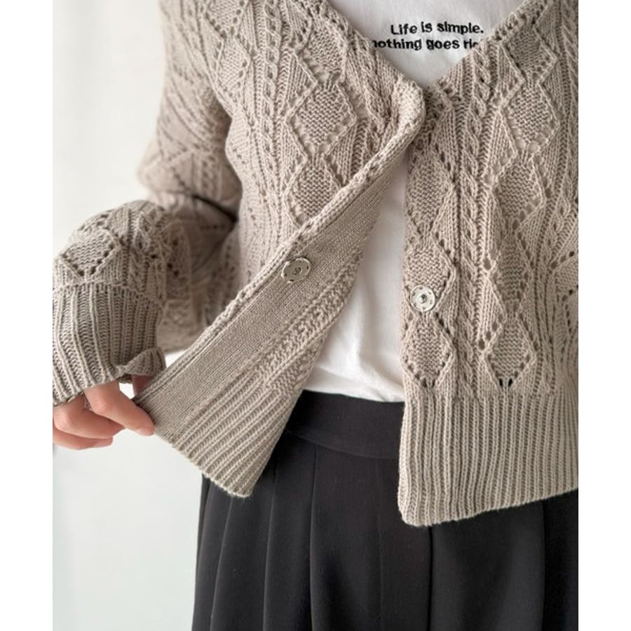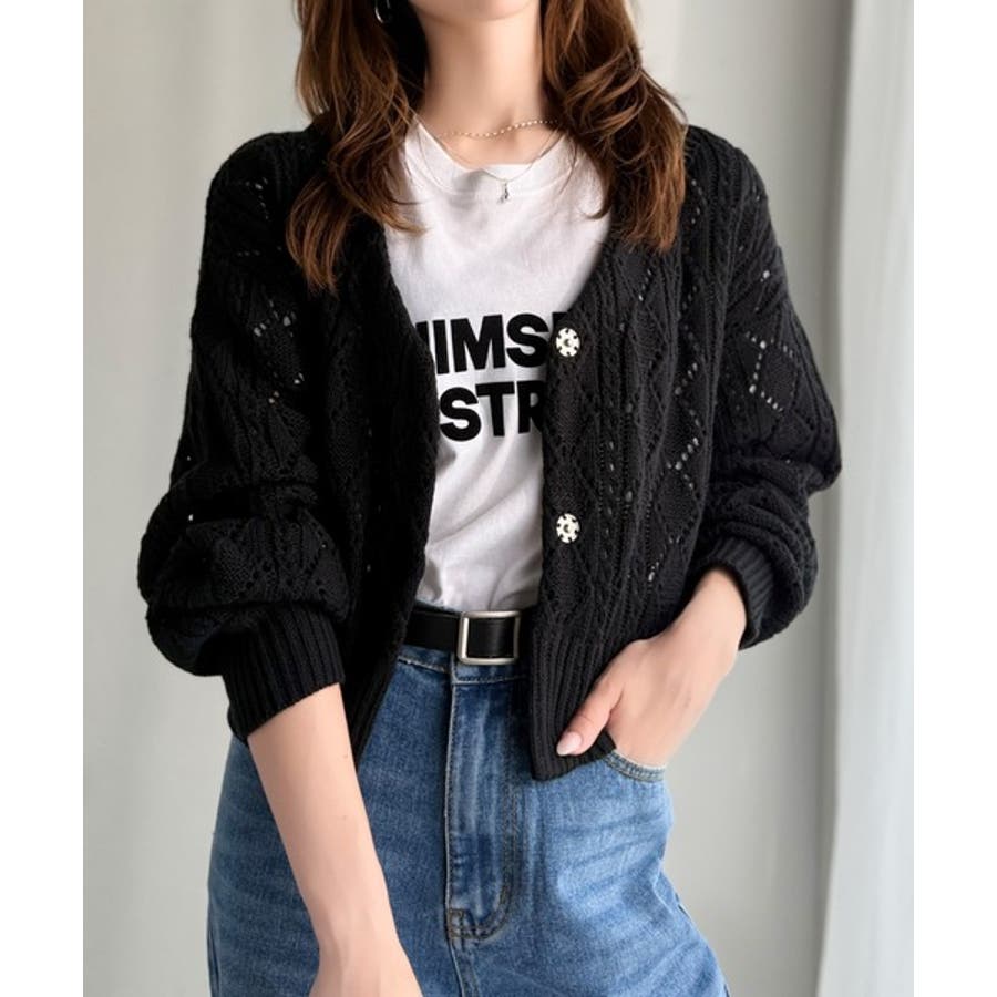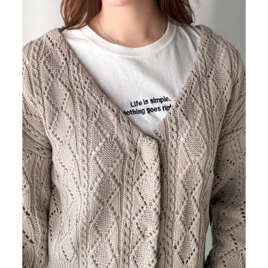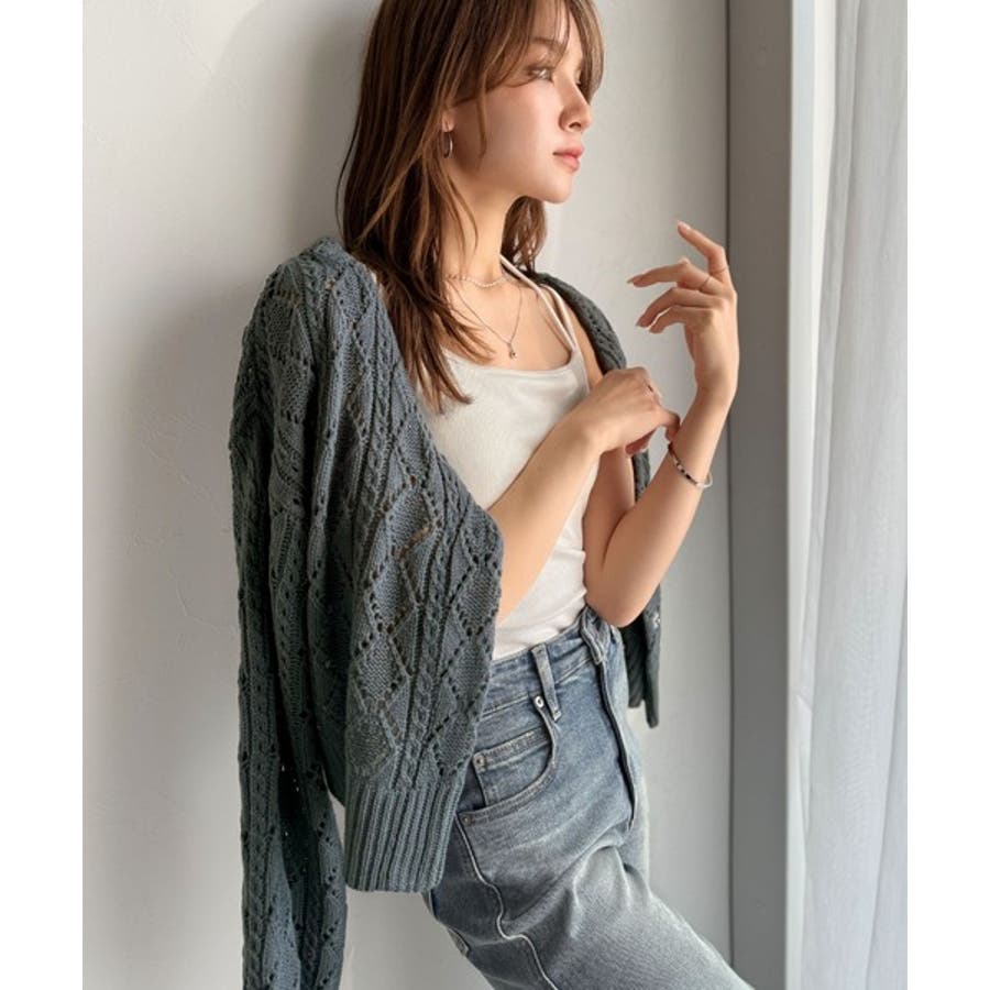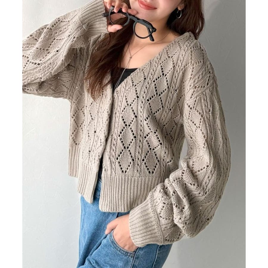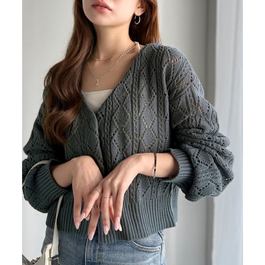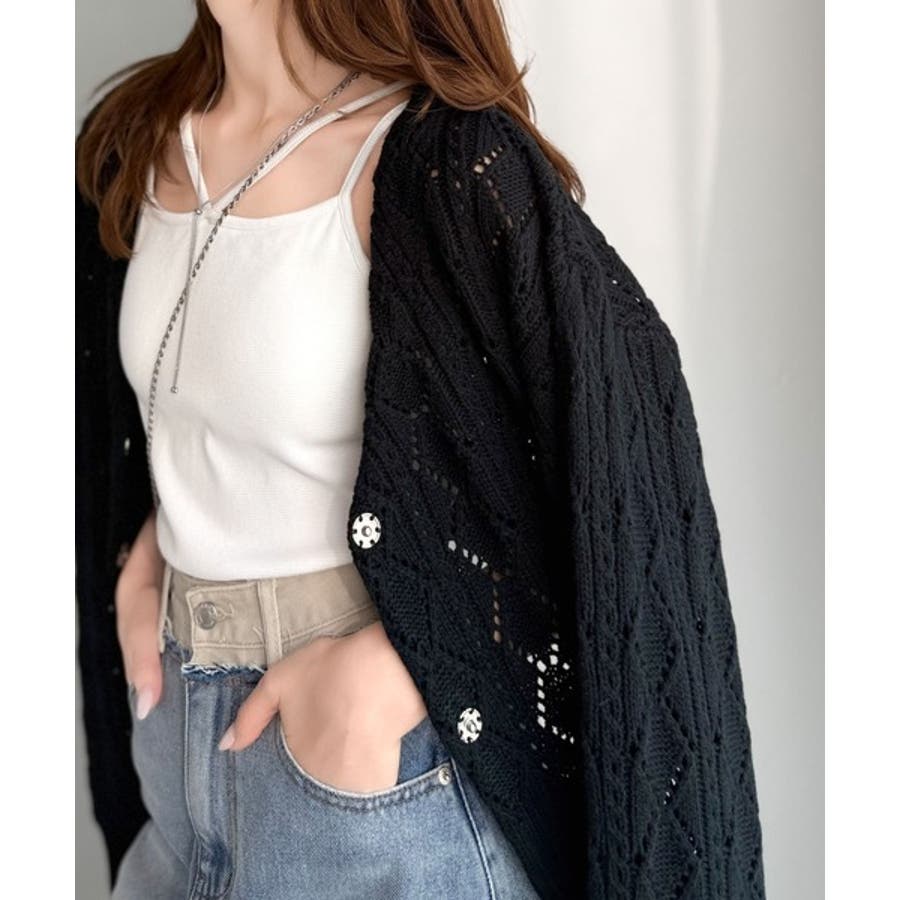ふわっと軽い着心地が魅力の、格子柄の透かし編みニットカーデ。