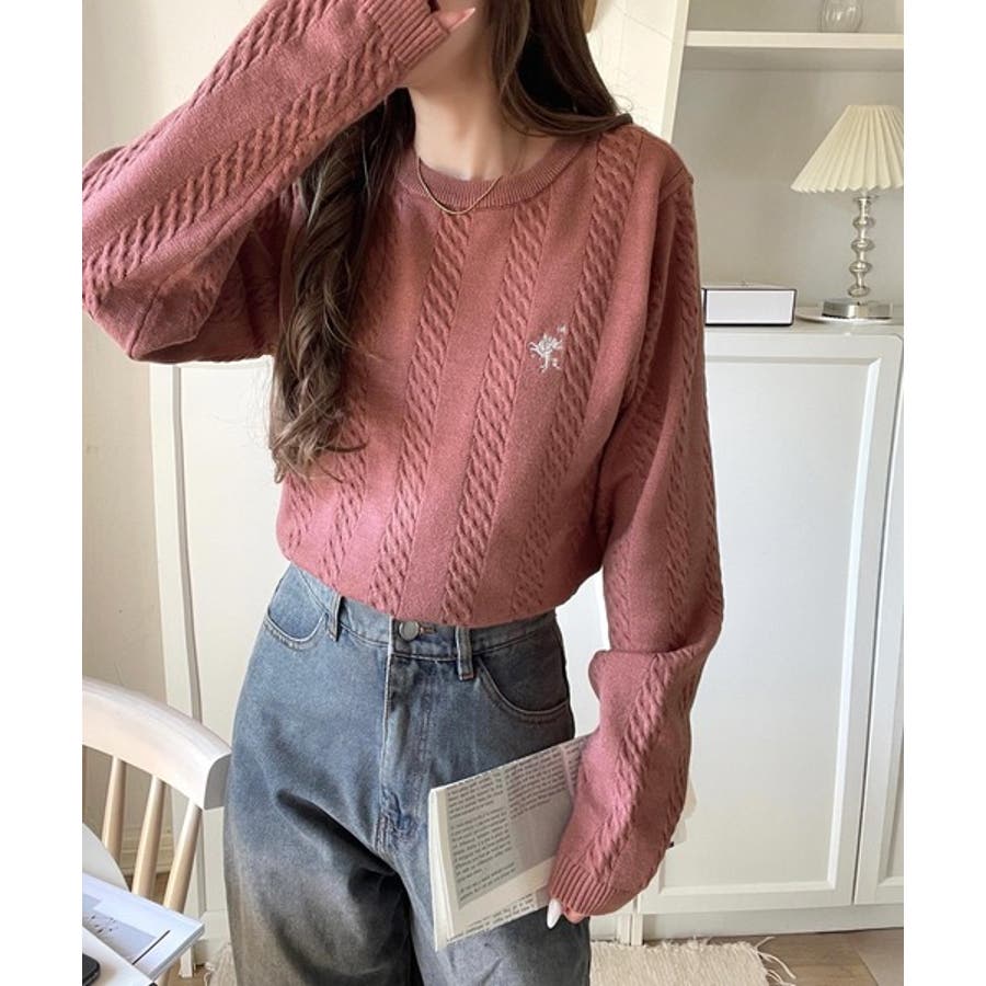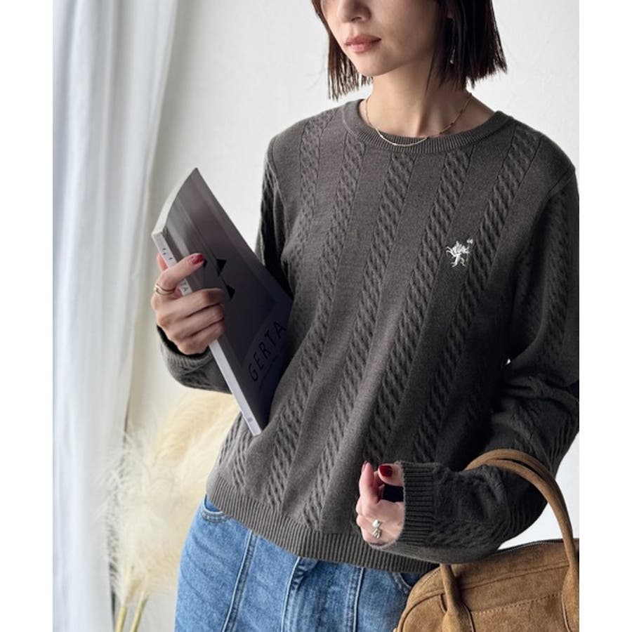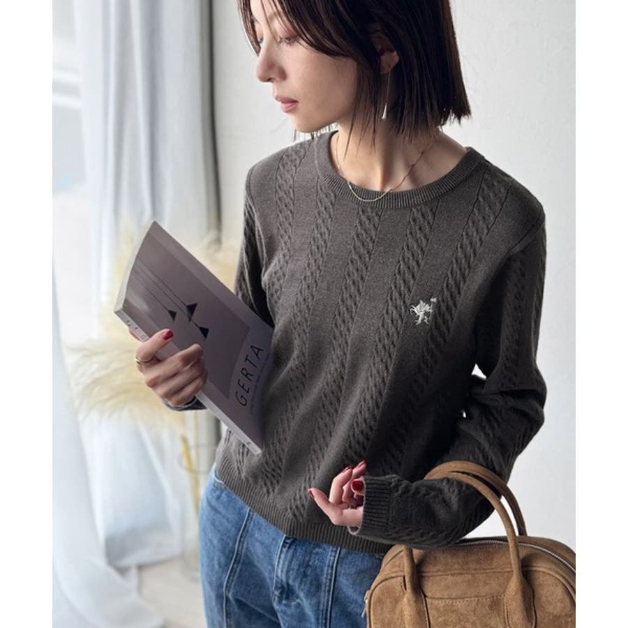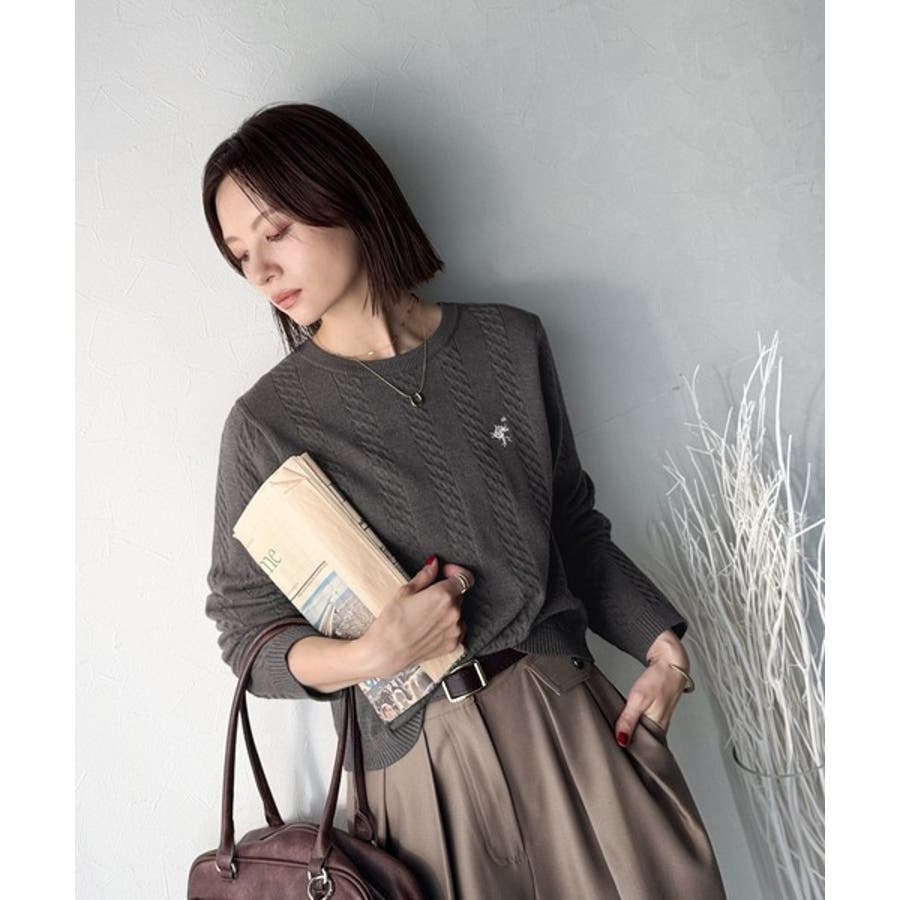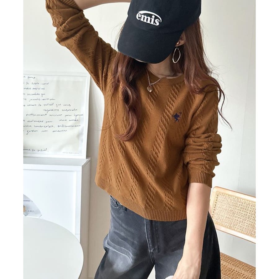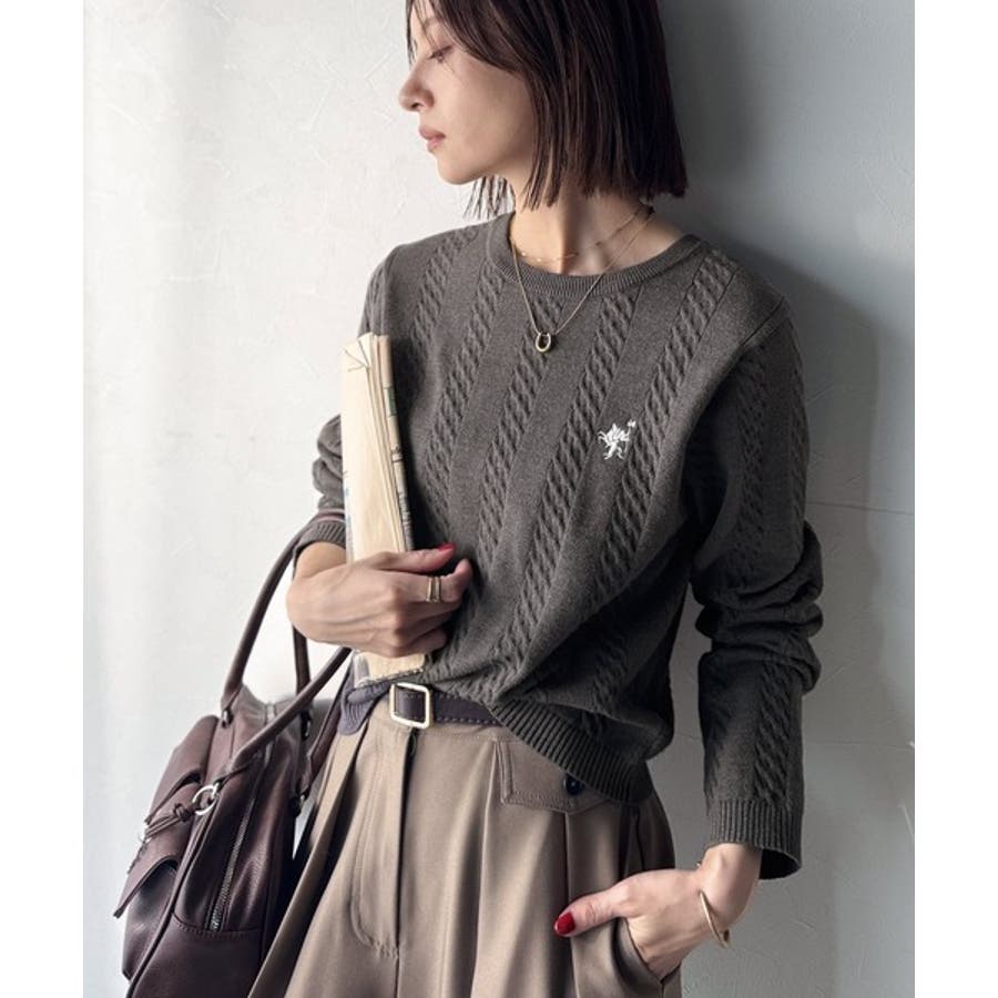 大人のためのコンパクトニット。胸刺繍ショート丈ケーブル編みニット(長袖)