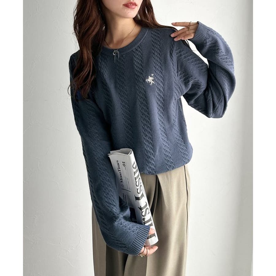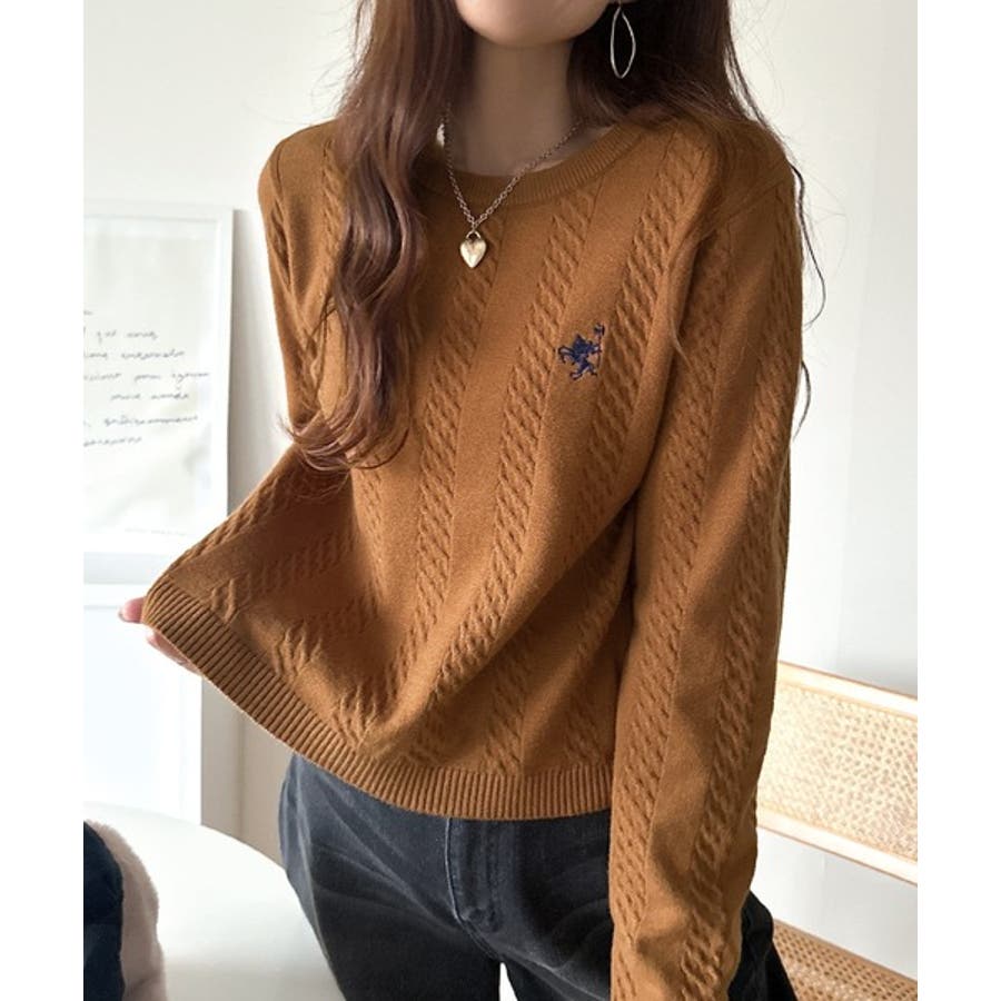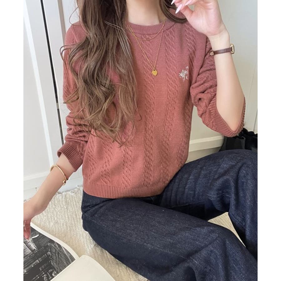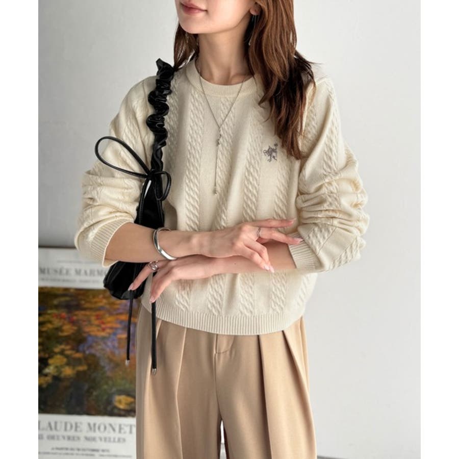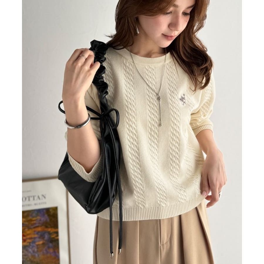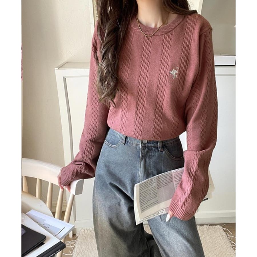 大人のためのコンパクトニット。胸刺繍ショート丈ケーブル編みニット(長袖)