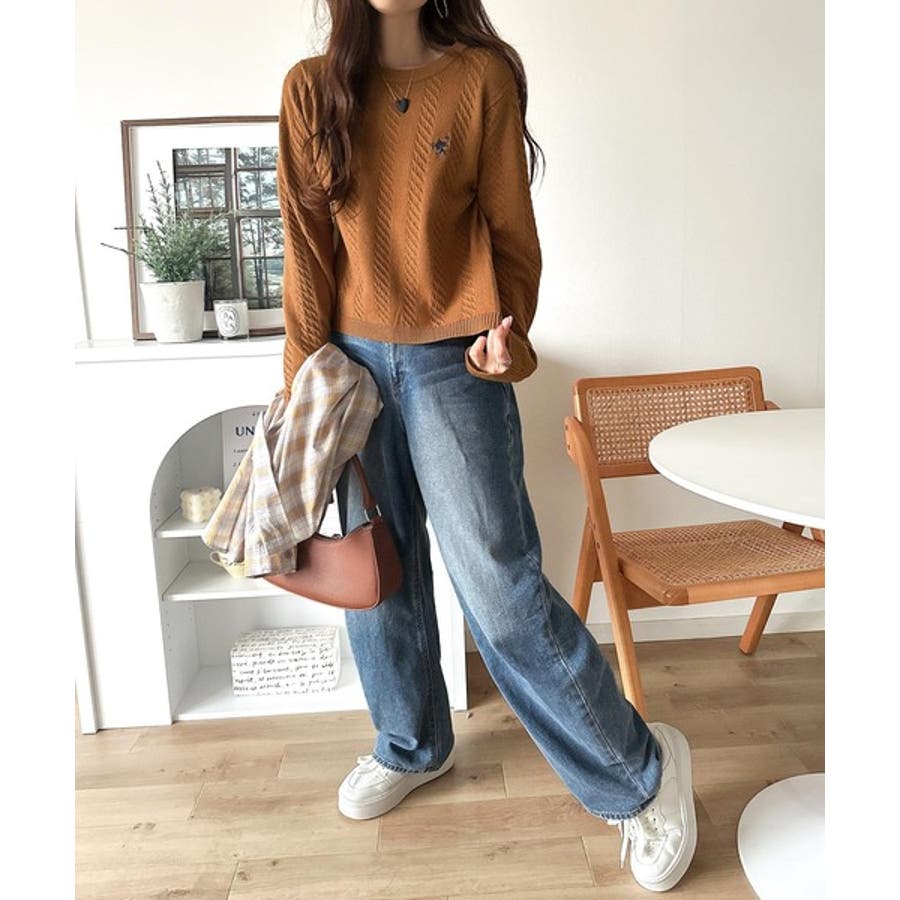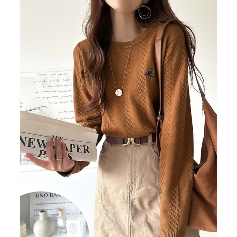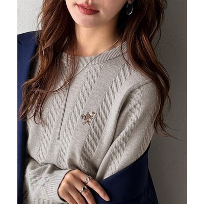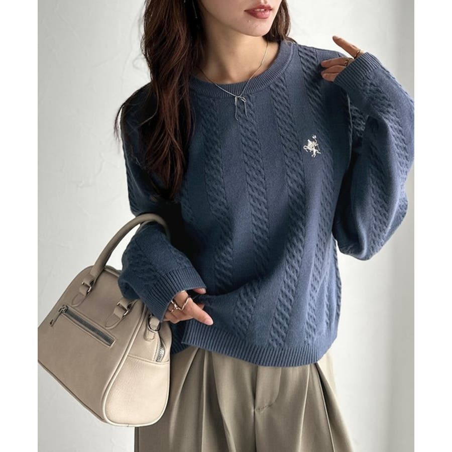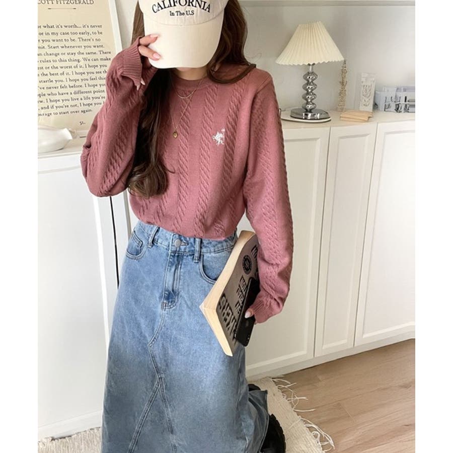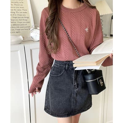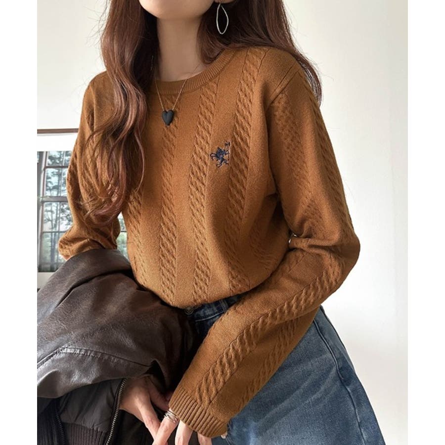 大人のためのコンパクトニット。胸刺繍ショート丈ケーブル編みニット(長袖)