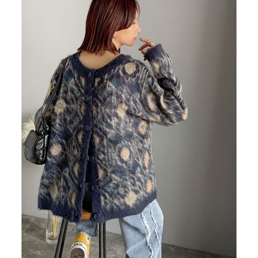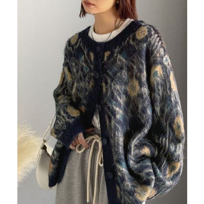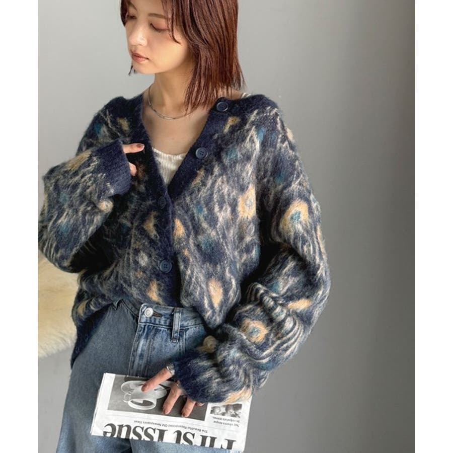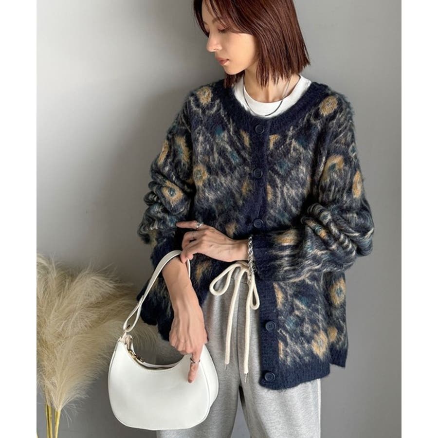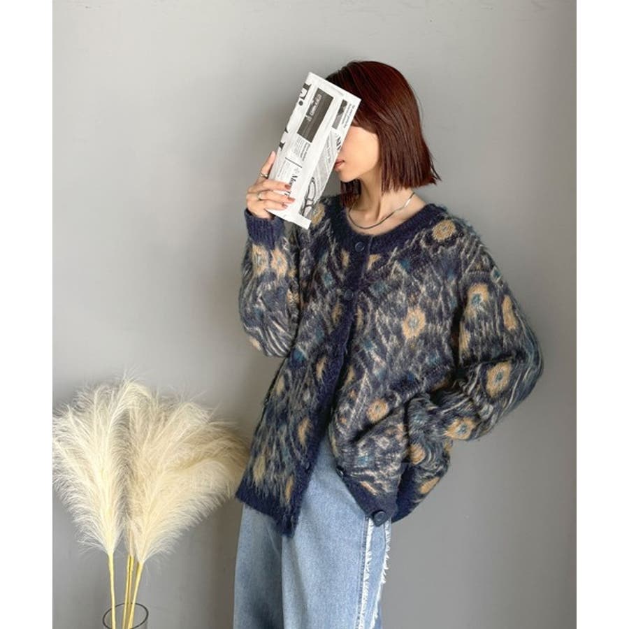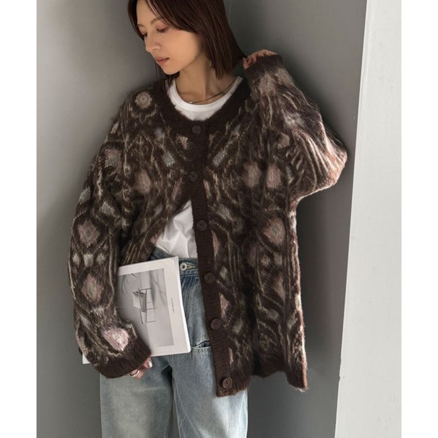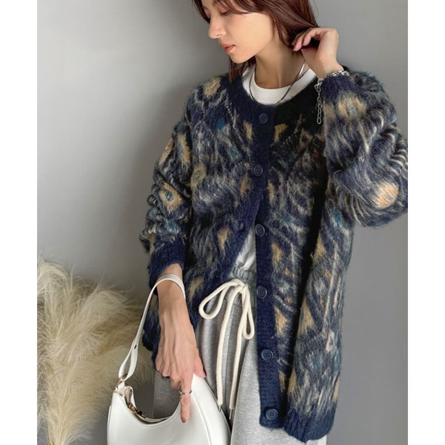 ヴィンテージライクなラグモチーフ柄のニットカーディガン。