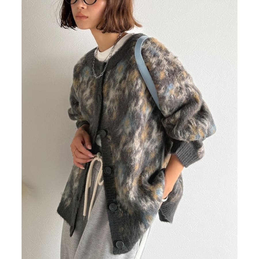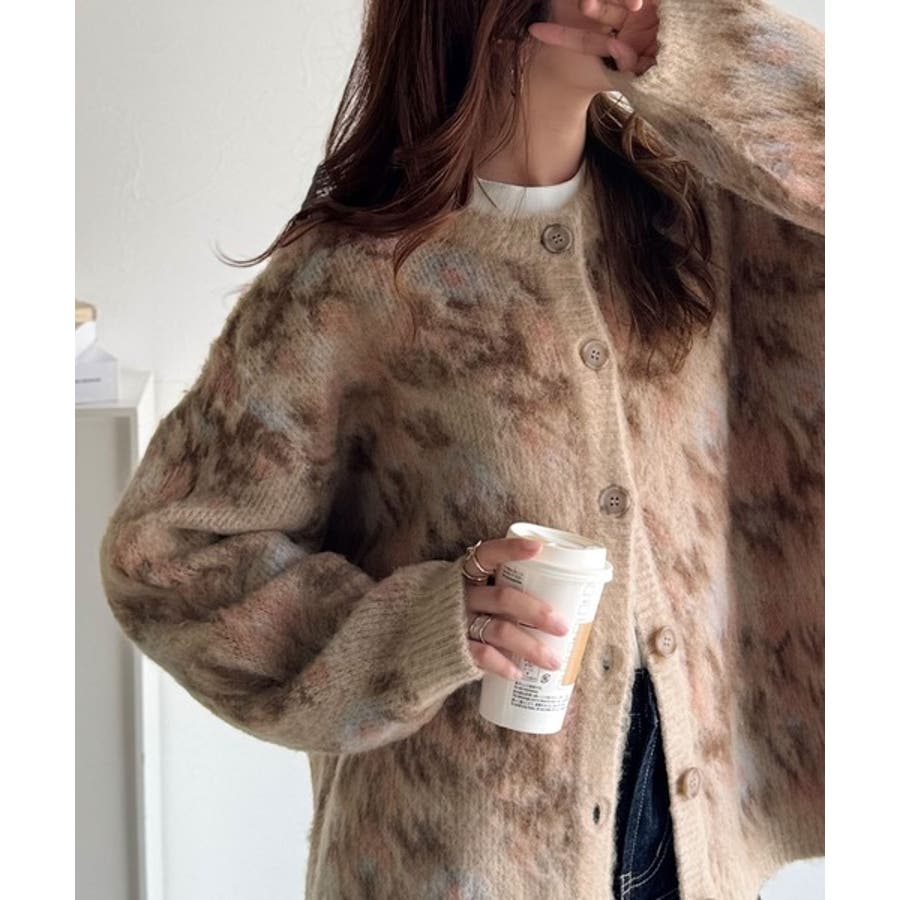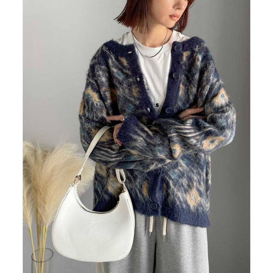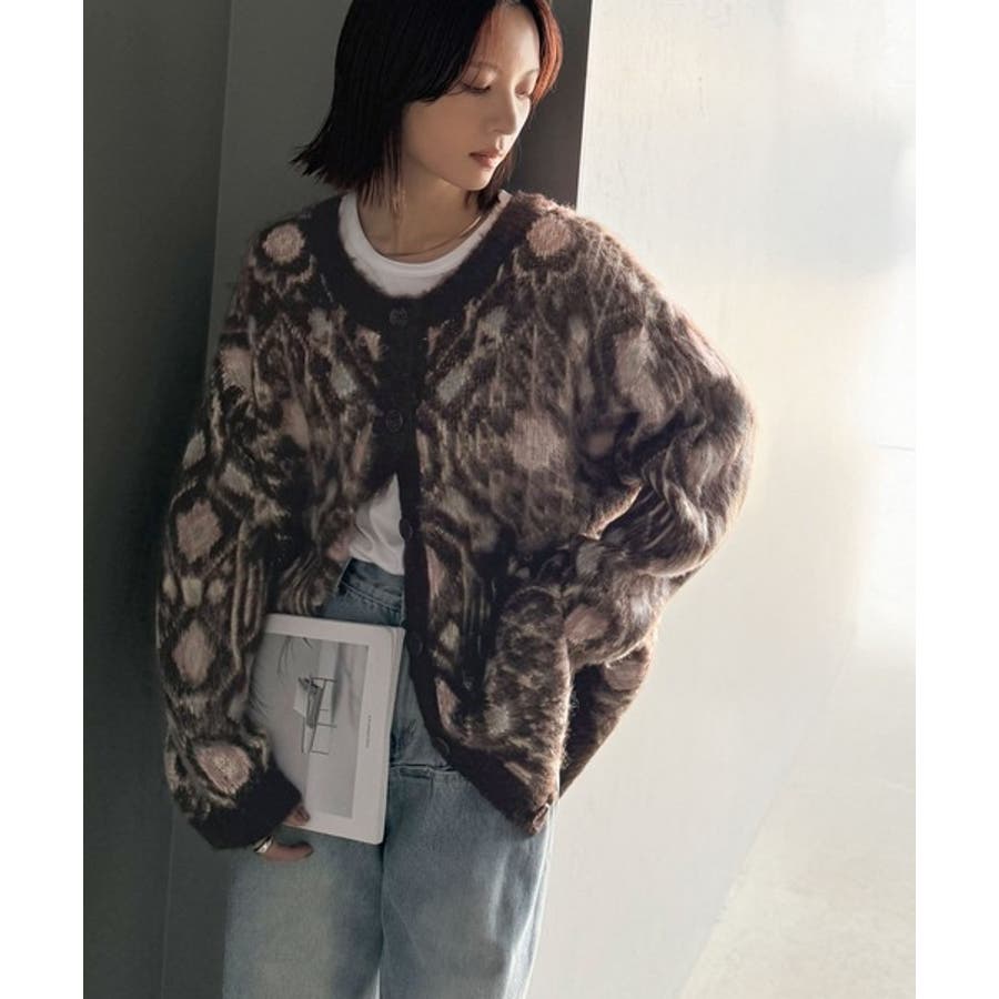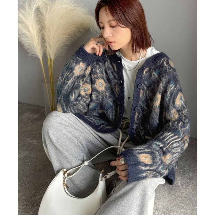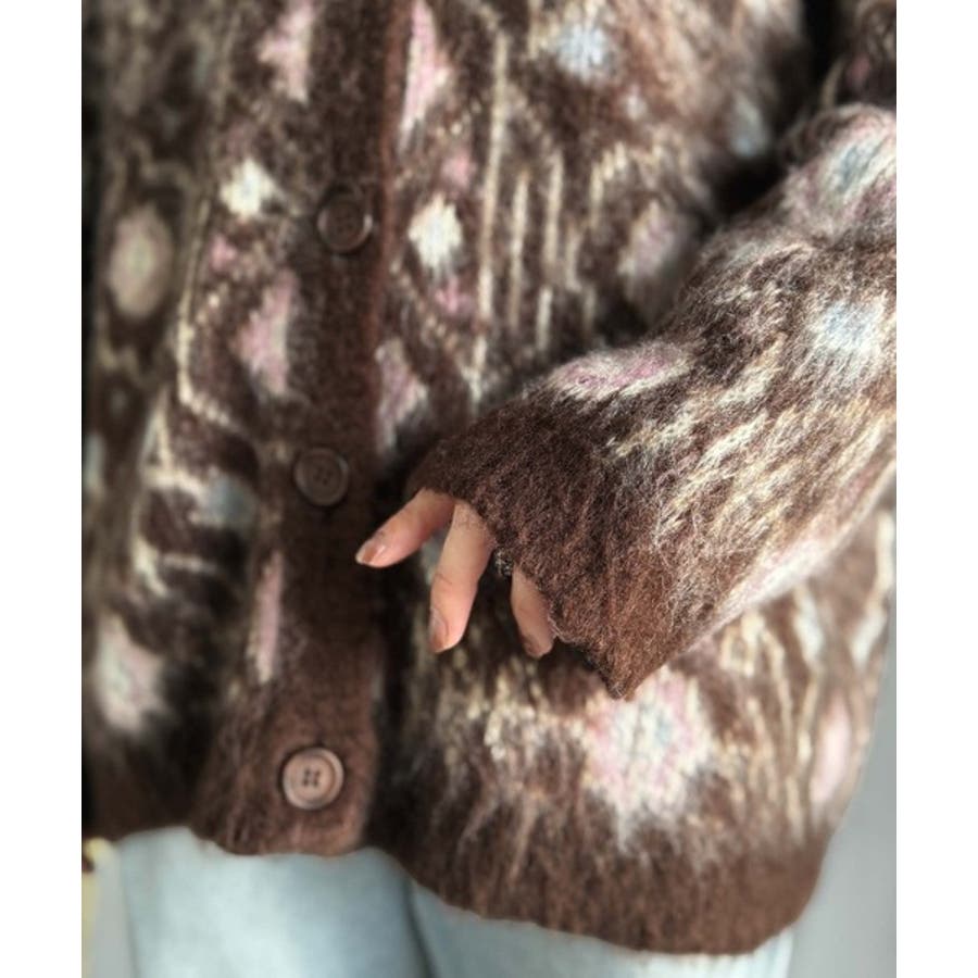 ヴィンテージライクなラグモチーフ柄のニットカーディガン。