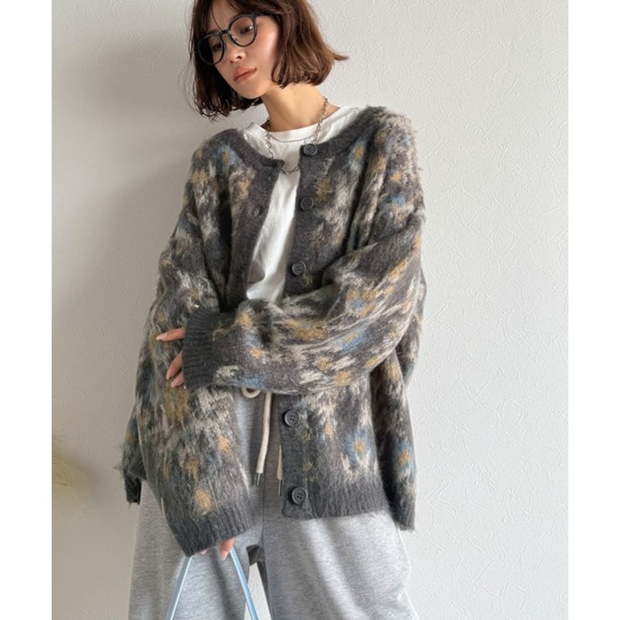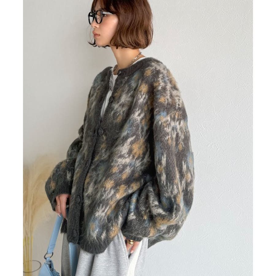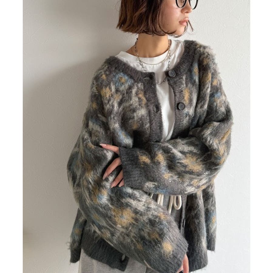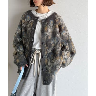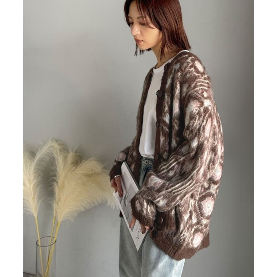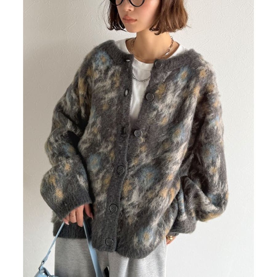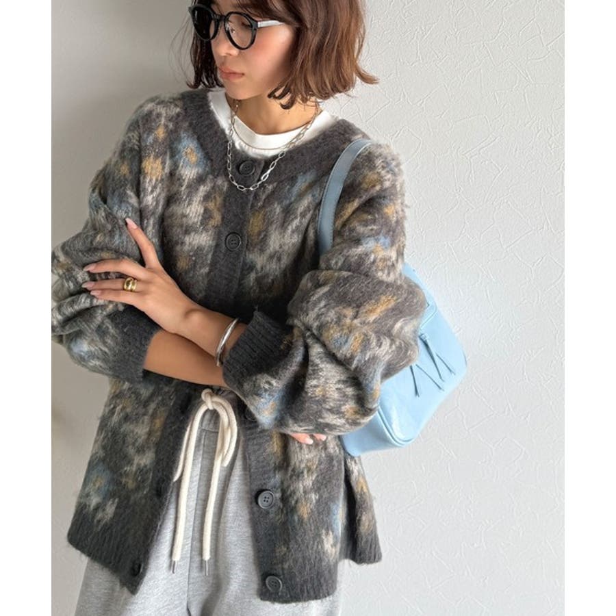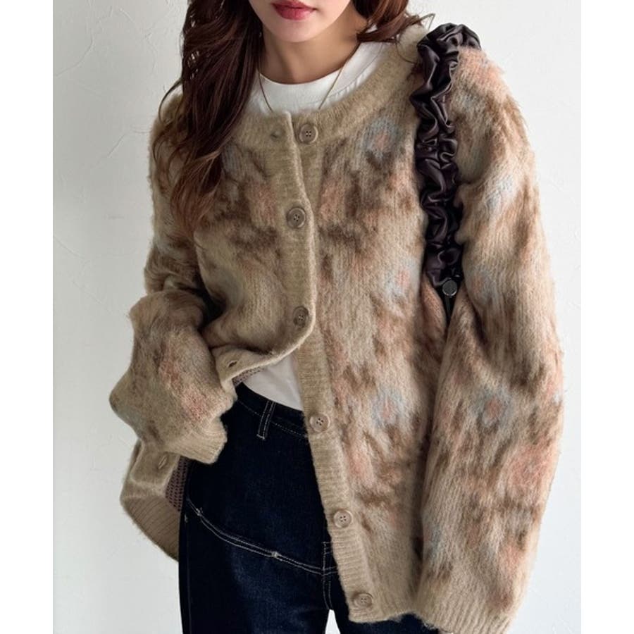 ヴィンテージライクなラグモチーフ柄のニットカーディガン。