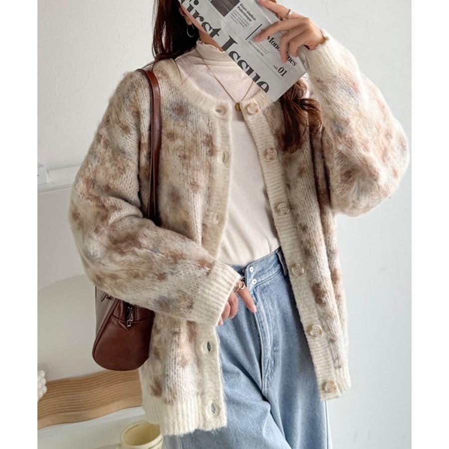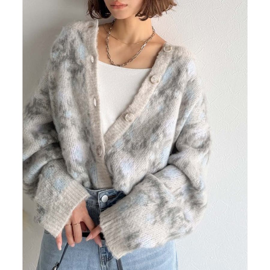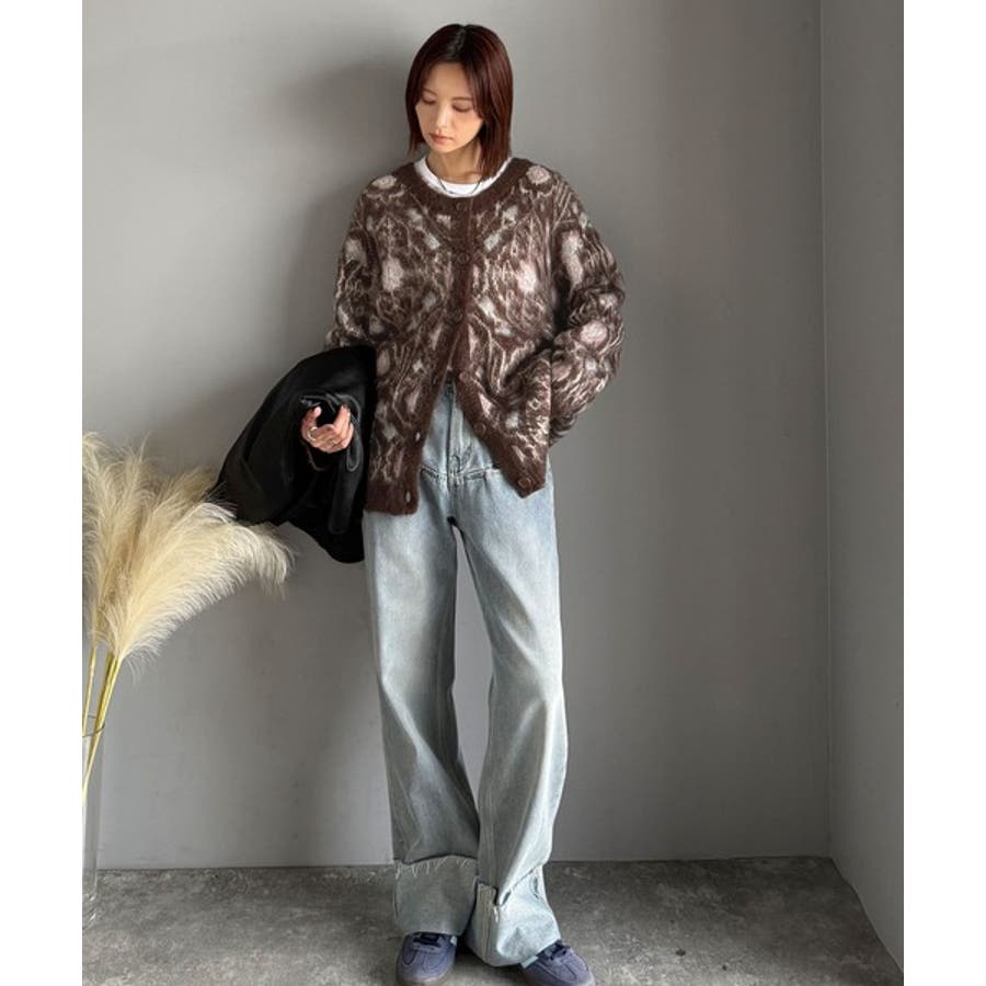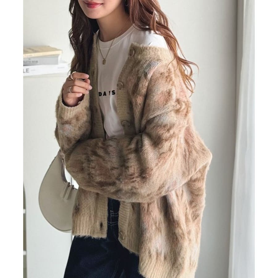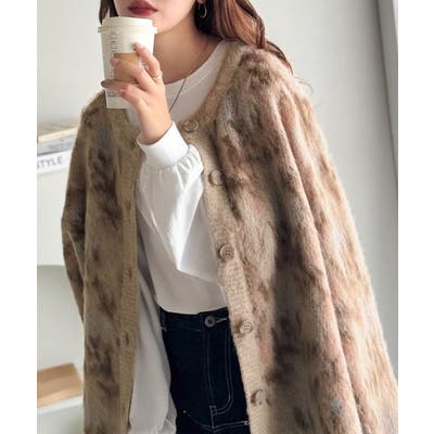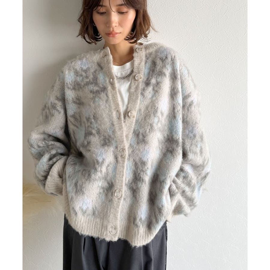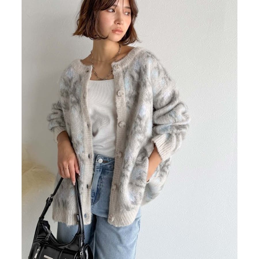 ヴィンテージライクなラグモチーフ柄のニットカーディガン。