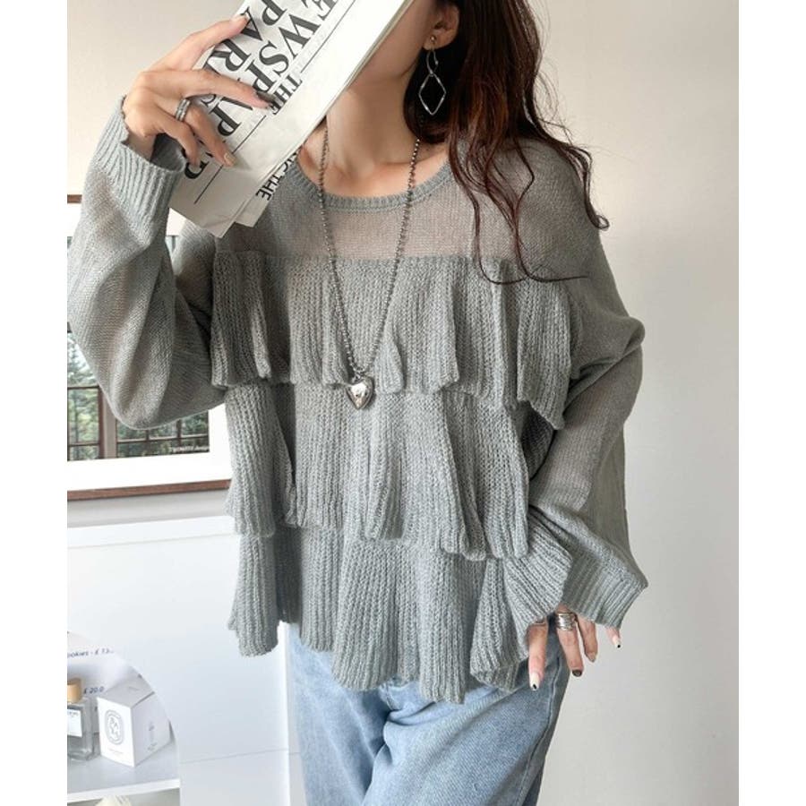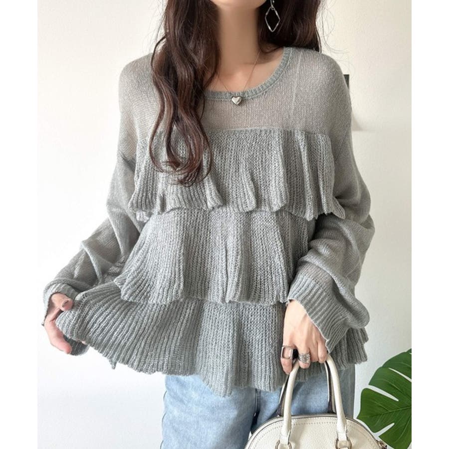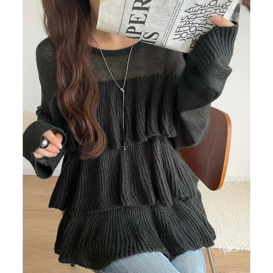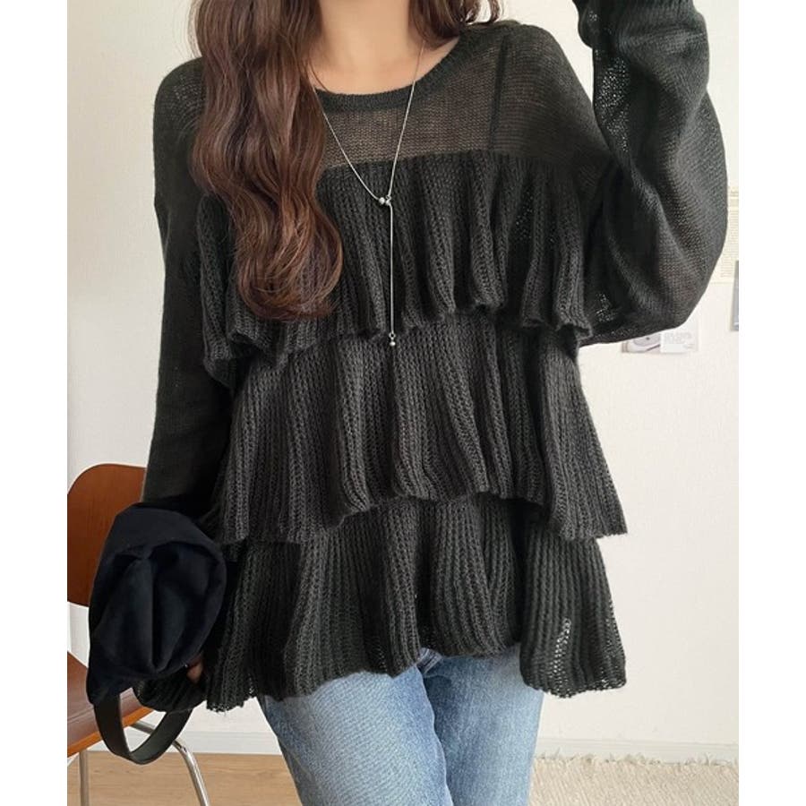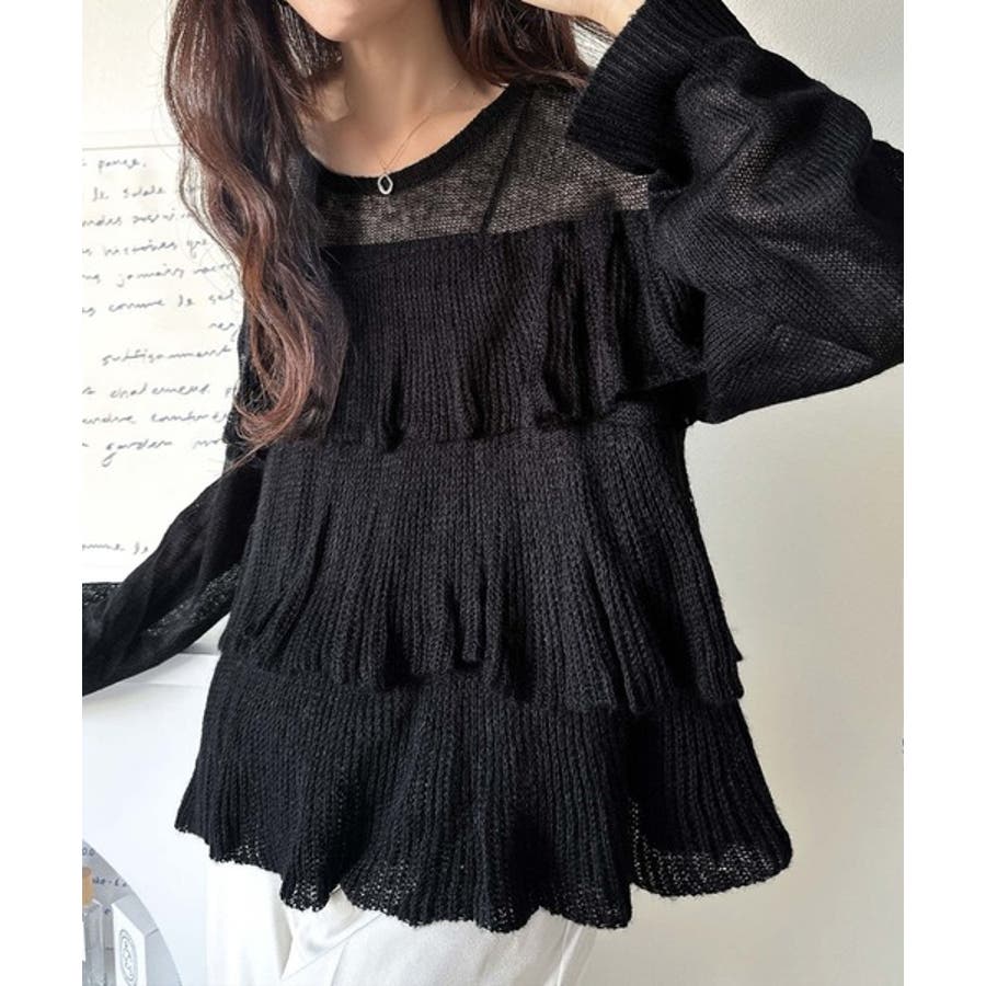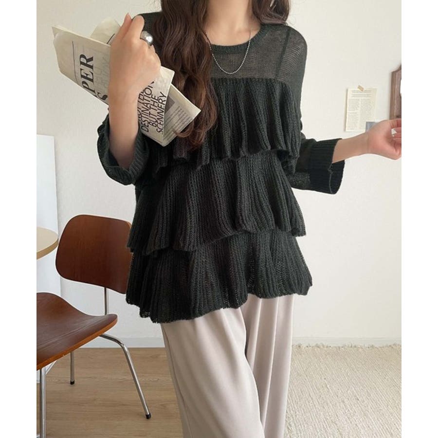 揺れるフリルが目を惹くティアードデザインのメッシュニットです。