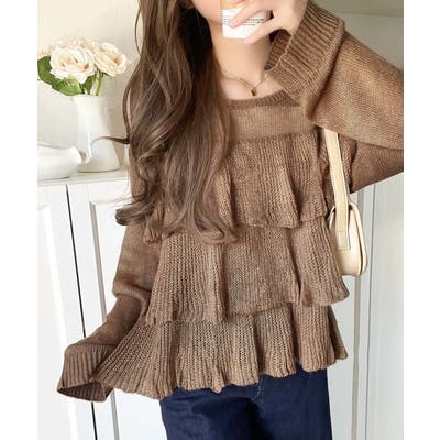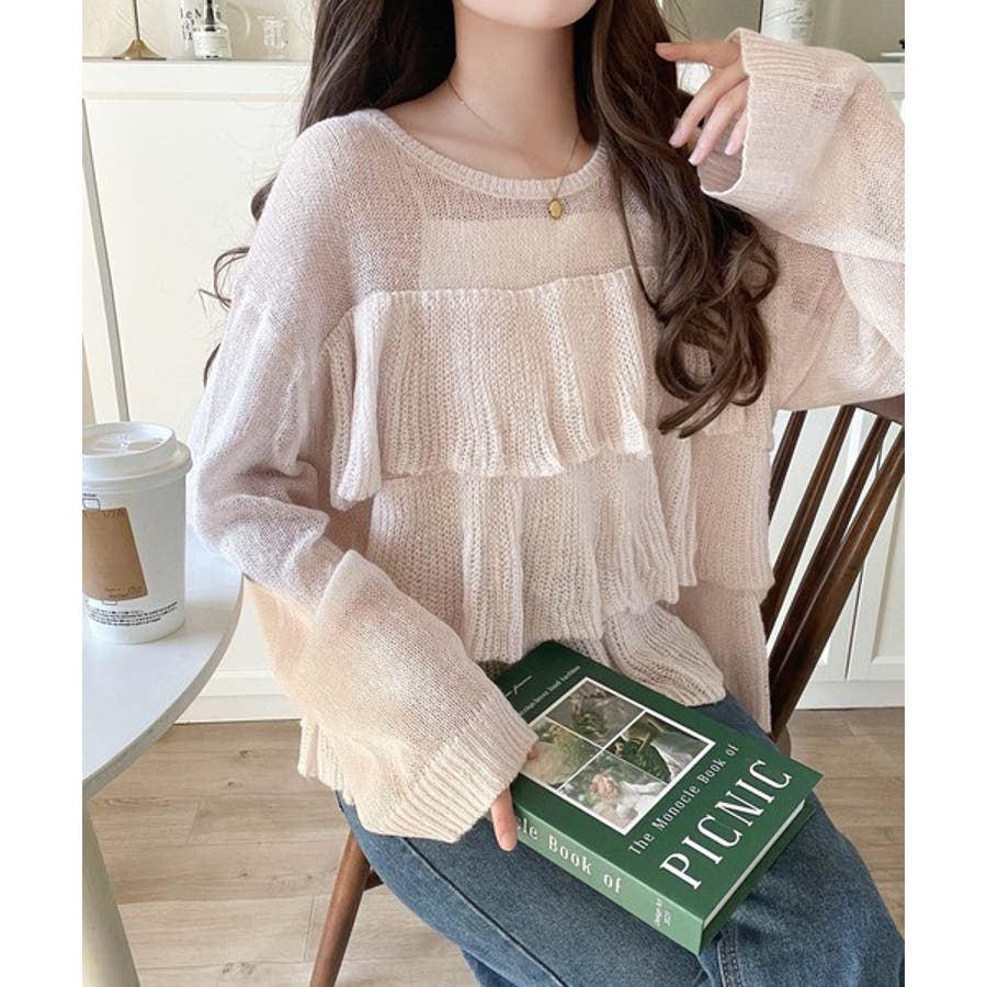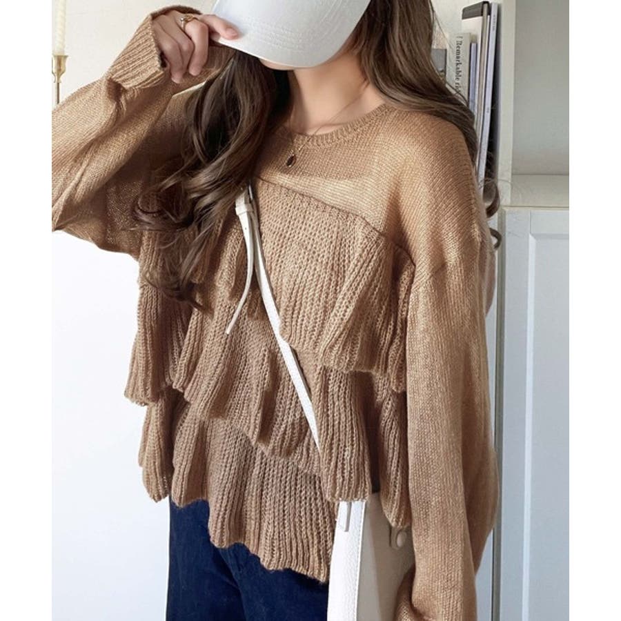 ふんわり大人フェミニン♪ティアードフリルモヘアタッチメッシュ編みニット(長袖)