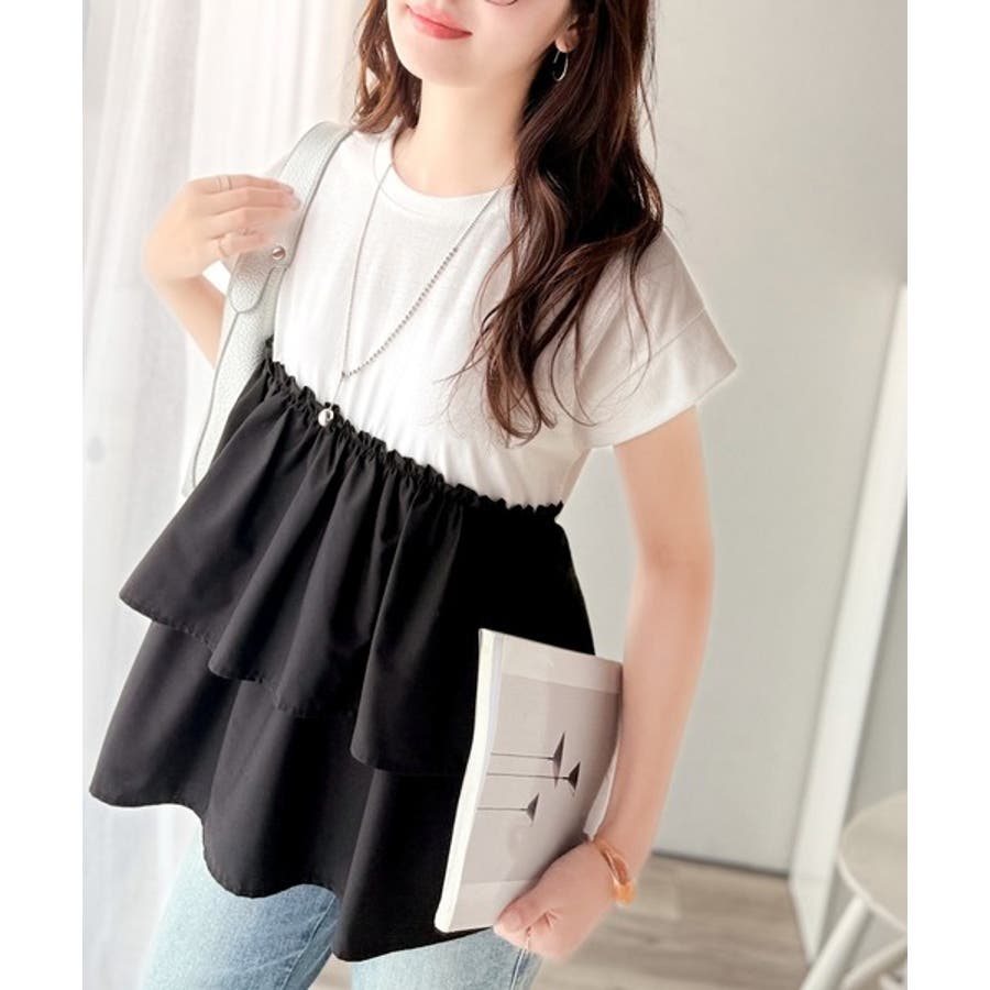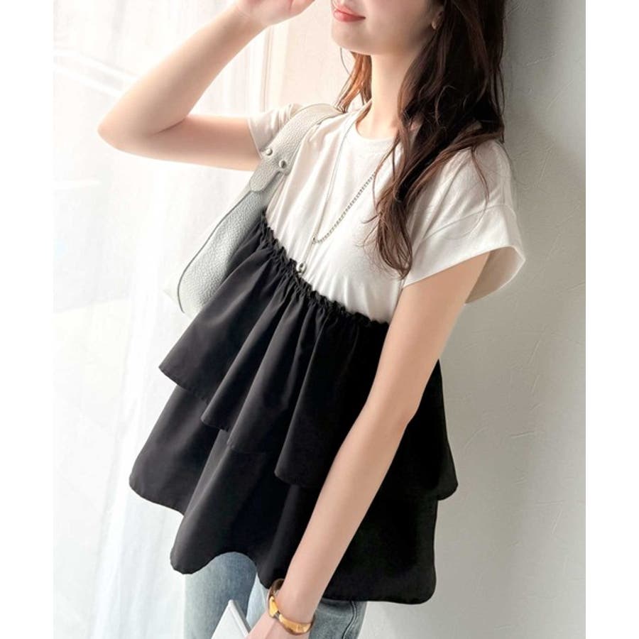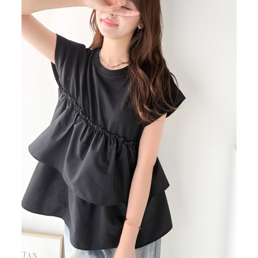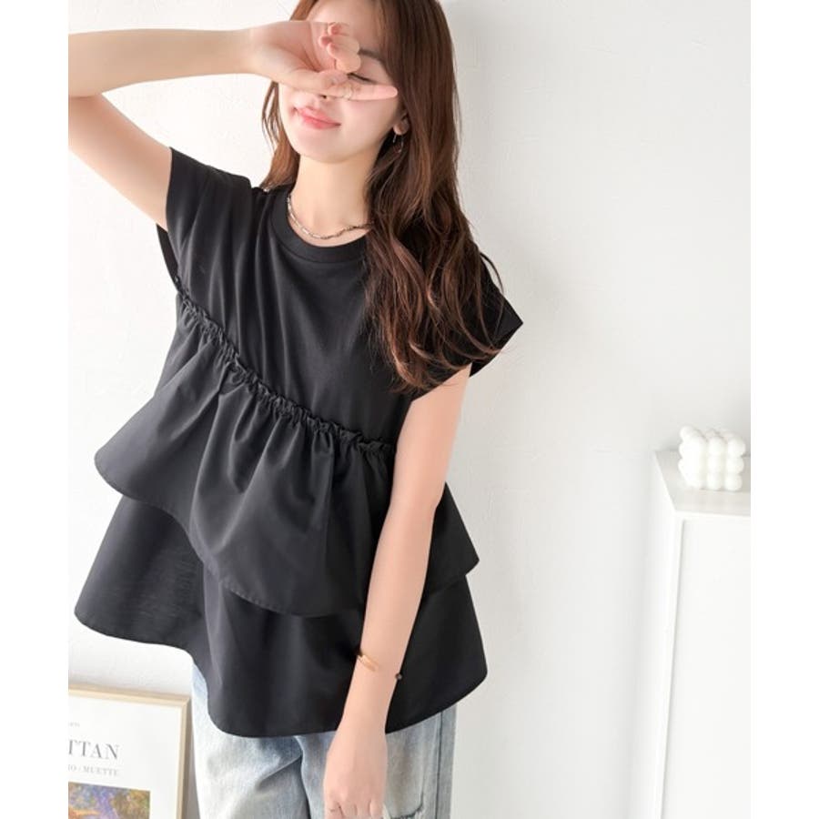 計算された、アンバランス。 アシンメトリーティアードフリル切り替えトップス(半袖…