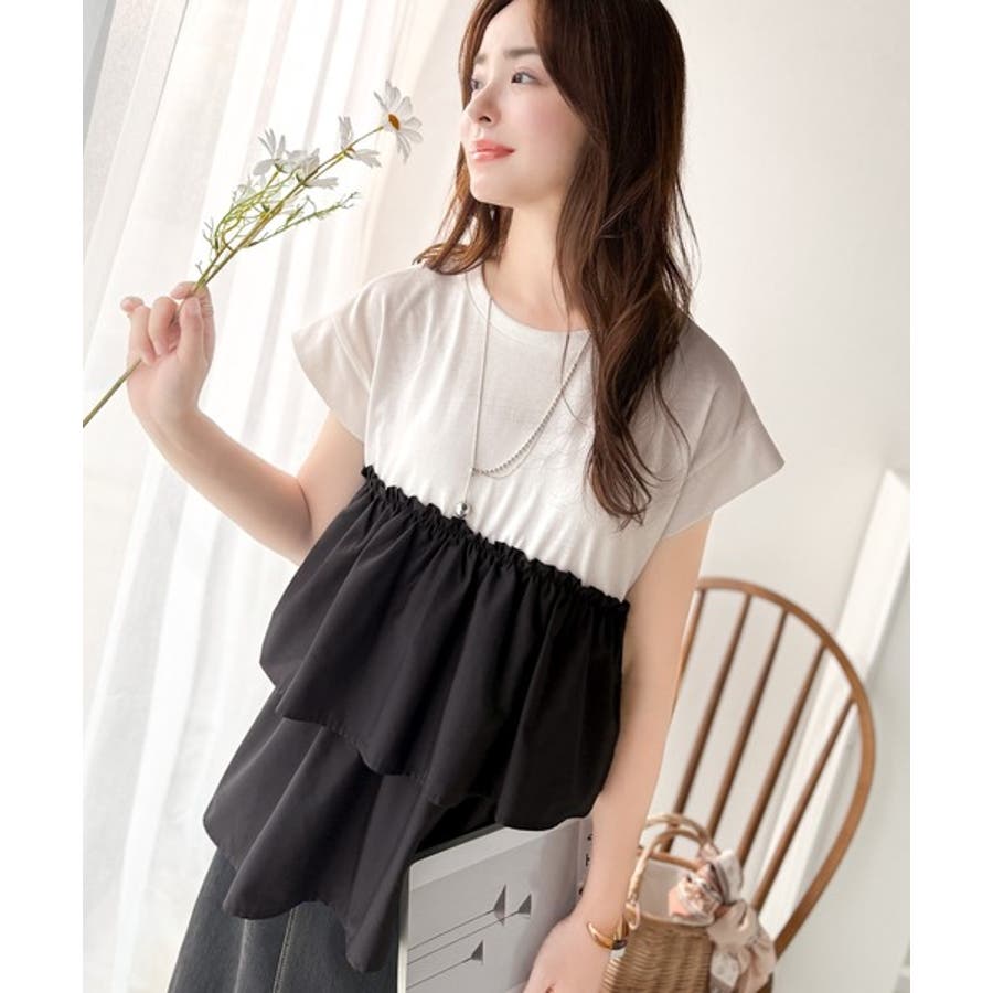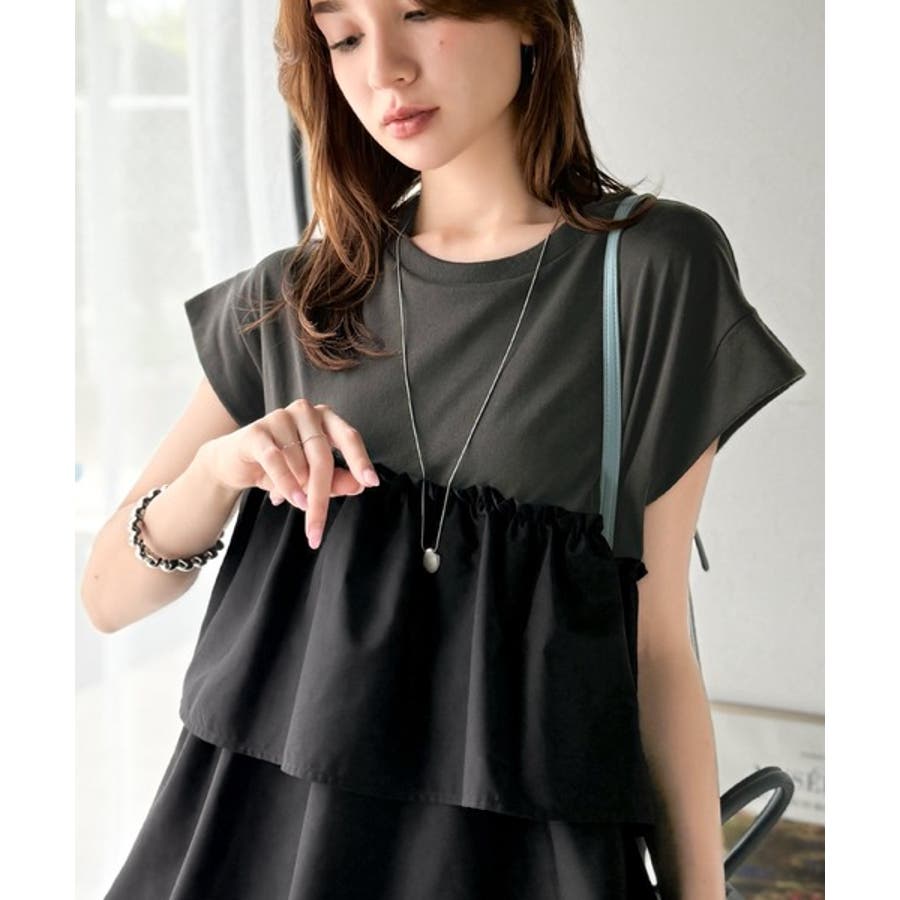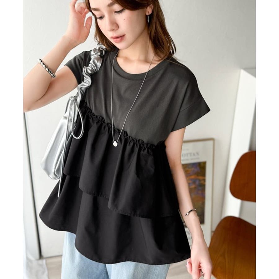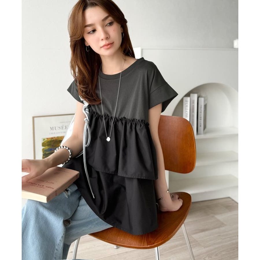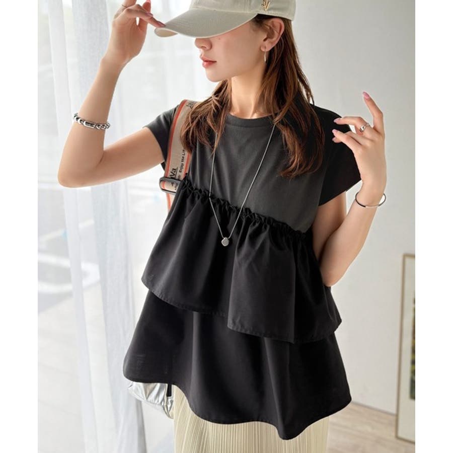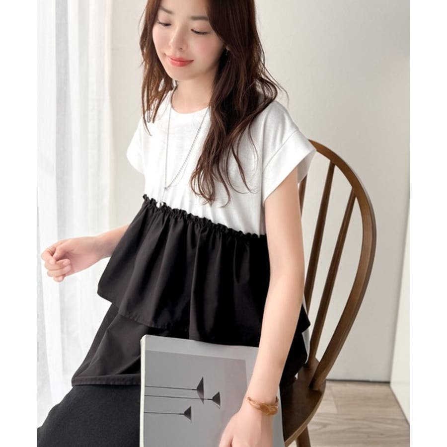 さらっとしたカットソーとふんわりフリルの切り替えデザインが特徴。