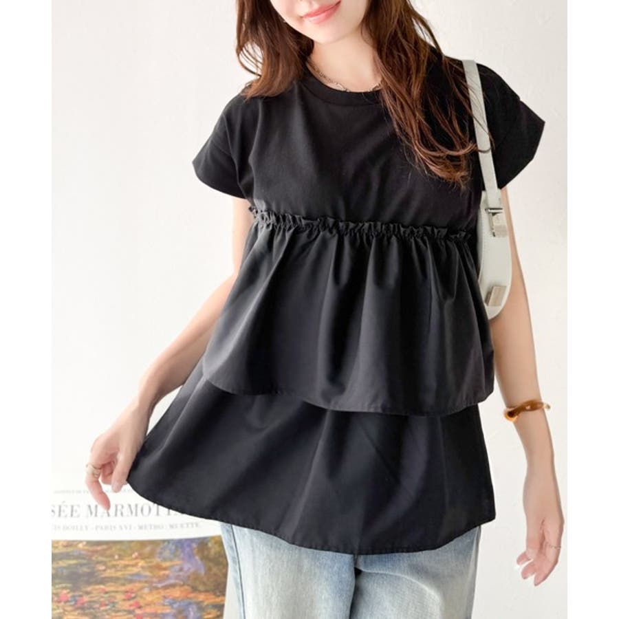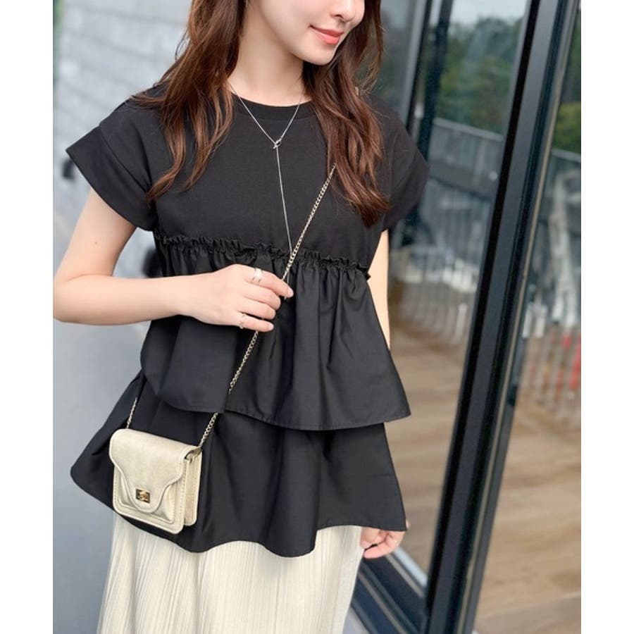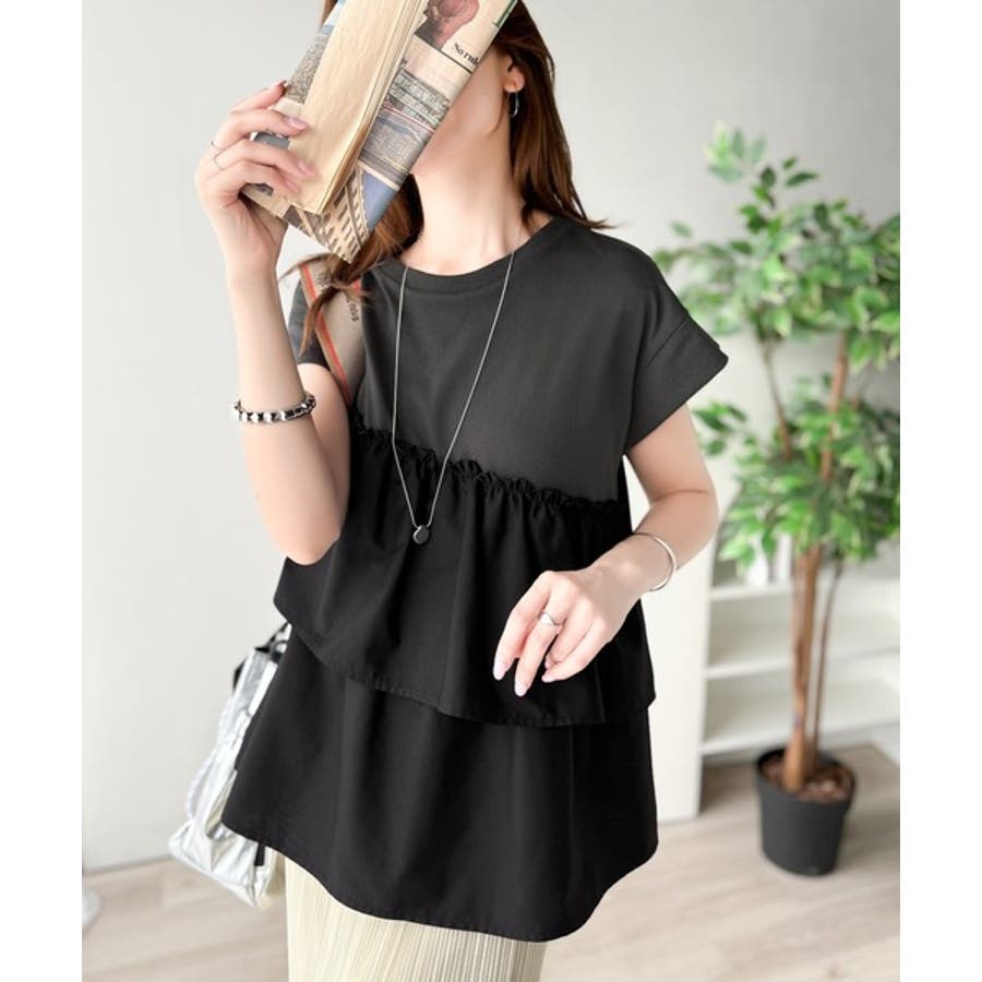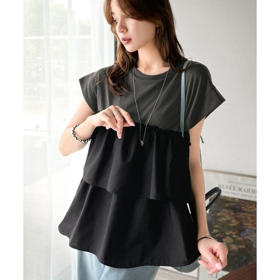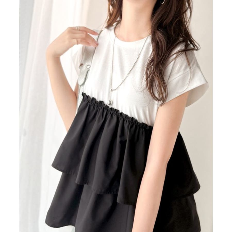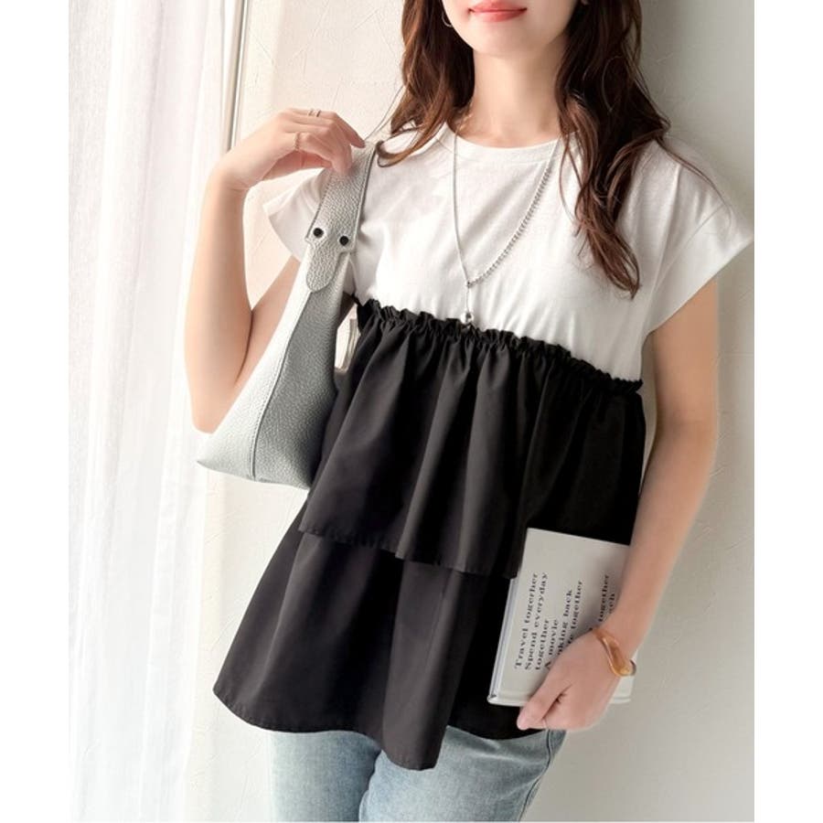 さらっとしたカットソーとふんわりフリルの切り替えデザインが特徴。