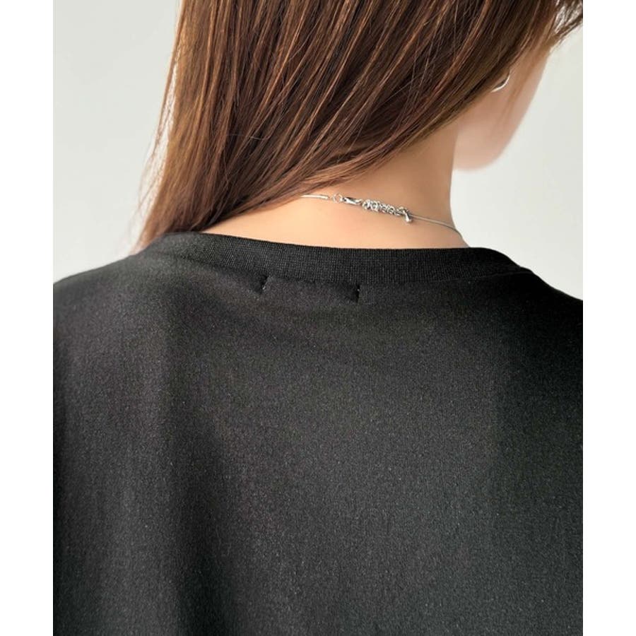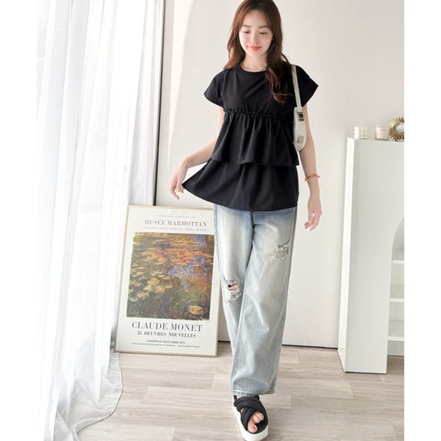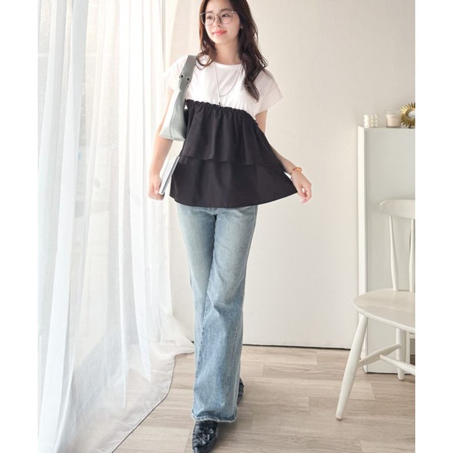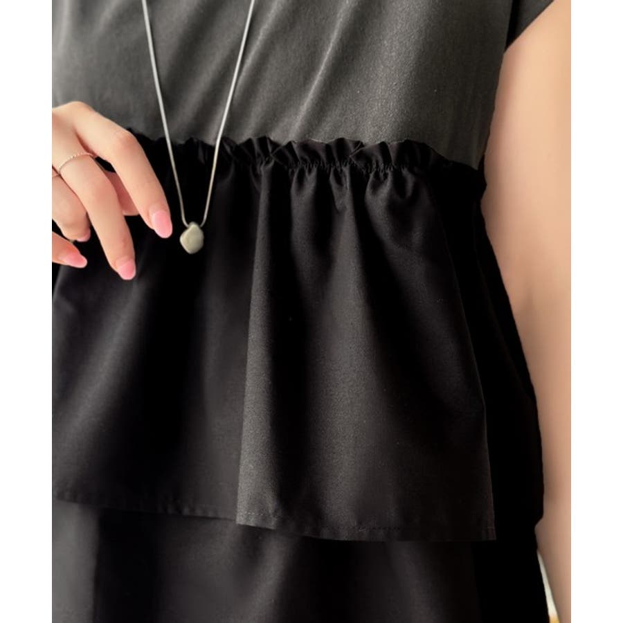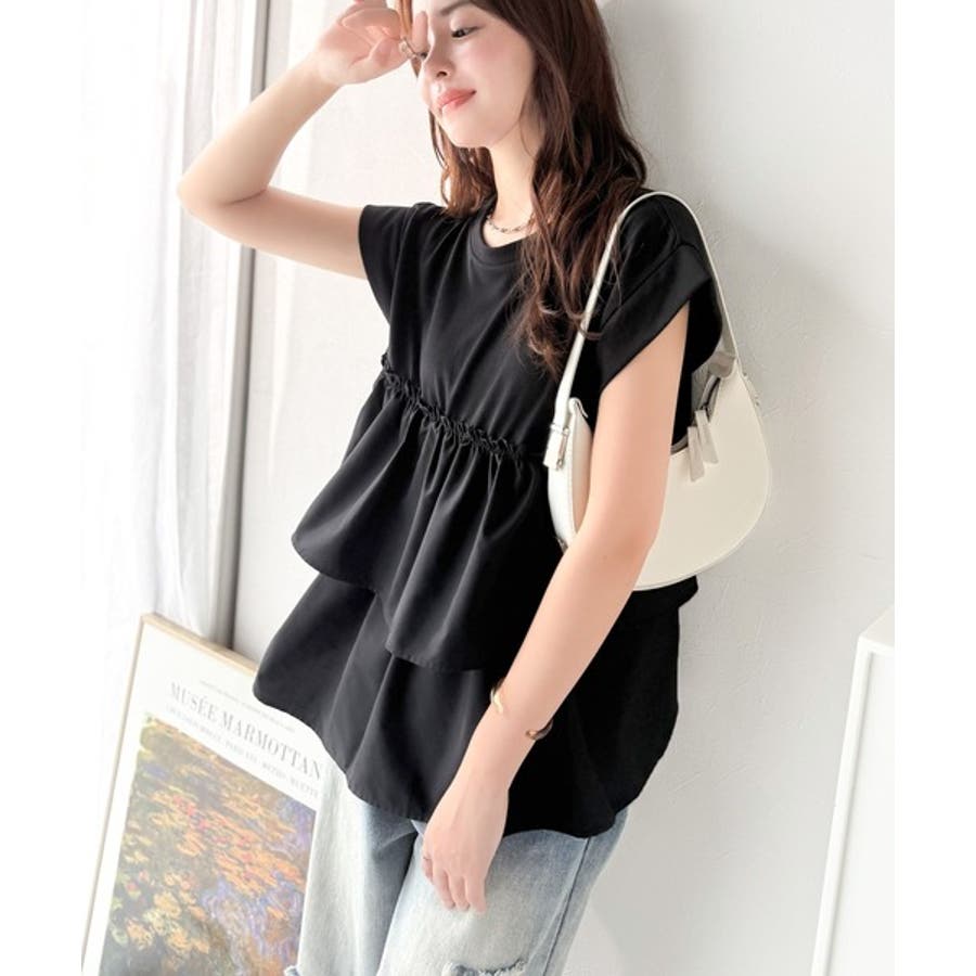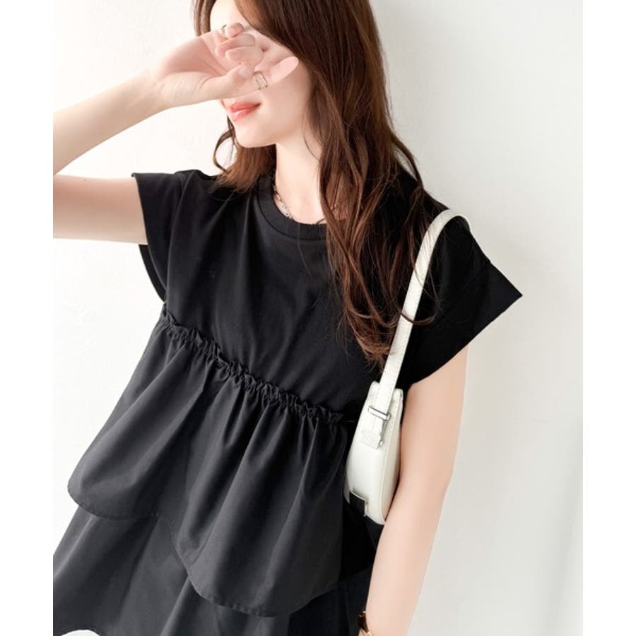 さらっとしたカットソーとふんわりフリルの切り替えデザインが特徴。