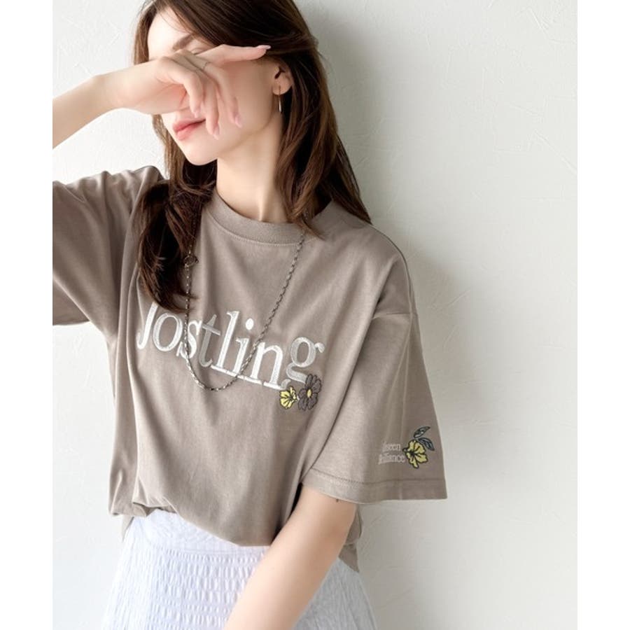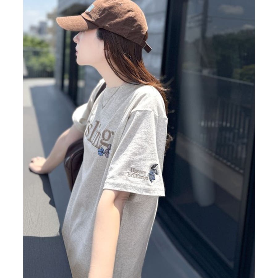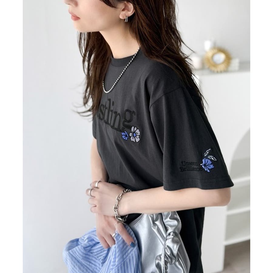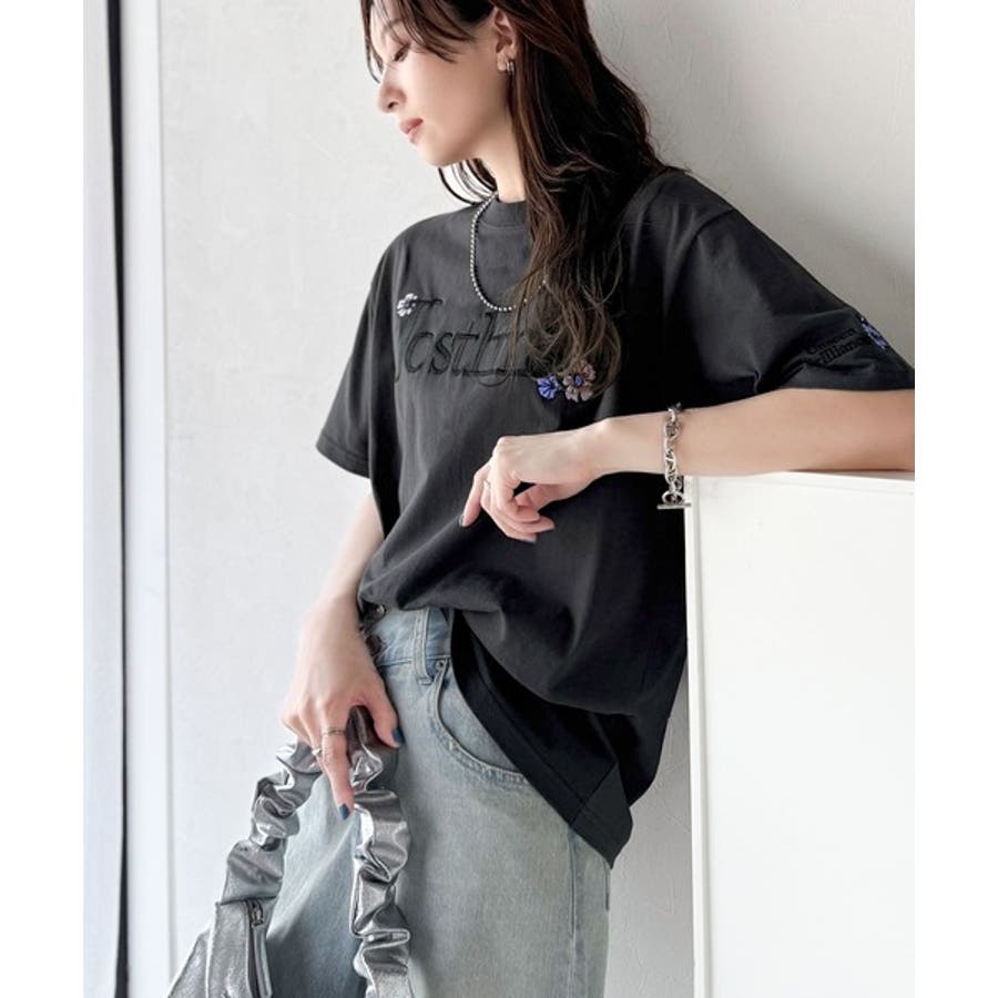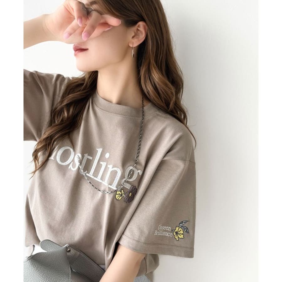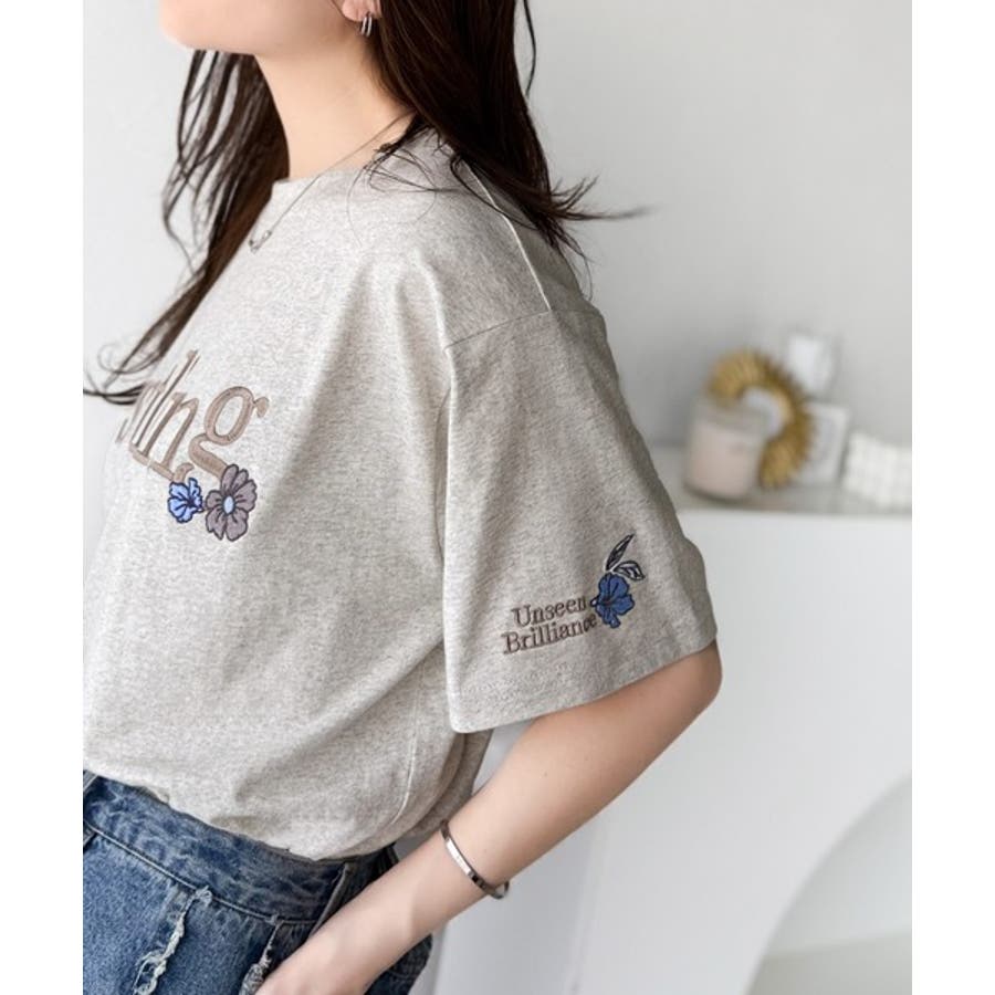ナチュラルな中に、さりげない華。綿100%ロゴ×フラワー刺繍ビッグTシャツ(半袖…