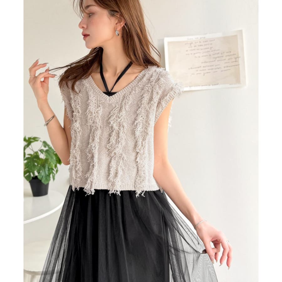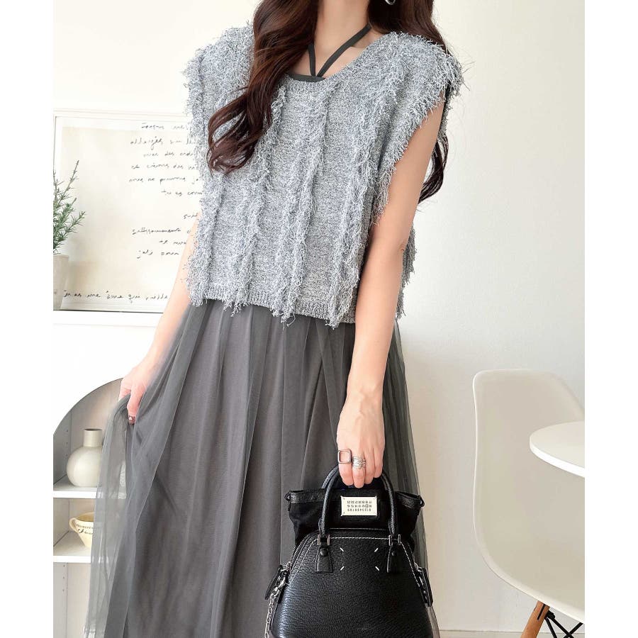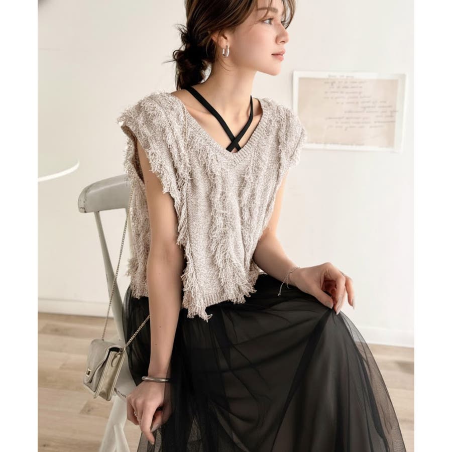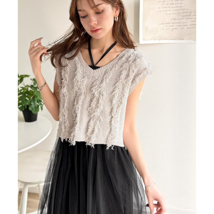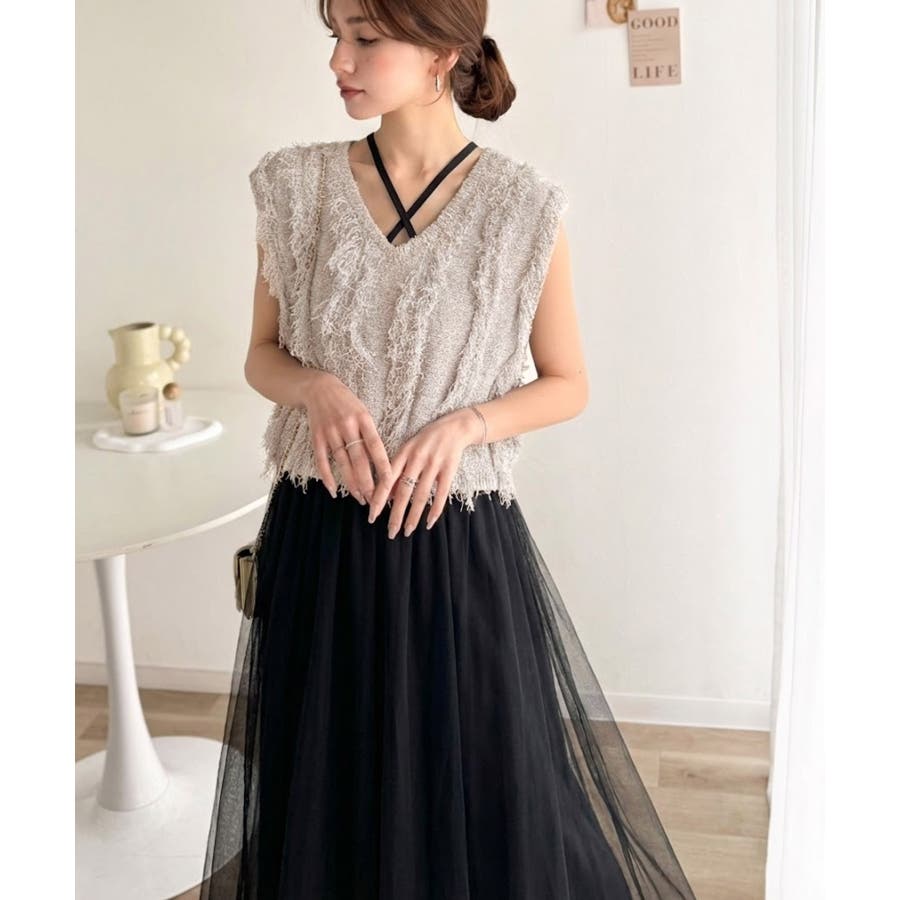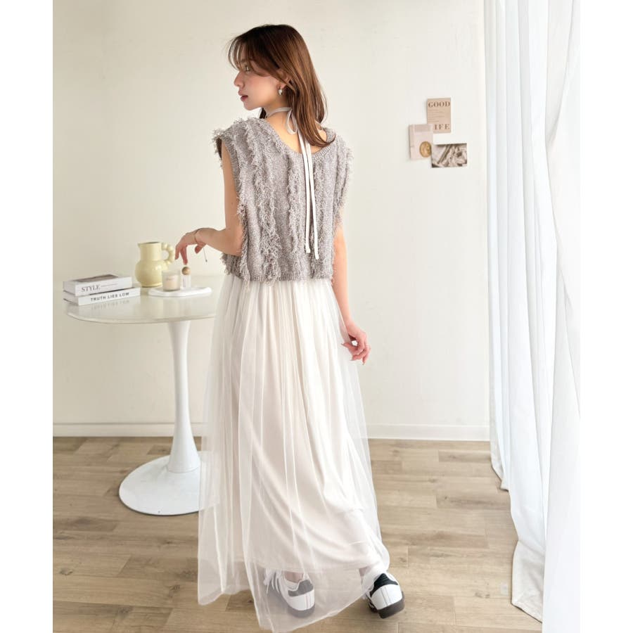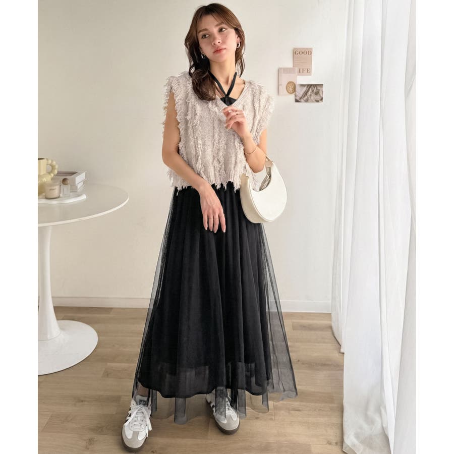フリンジニット×フレアチュールの華やかセットアイテム。