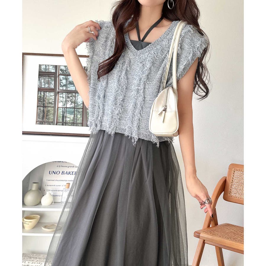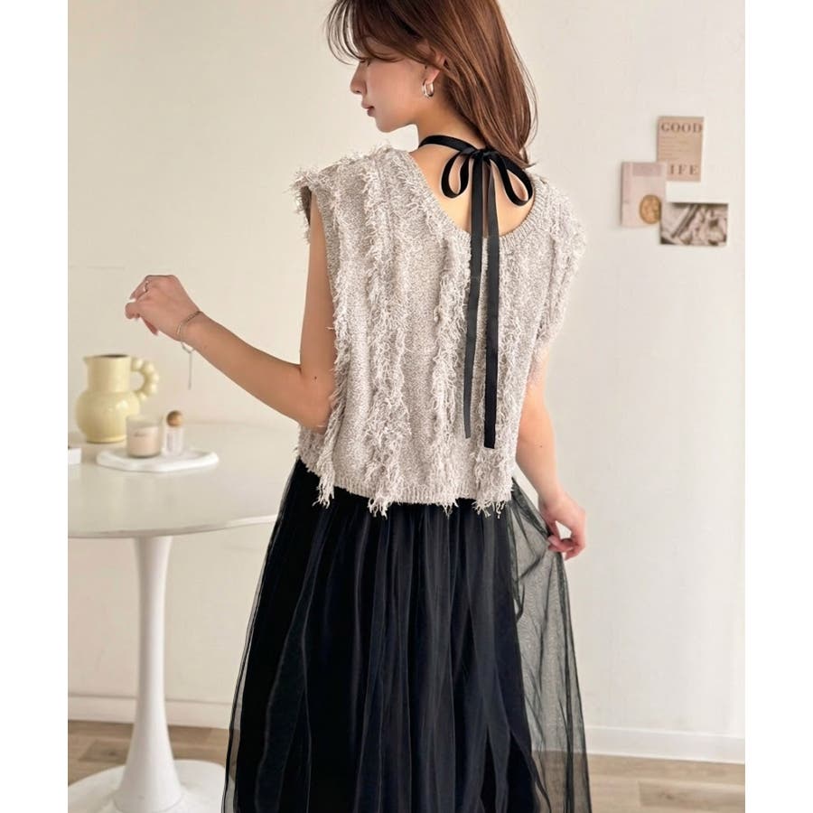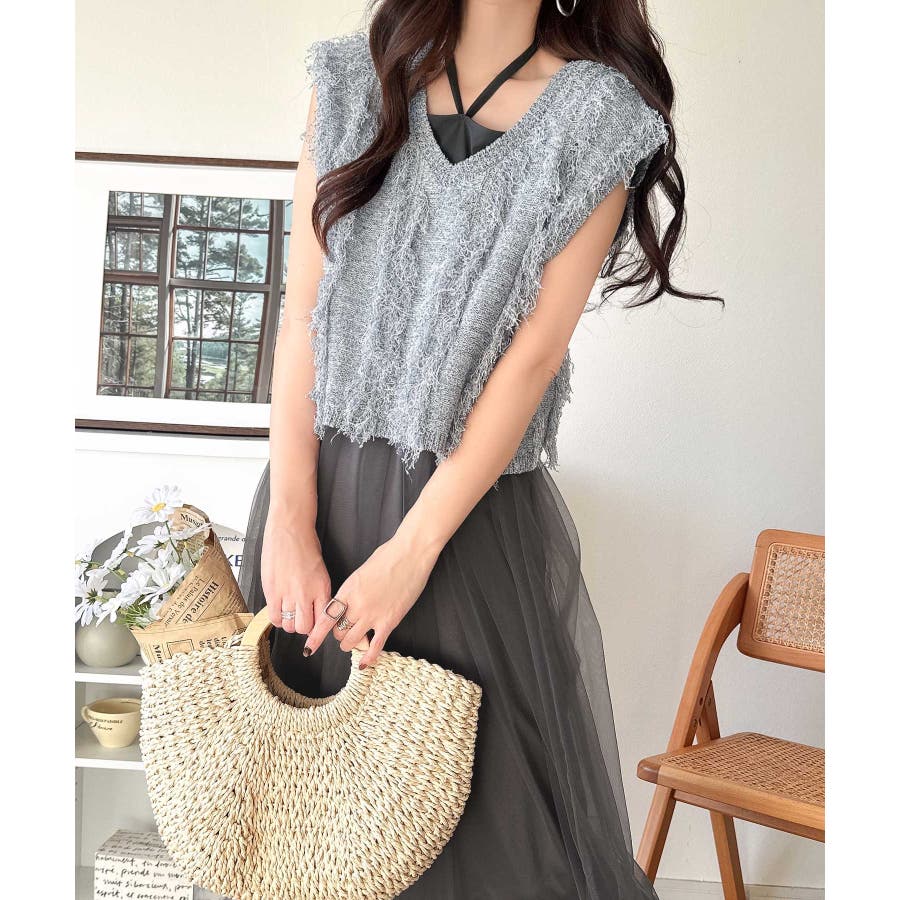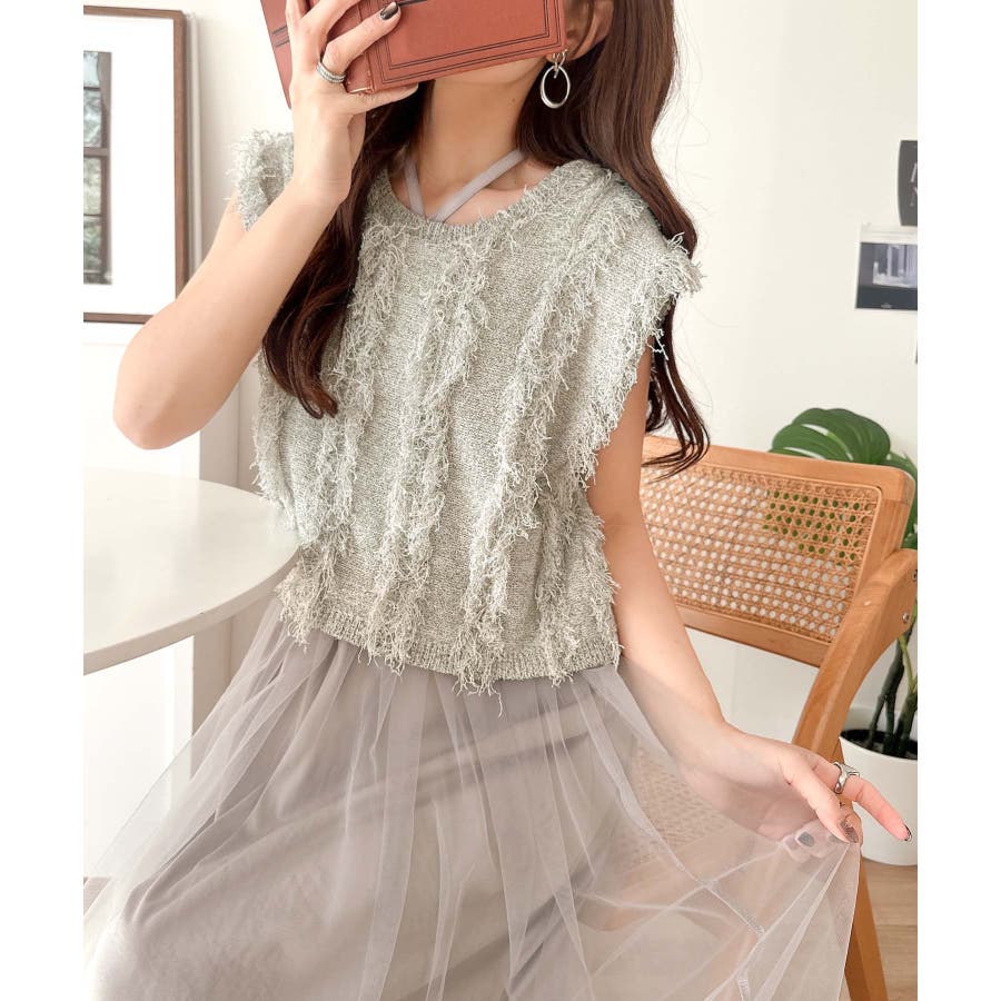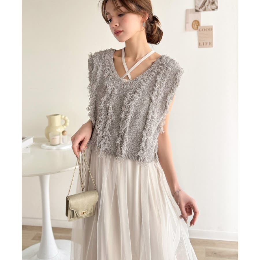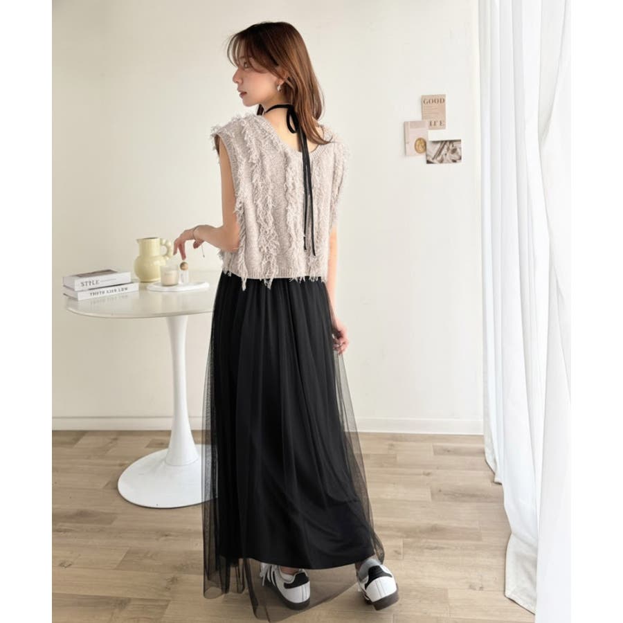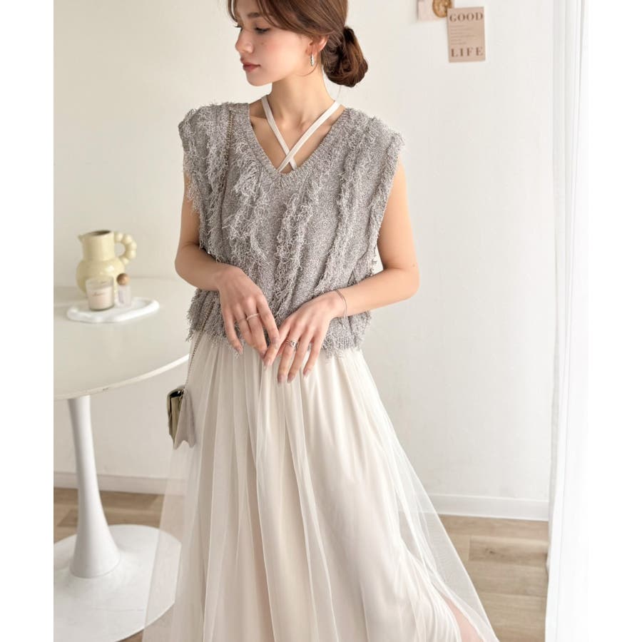 フリンジニット×フレアチュールの華やかセットアイテム。
