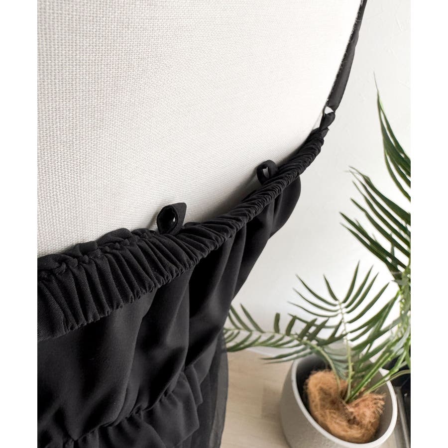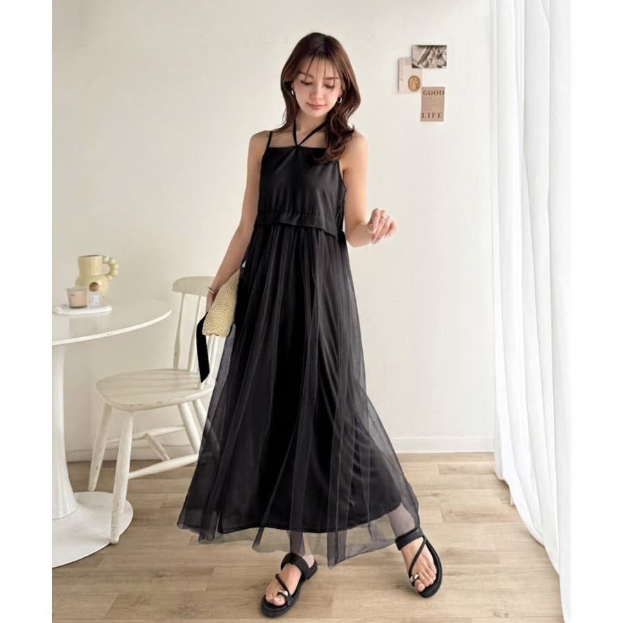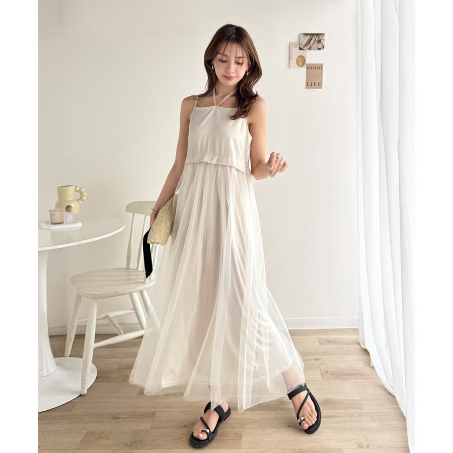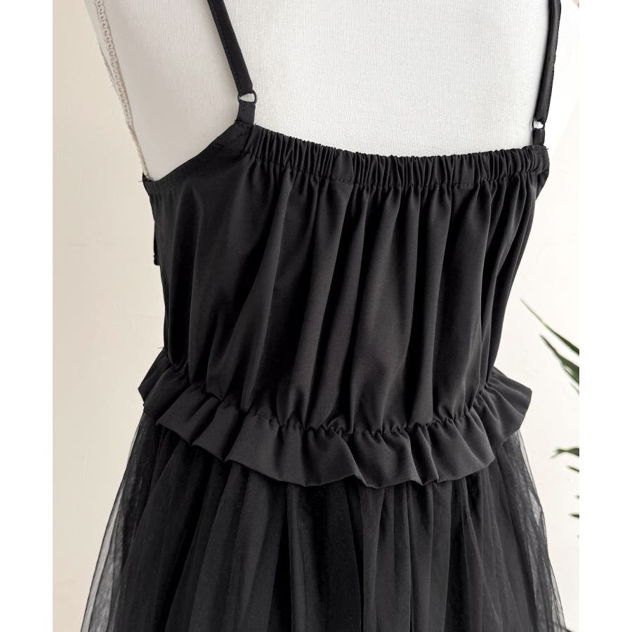 ワンピース:適度に張りのあるタフタ生地と柔らかくて落ち感のあるチュール生地のコンビ素材。
