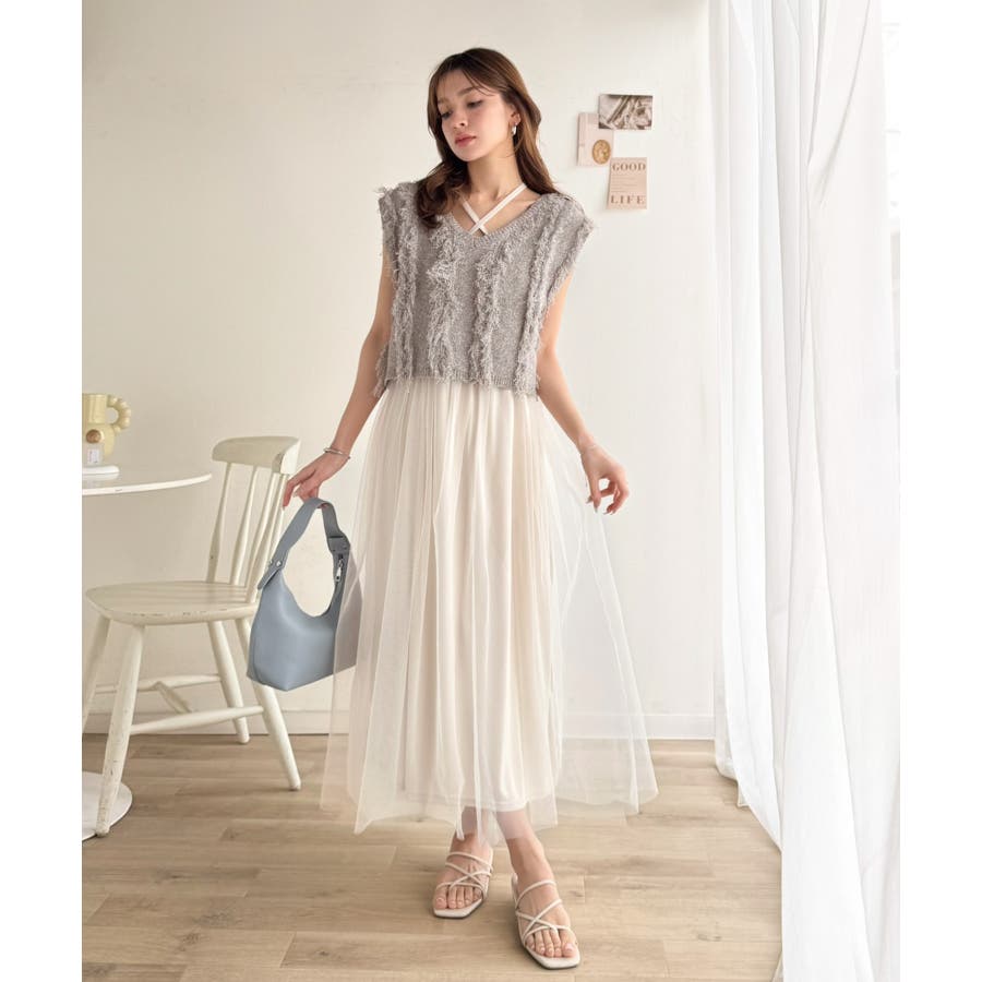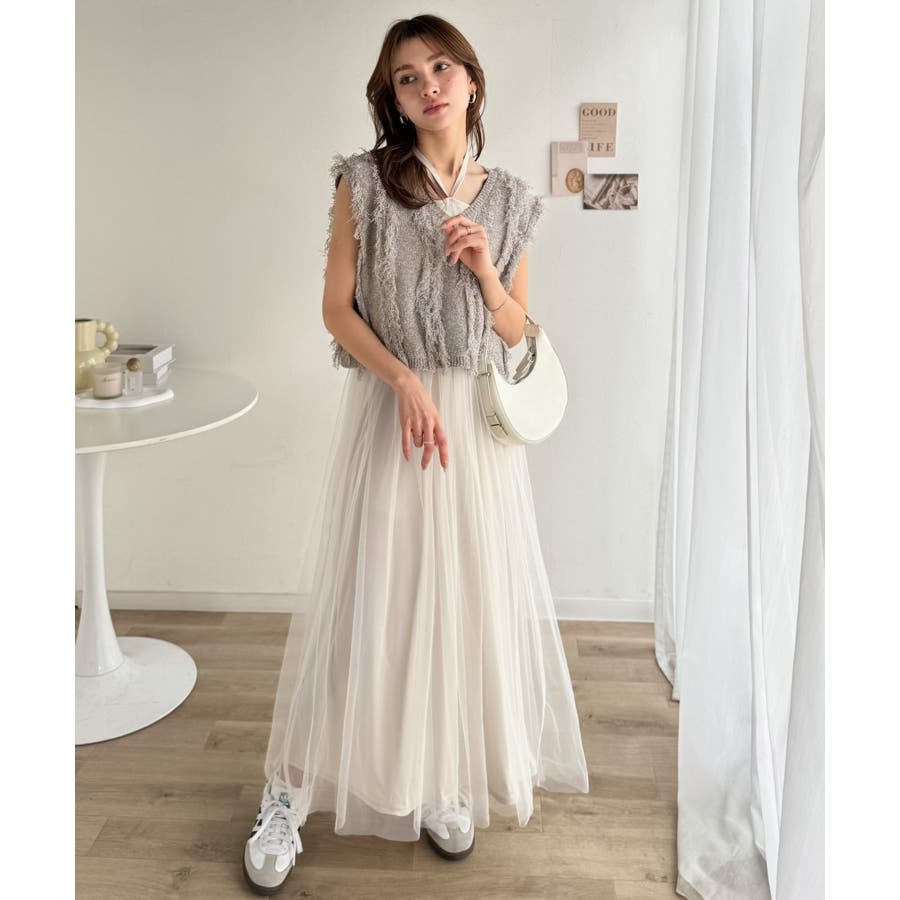 ヘルシーな肌見せが叶うフリンジニットと愛らしいチュールワンピースのセット。
