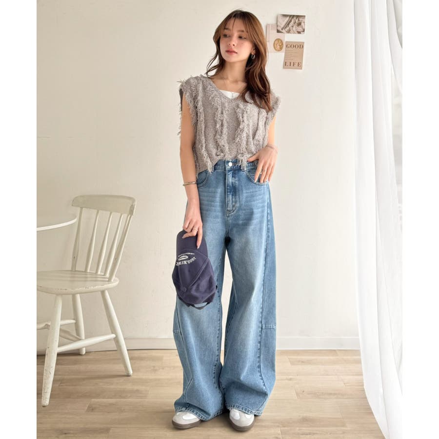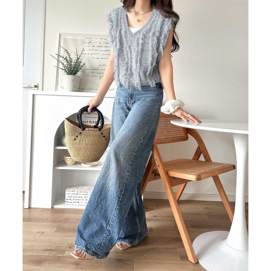 ニットベストにはデニムやワイドパンツを合わせればトレンドコーデに☆
