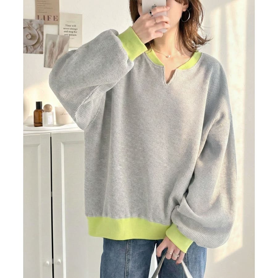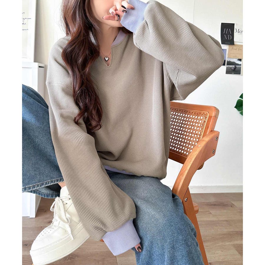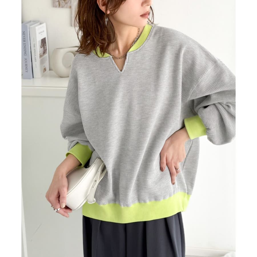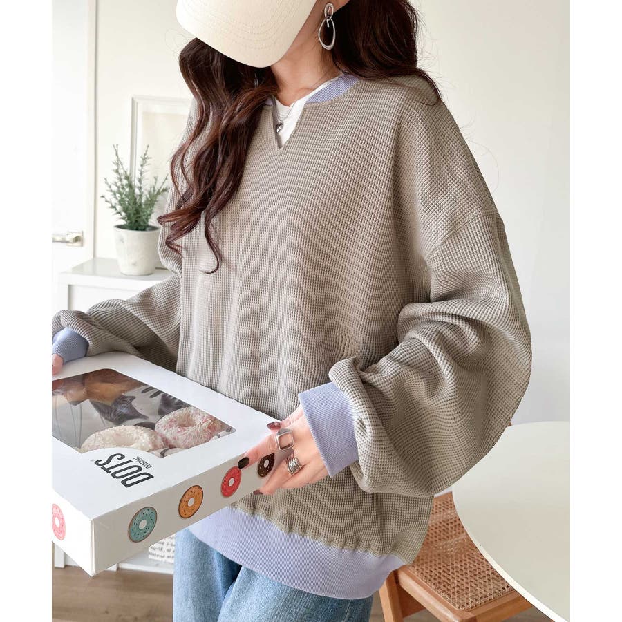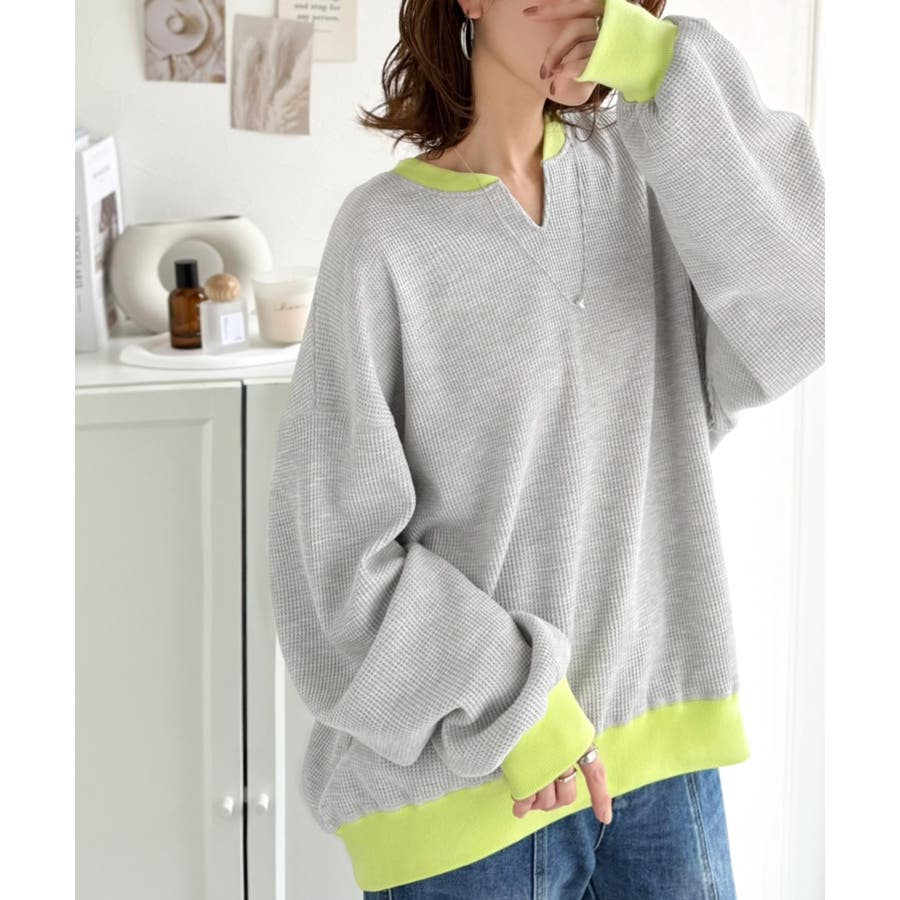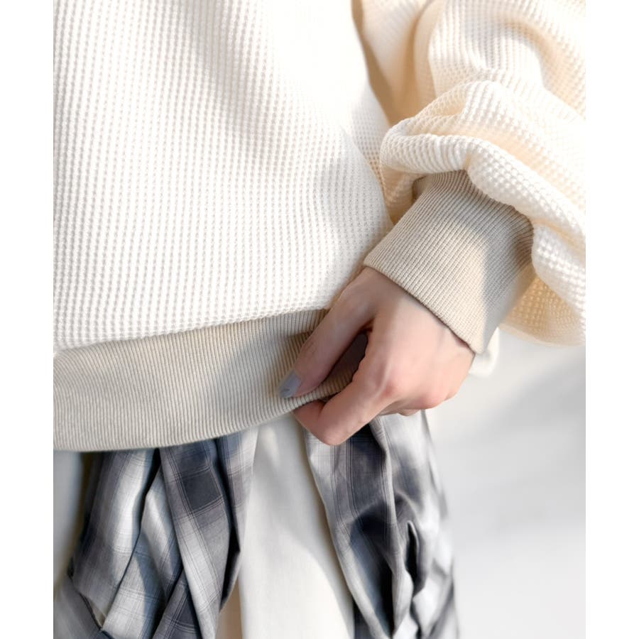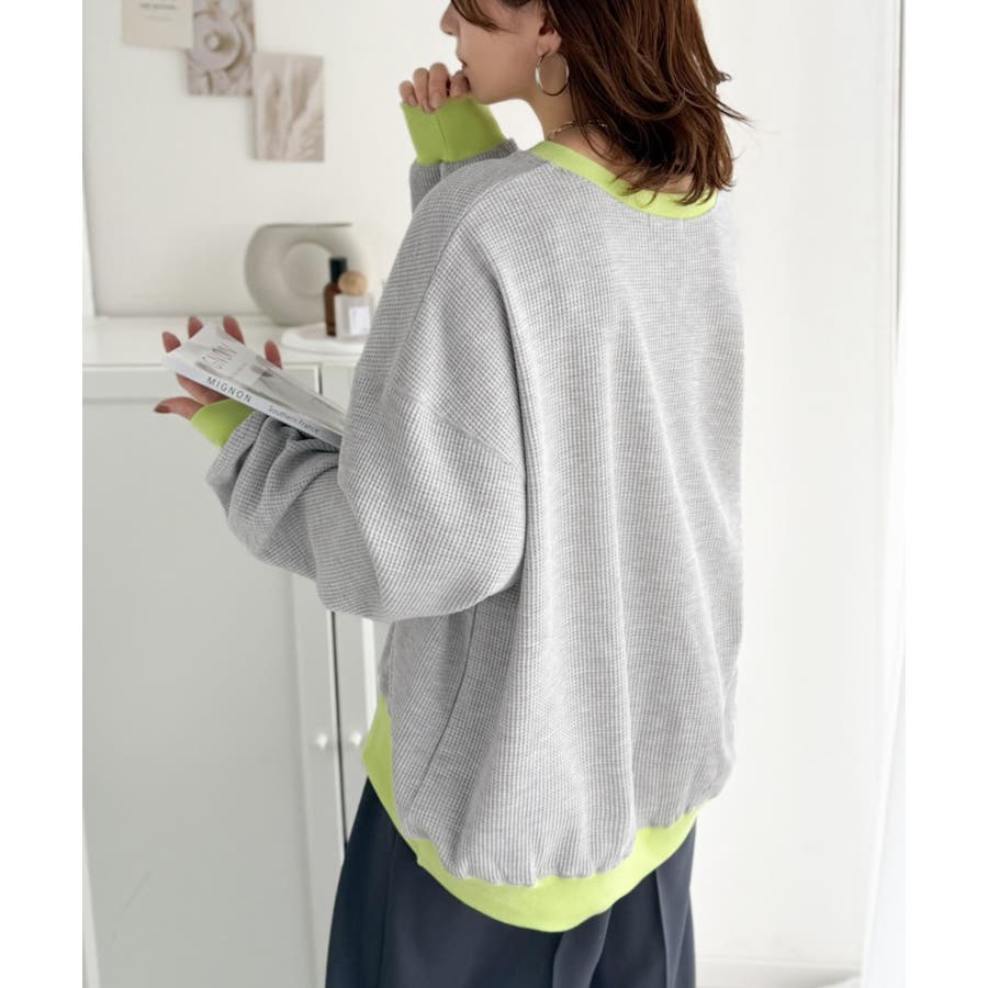 しっかりとしたワッフル素材で、配色リブのゆったり系プルオーバー