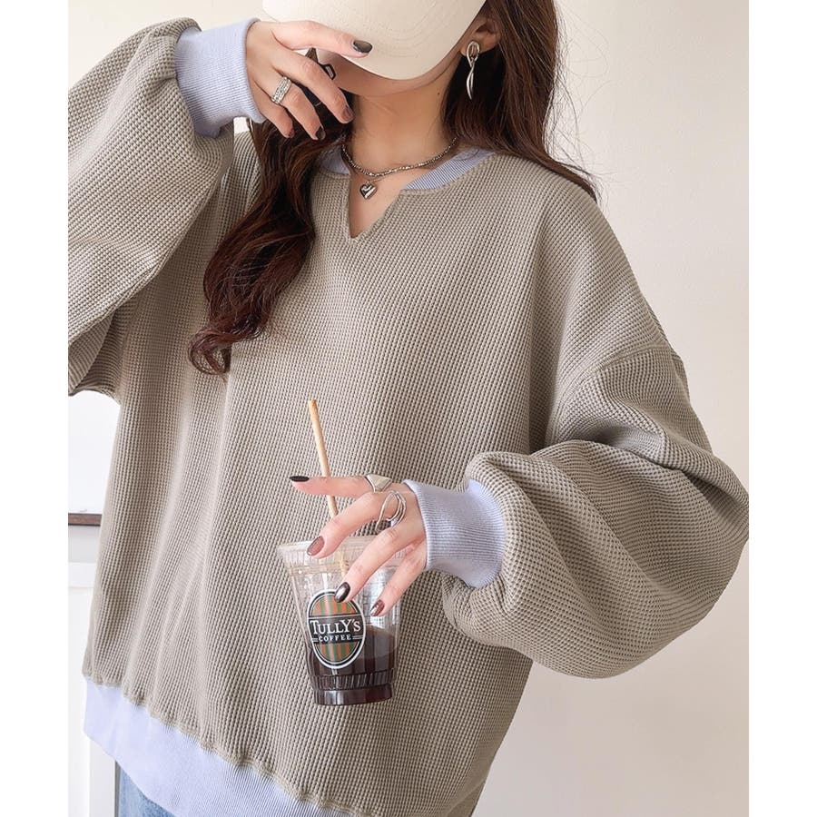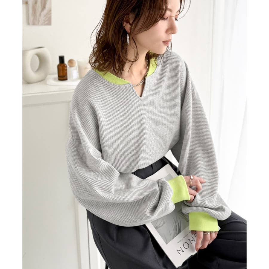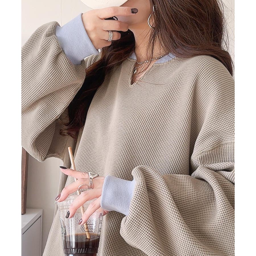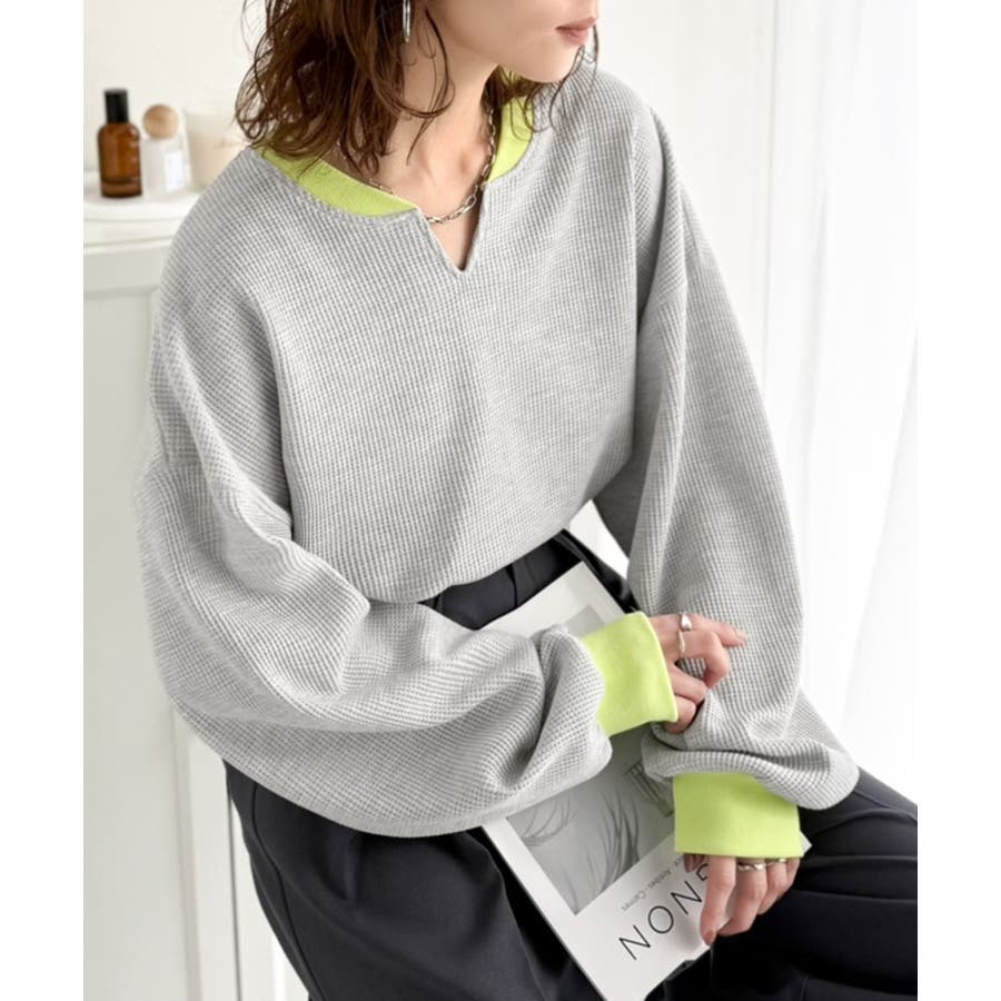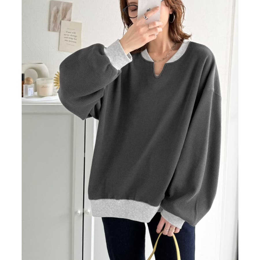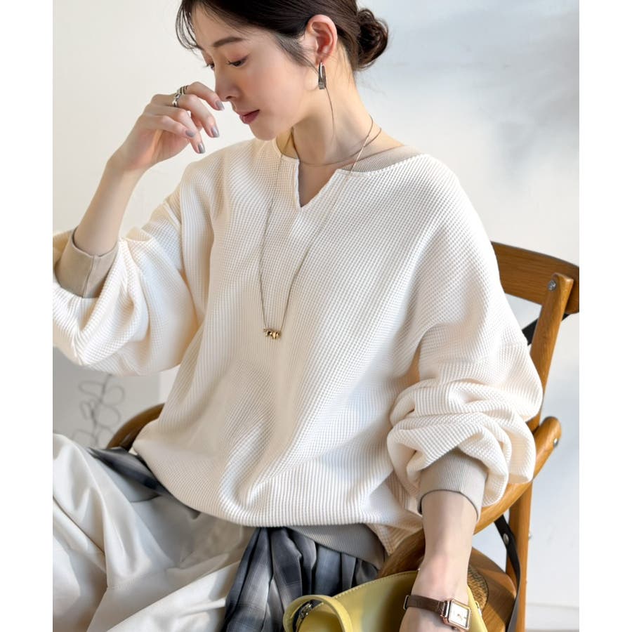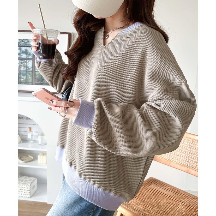 しっかりとしたワッフル素材で、配色リブのゆったり系プルオーバー
