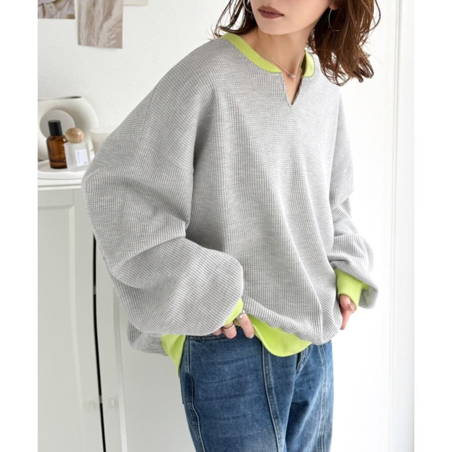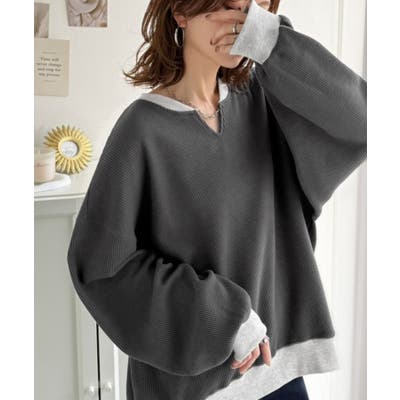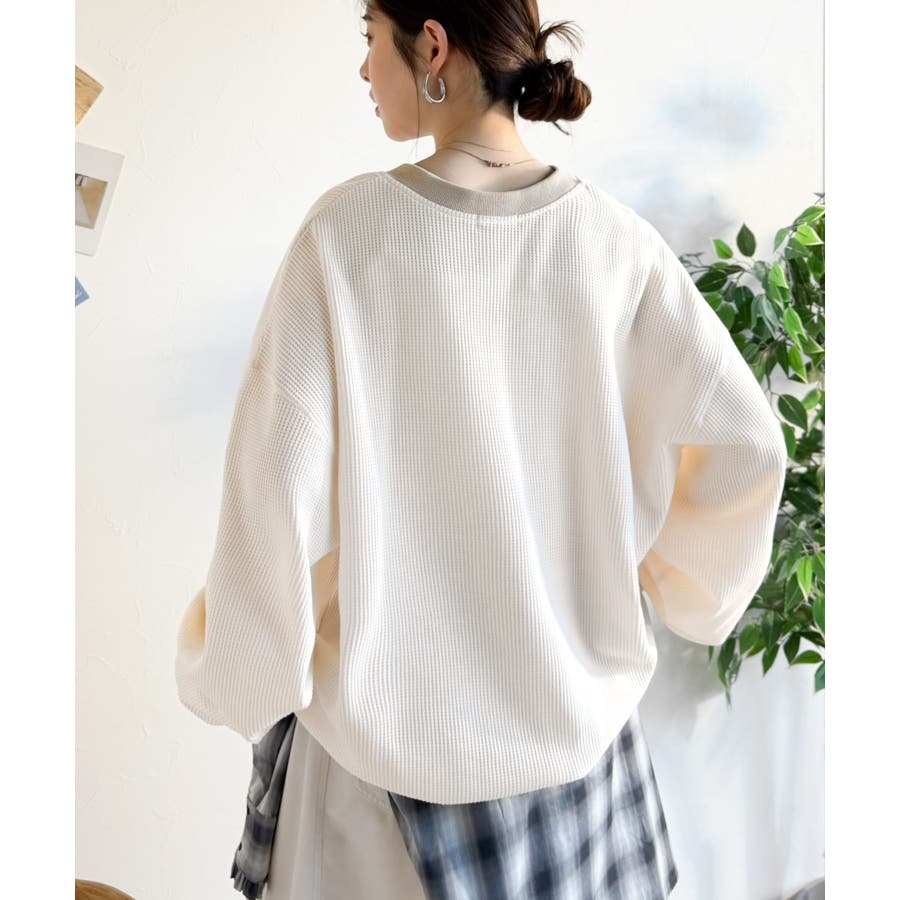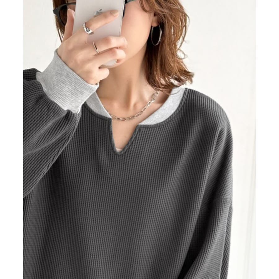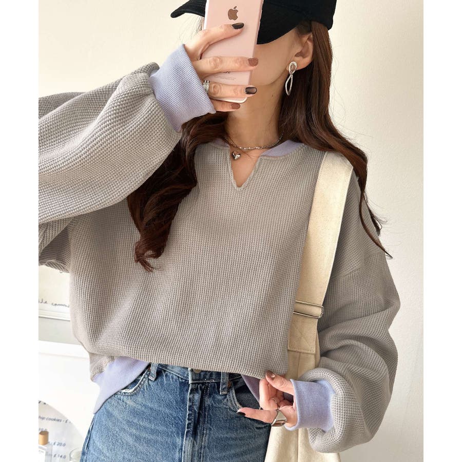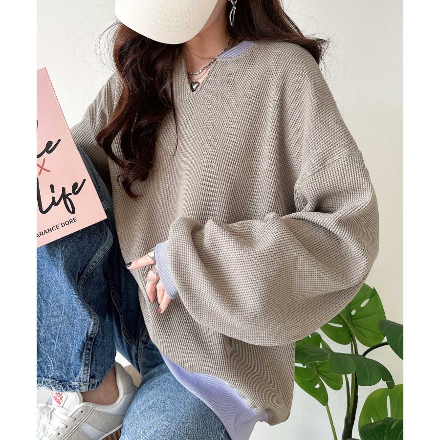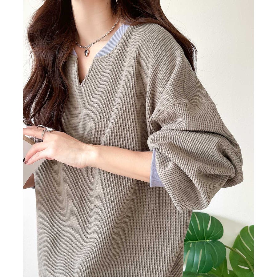 しっかりとしたワッフル素材で、配色リブのゆったり系プルオーバー