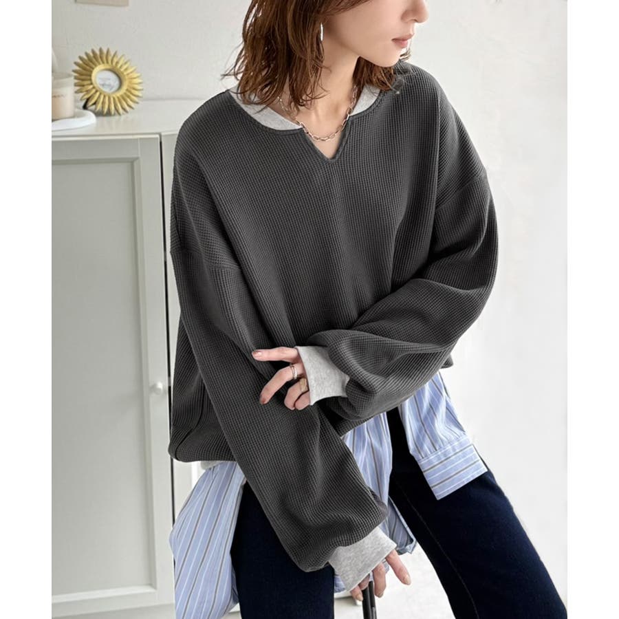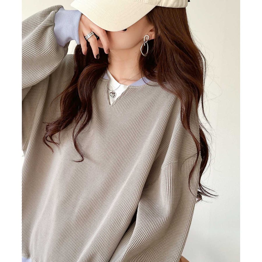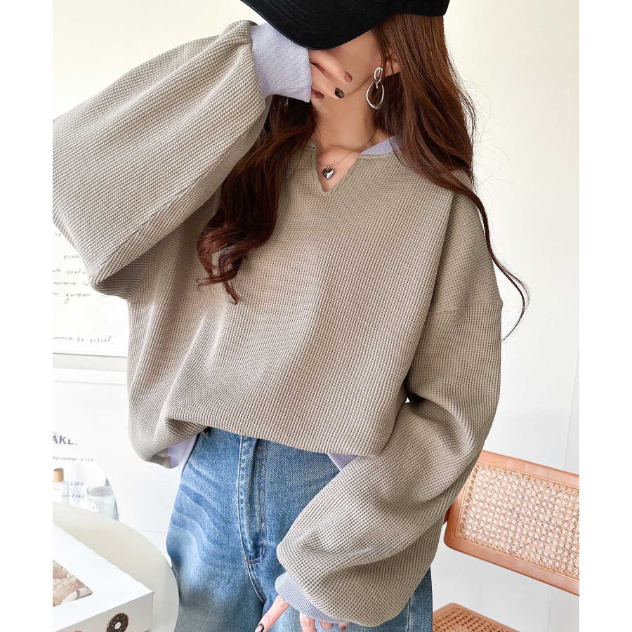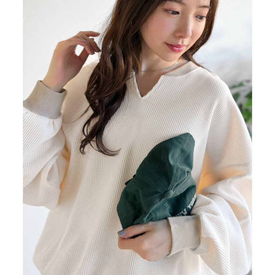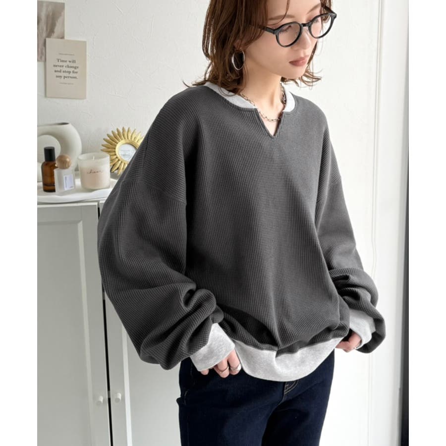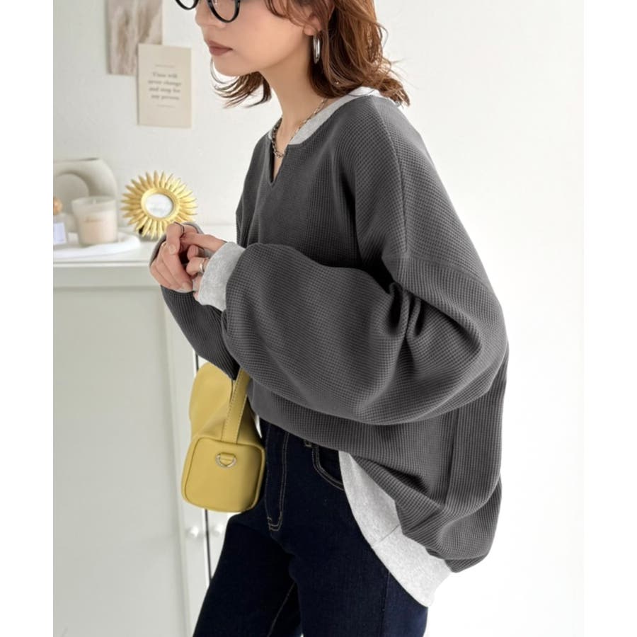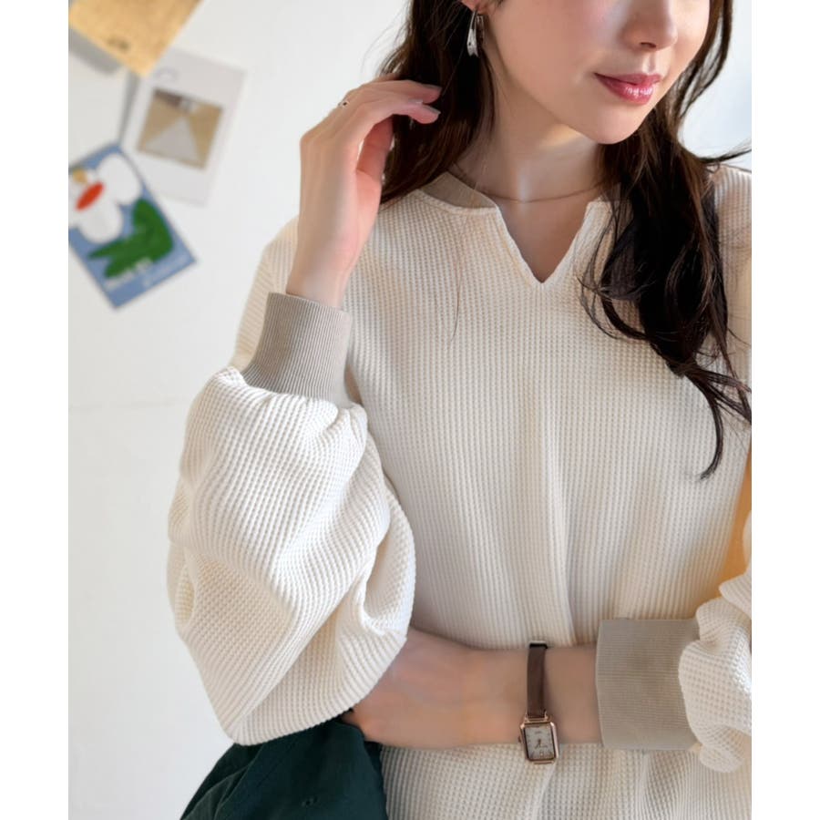 しっかりとしたワッフル素材で、配色リブのゆったり系プルオーバー