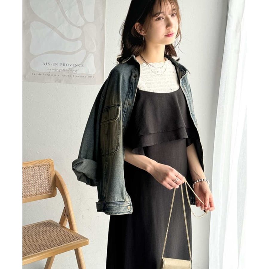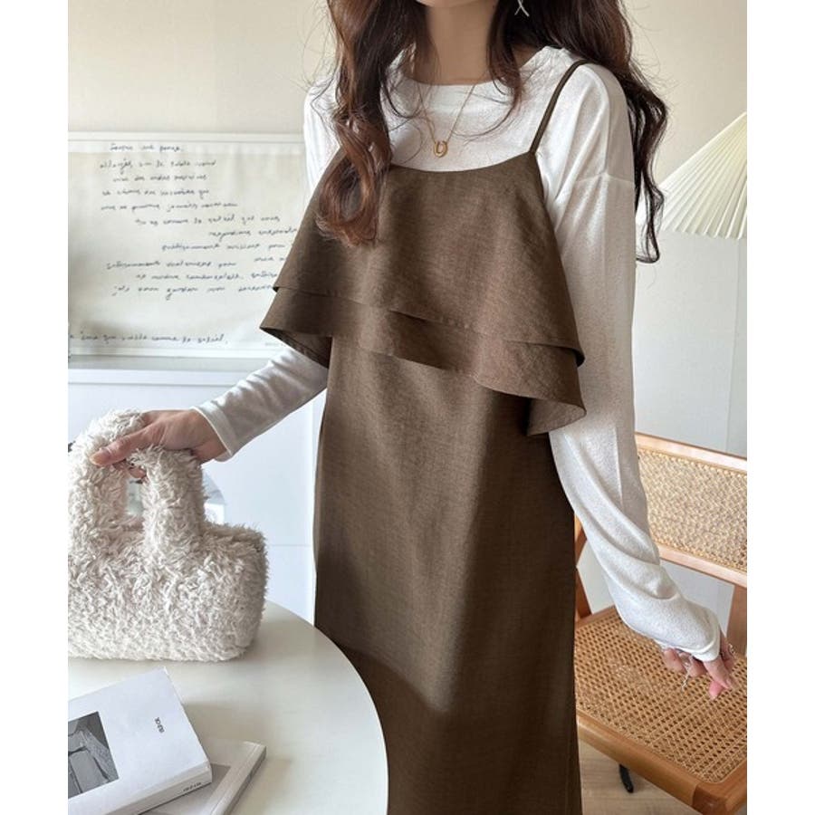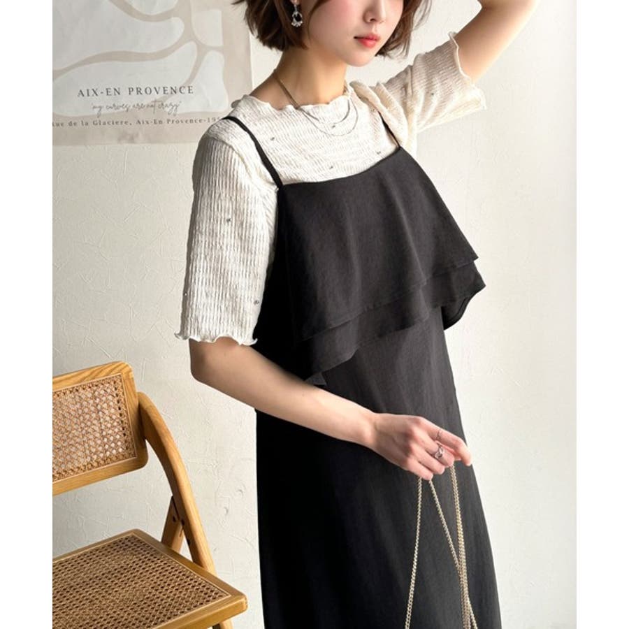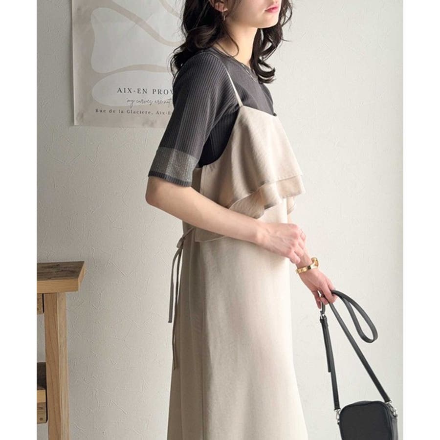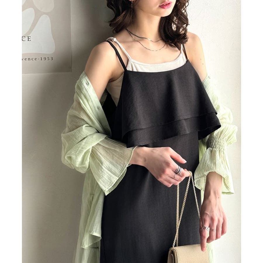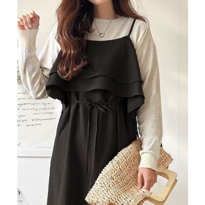 フリルがポイントのこのキャミワンピースはベーシックカラーでインナーを選ばず合わせることができ