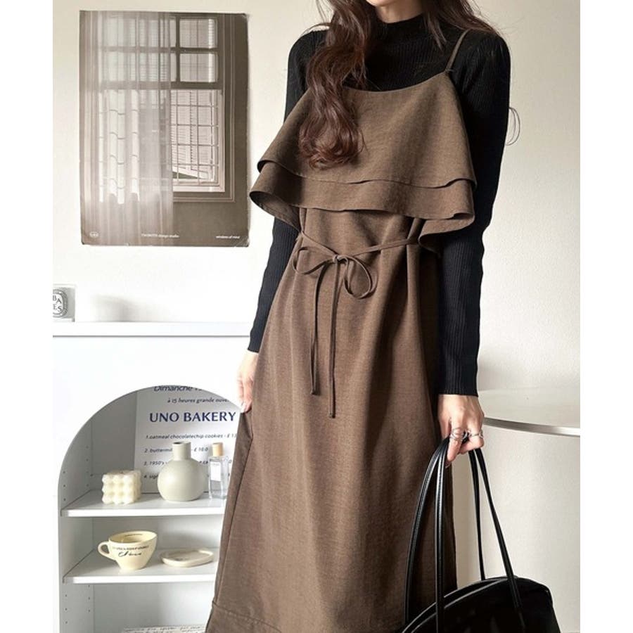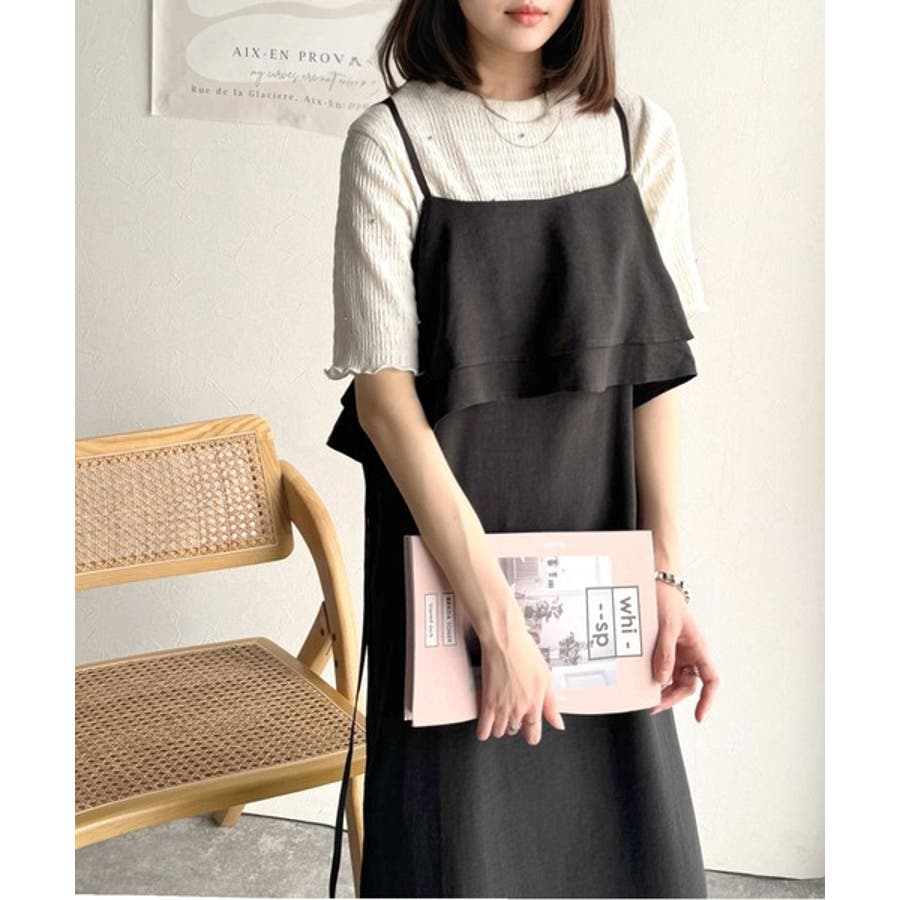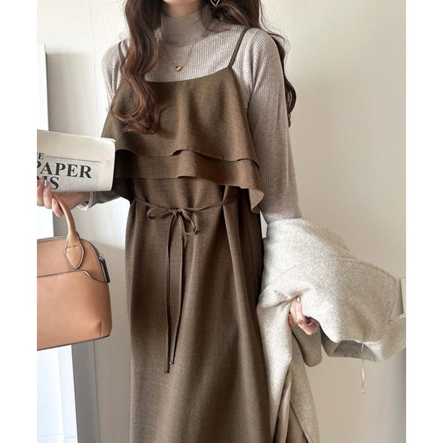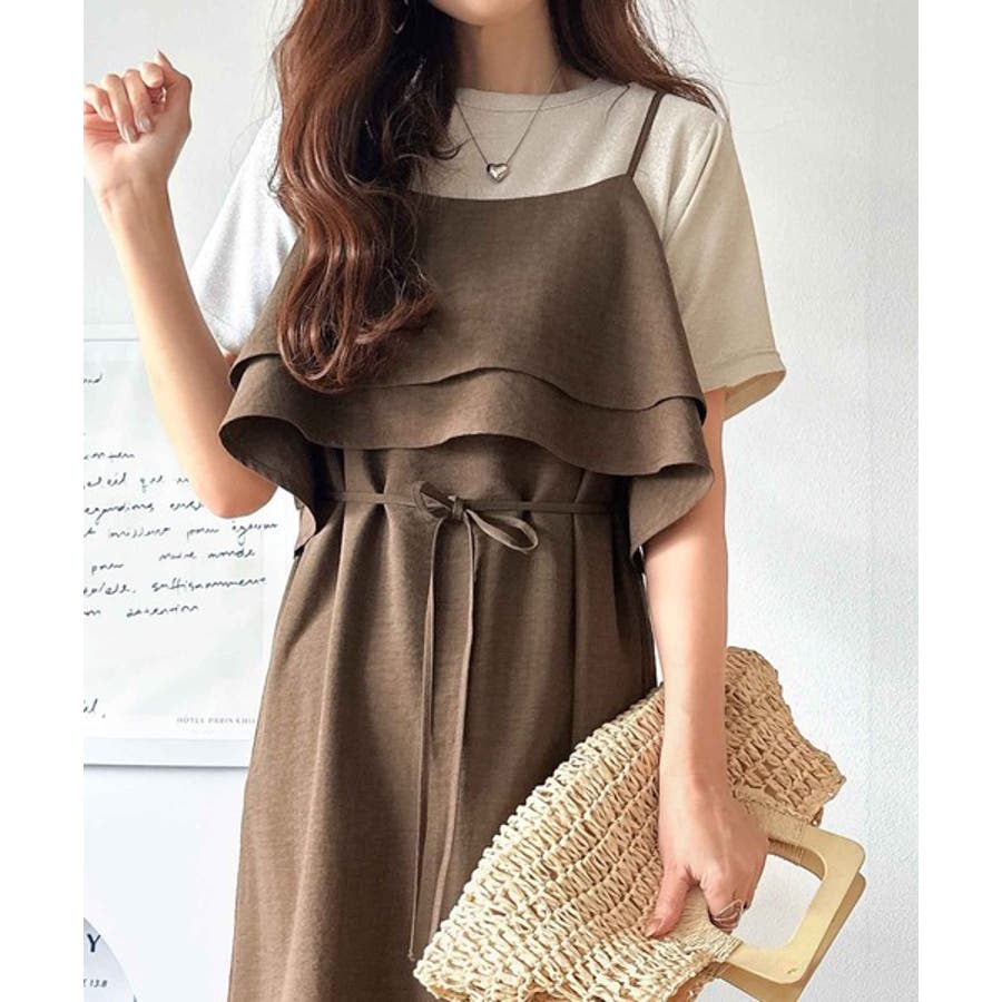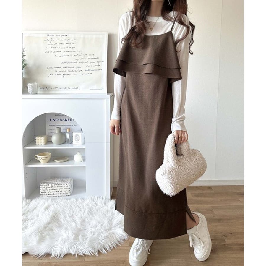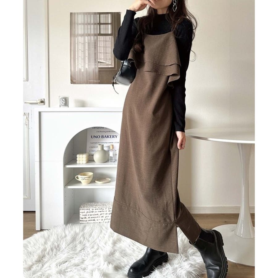 フリルがポイントのこのキャミワンピースはベーシックカラーでインナーを選ばず合わせることができ