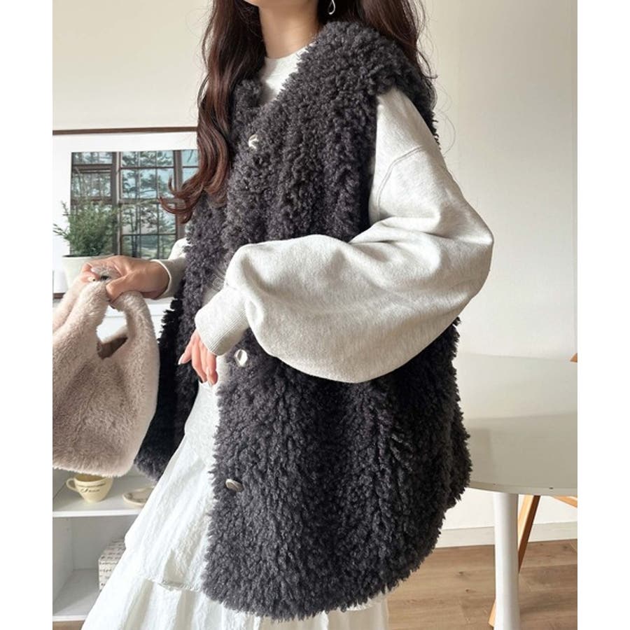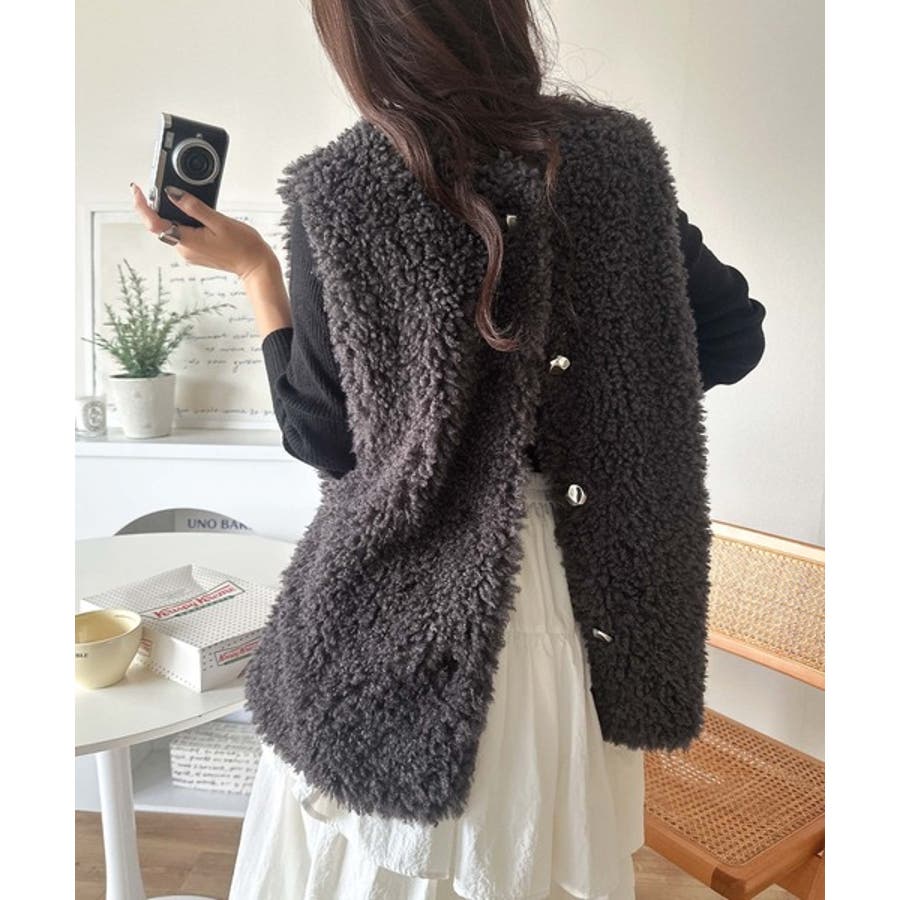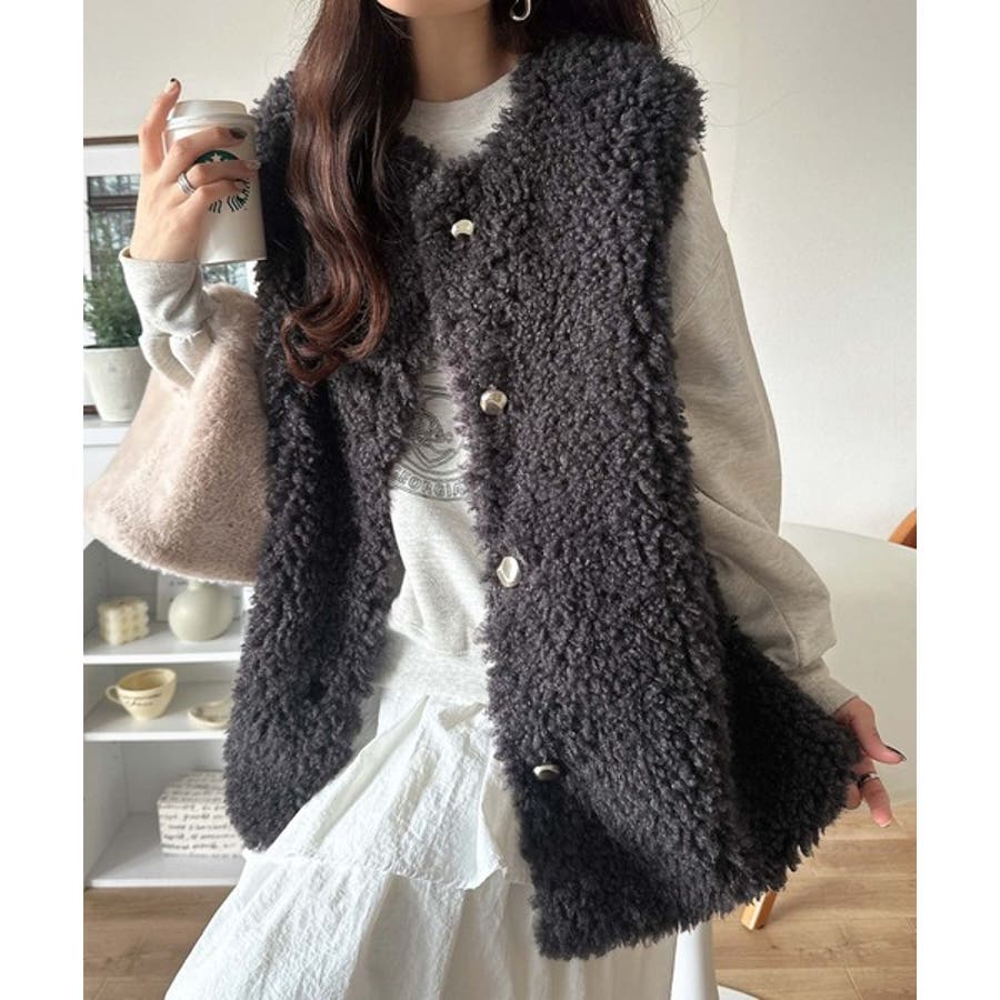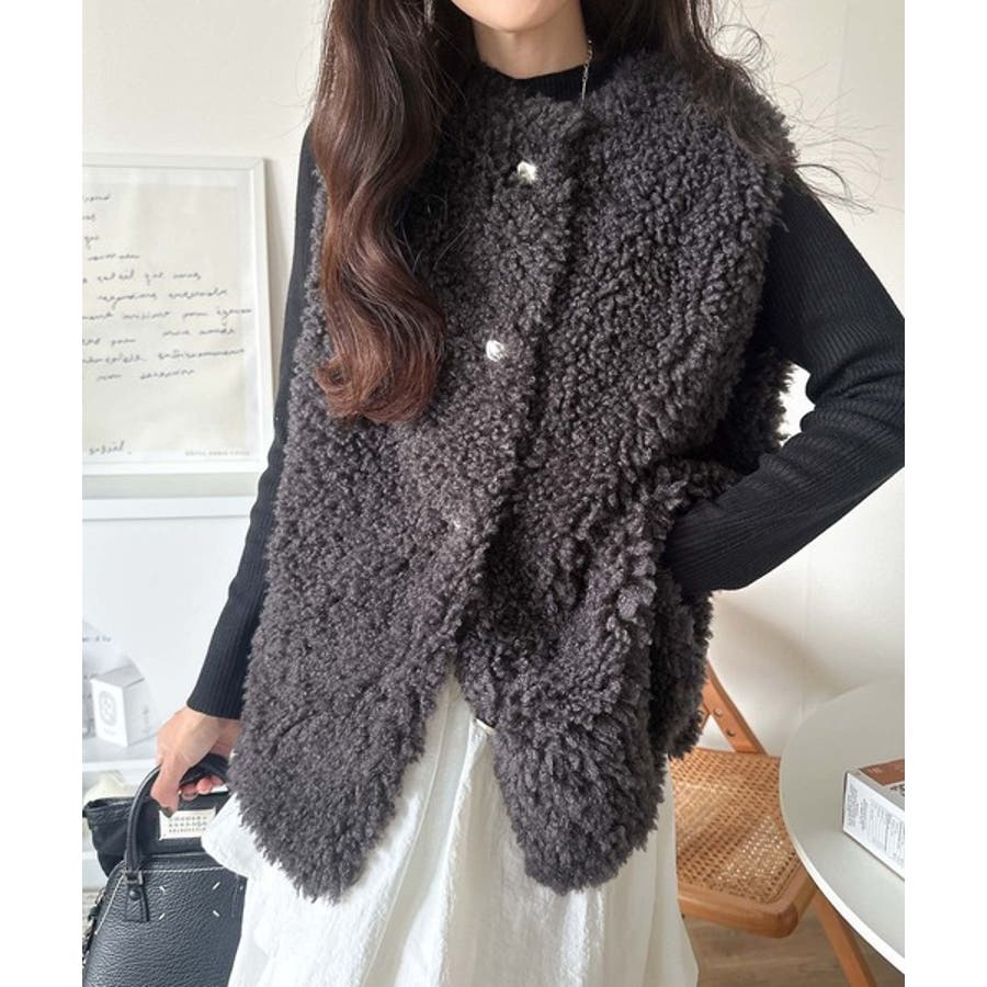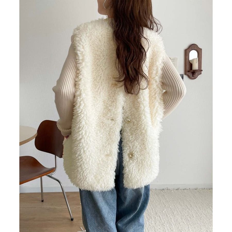 ふわふわのプードルボア素材で仕立てた、見た目も暖かさも文句なしの2wayベスト。前後どちらでも着られるデザインで気分やコーデに合わせて印象チェンジが楽しめます。ゴールドボタンが上品な華やかさを添え、ほどよくきちんと感のある大人コーデに。スリット入りで抜け感と動きやすさはもちろん、リブニットやワンピとレイヤードが出来て着回し力も抜群。パンツ合わせでラフに、スカートやブーツと合わせてフェミニンにも振れる万能アイテムです。