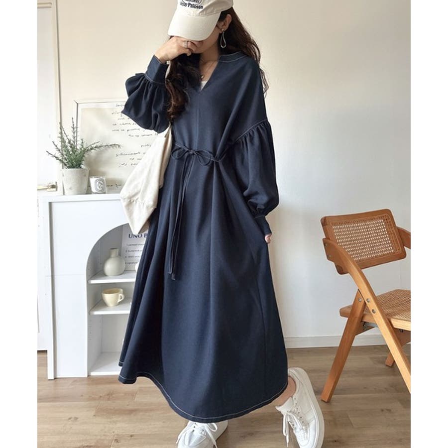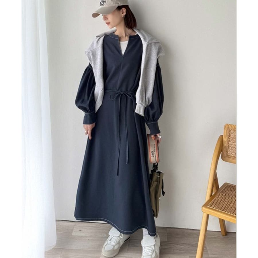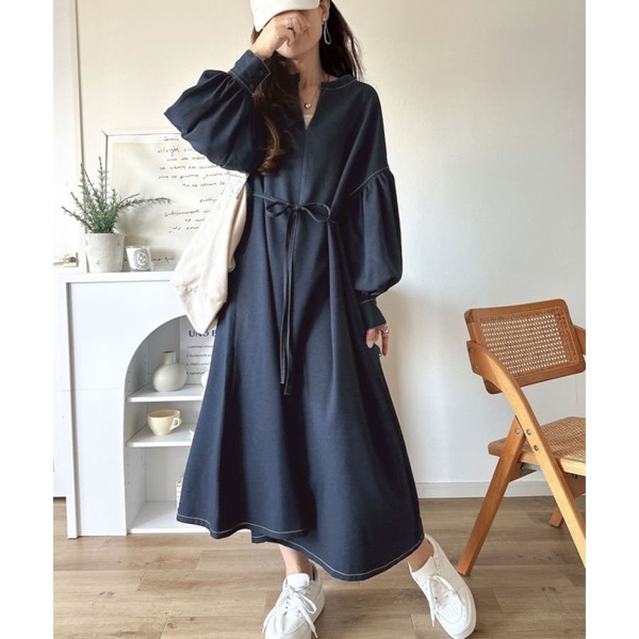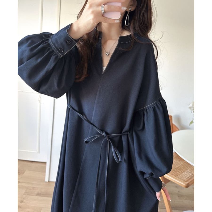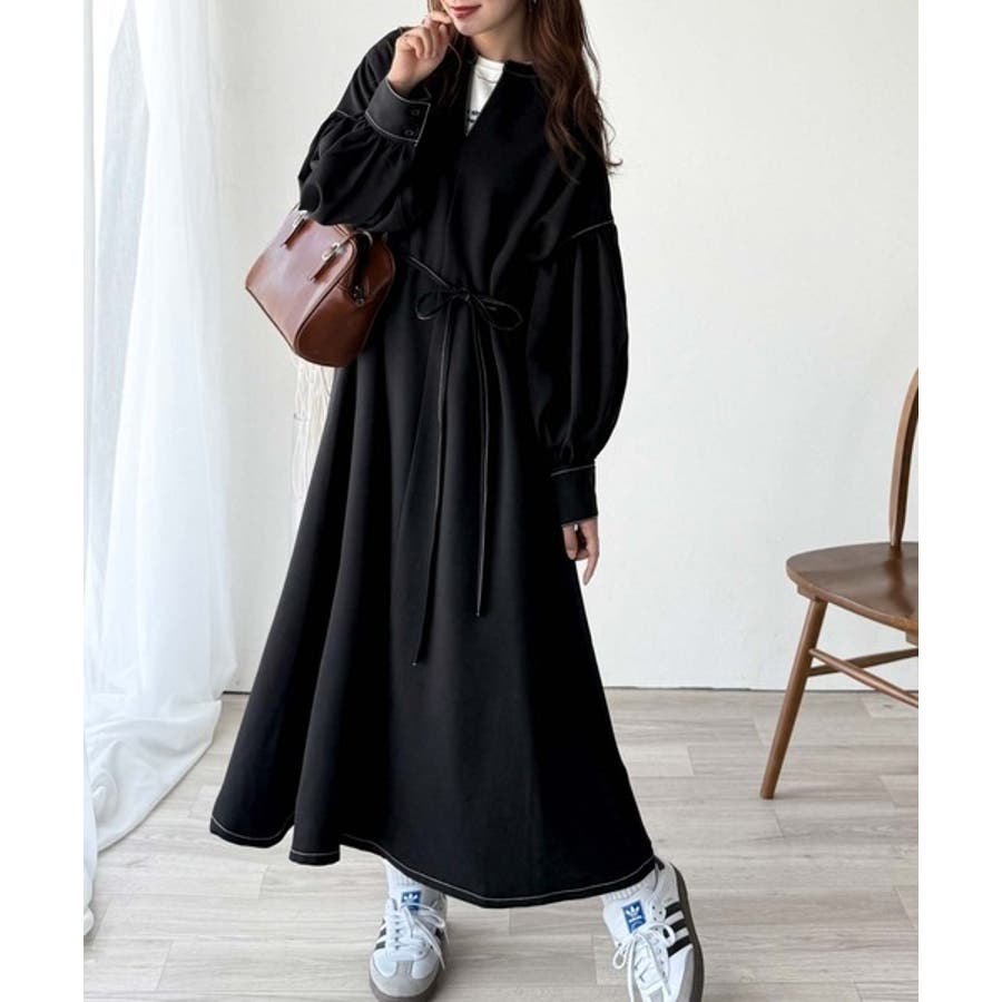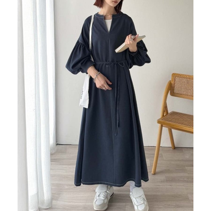 ぽわんとあざとく。ウエストリボン使い配色ステッチキーネックワンピース(長袖)