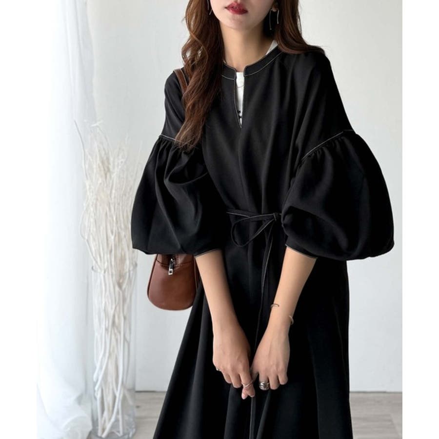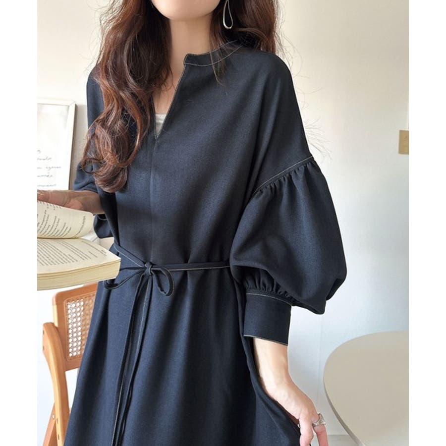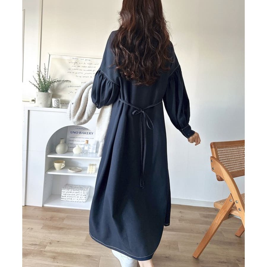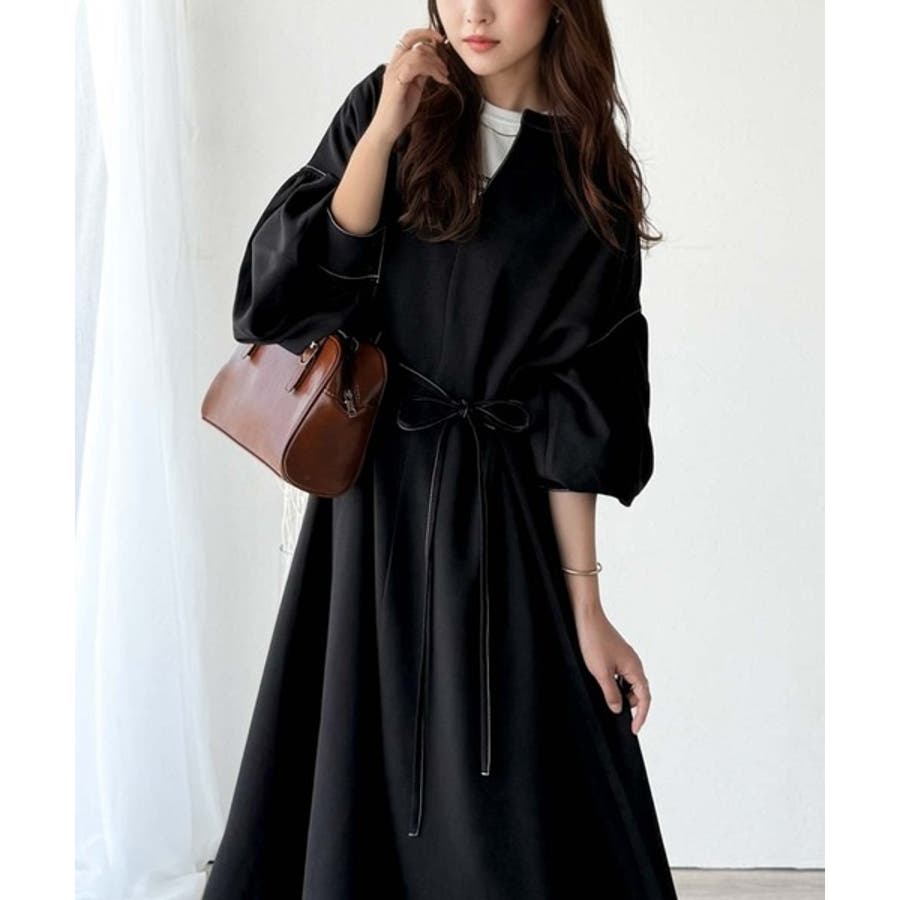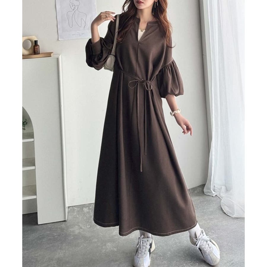 ぽわんとあざとく。ウエストリボン使い配色ステッチキーネックワンピース(長袖)