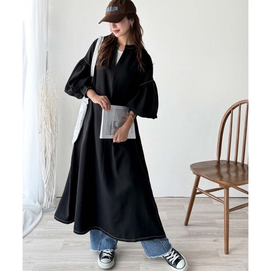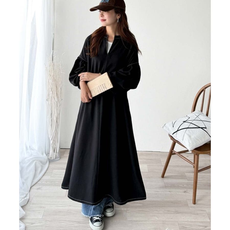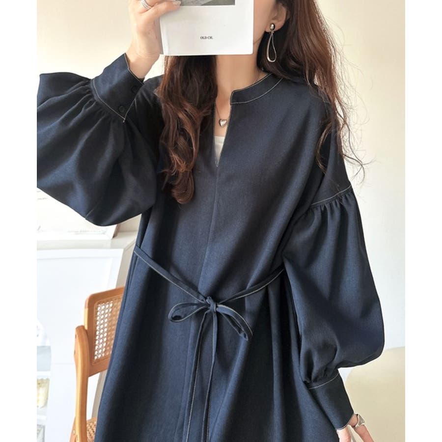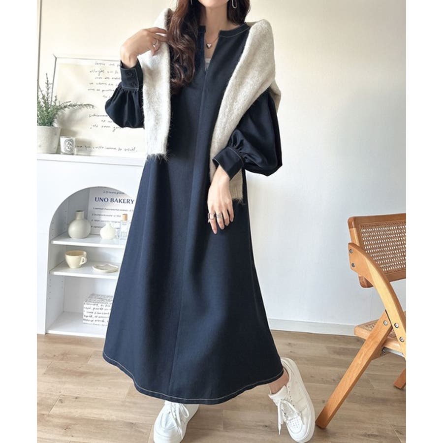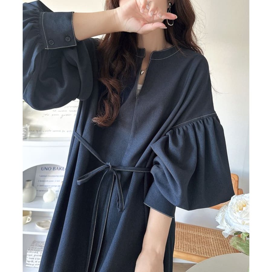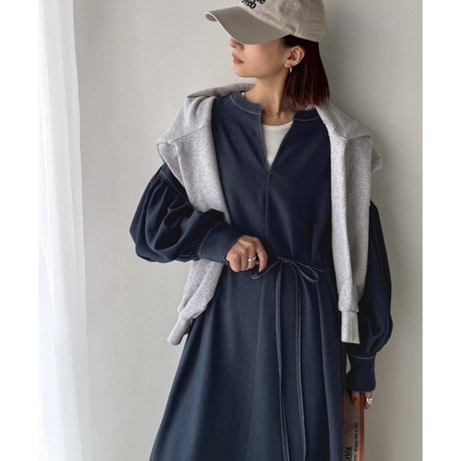 ぽわんとあざとく。ウエストリボン使い配色ステッチキーネックワンピース(長袖)