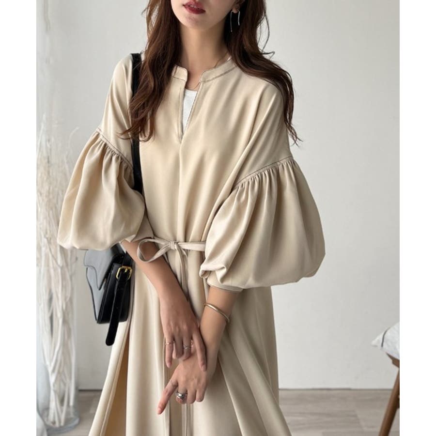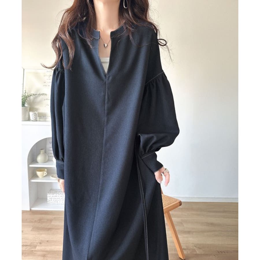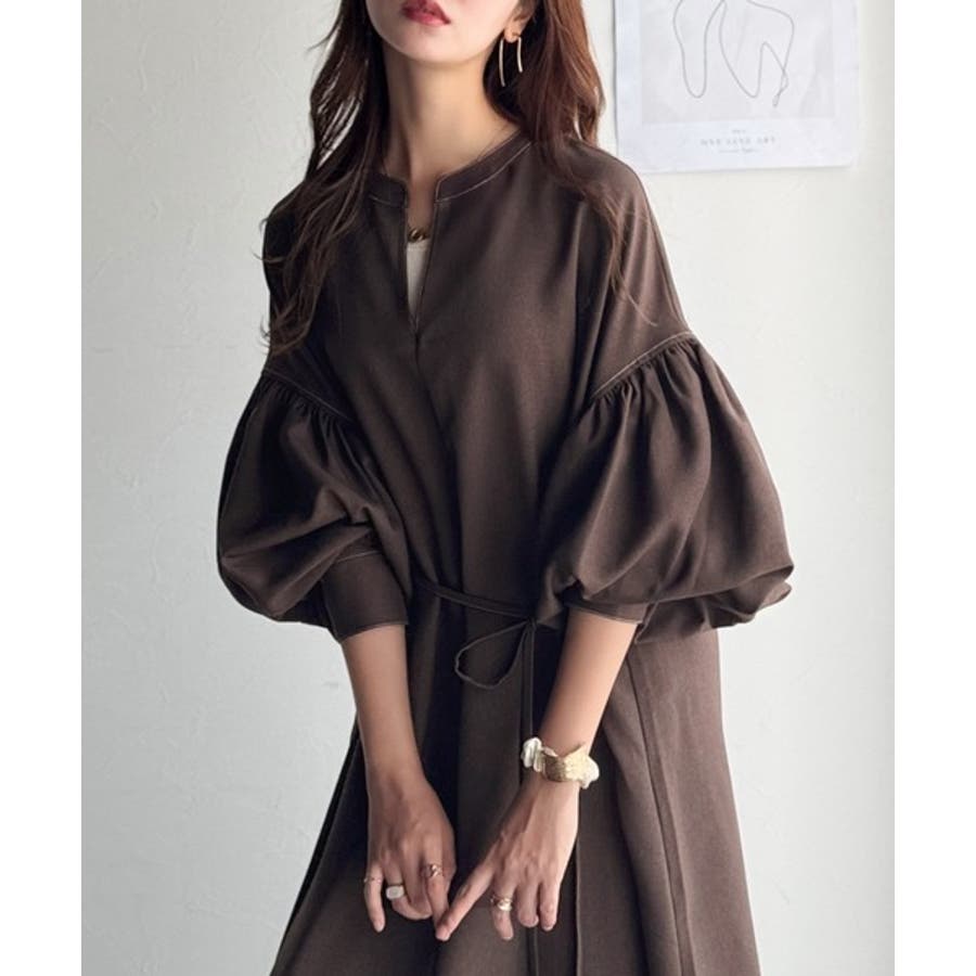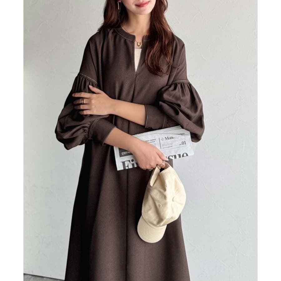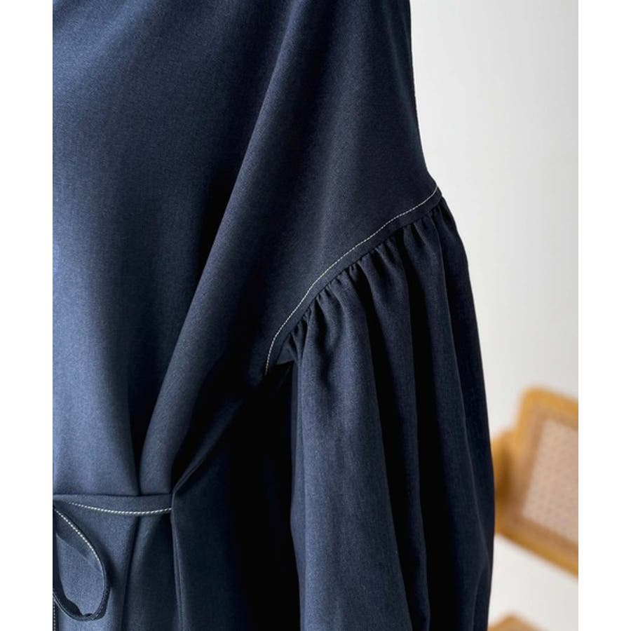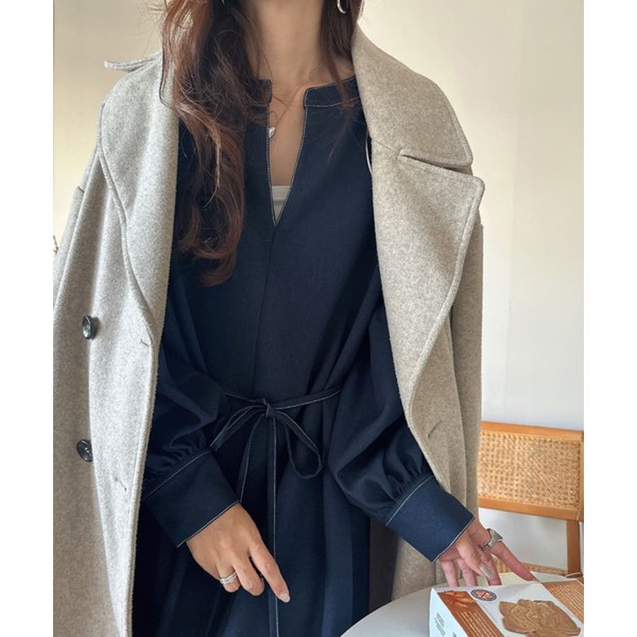 ぽわんとあざとく。ウエストリボン使い配色ステッチキーネックワンピース(長袖)
