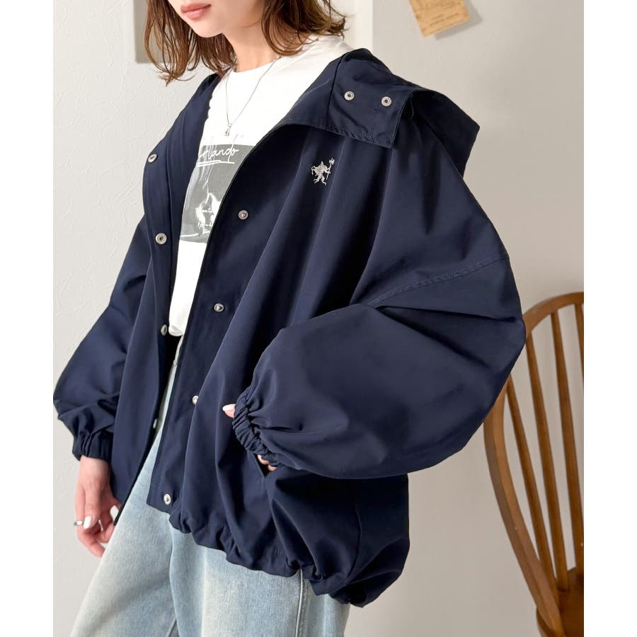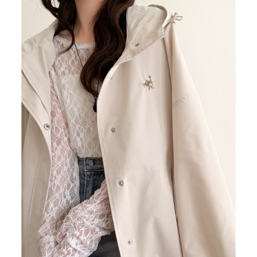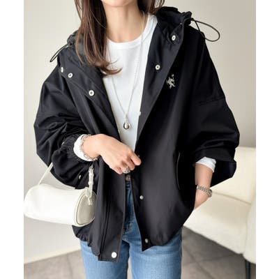 フロントは比翼風スナップでミニマルに、胸元の刺繍がさりげないアクセント。