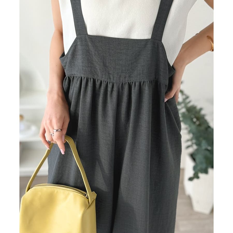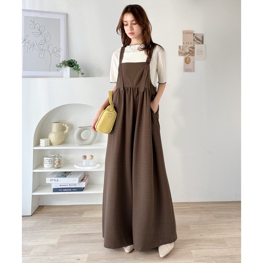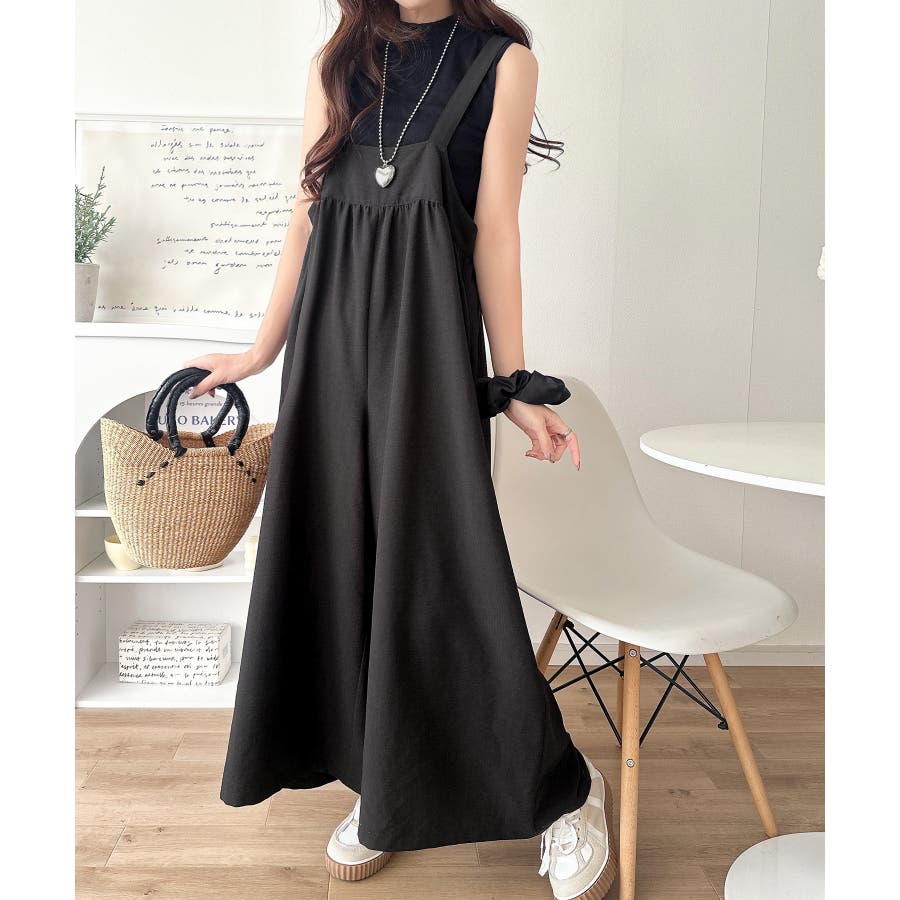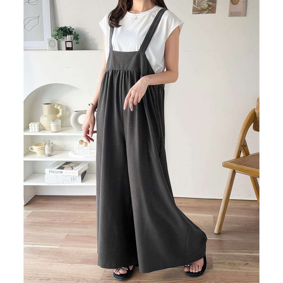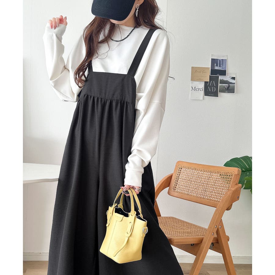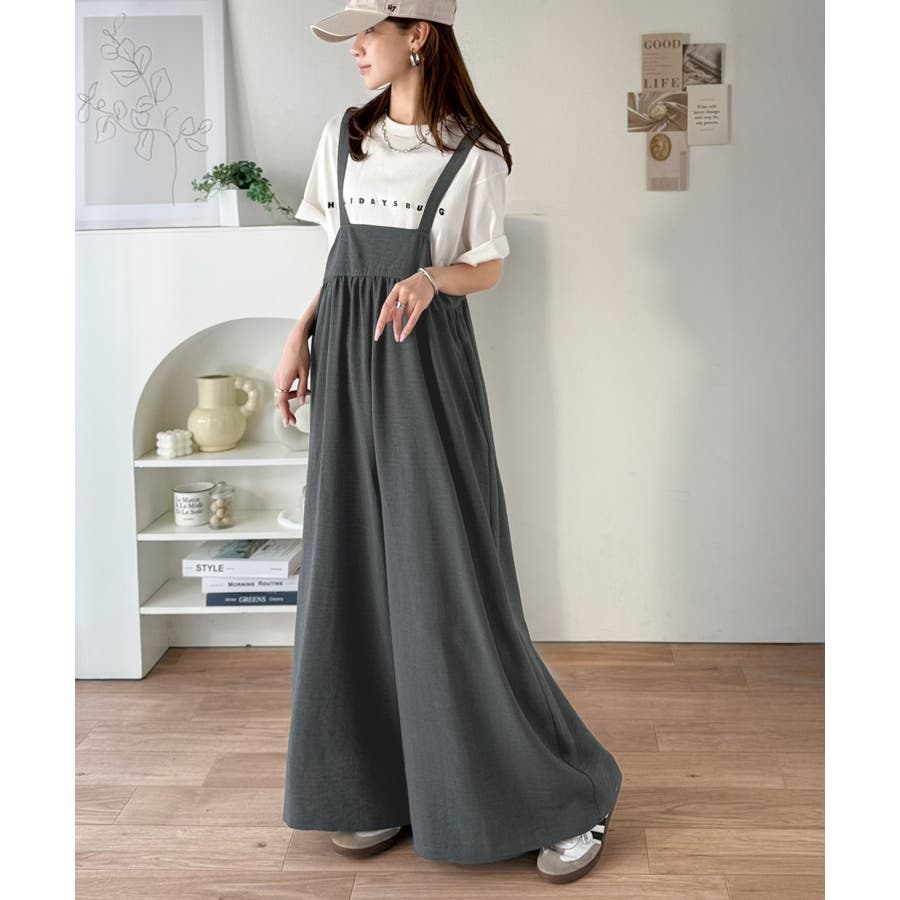 ハイウエストデザインで脚長効果を実現したこのワイドスカパンサロペットは