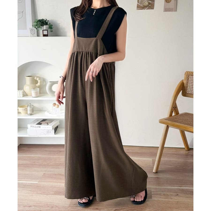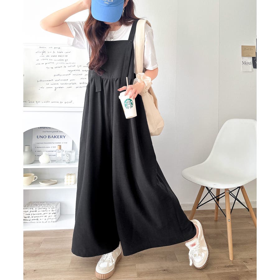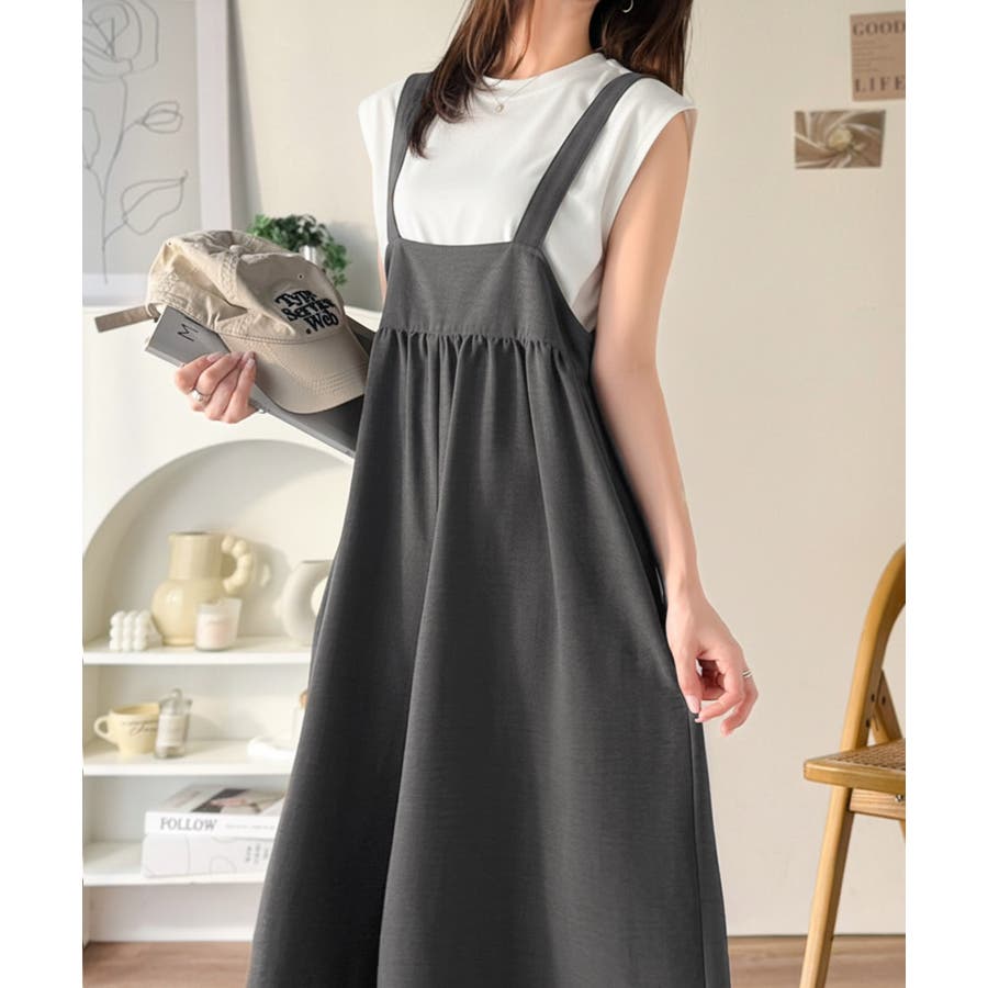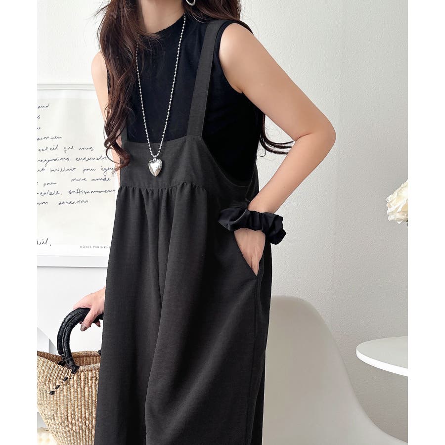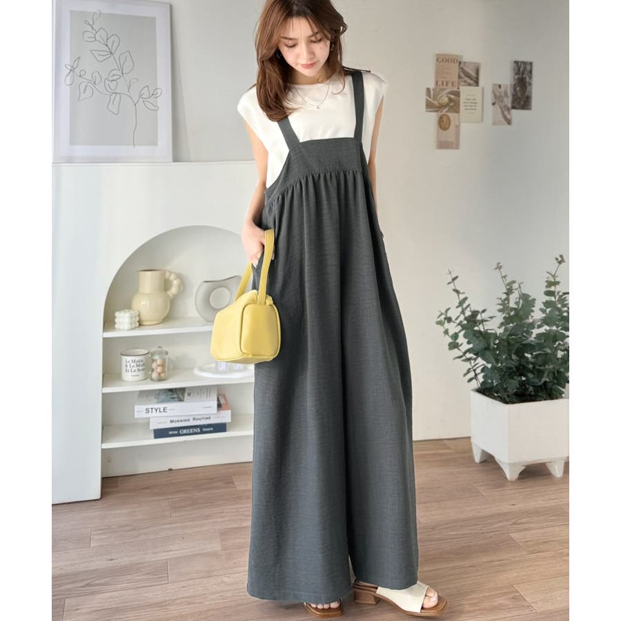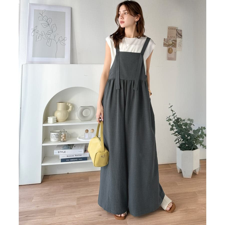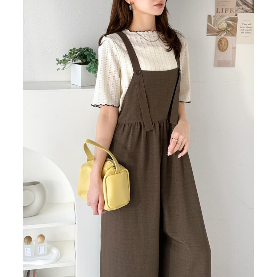 ハイウエストデザインで脚長効果を実現したこのワイドスカパンサロペットは